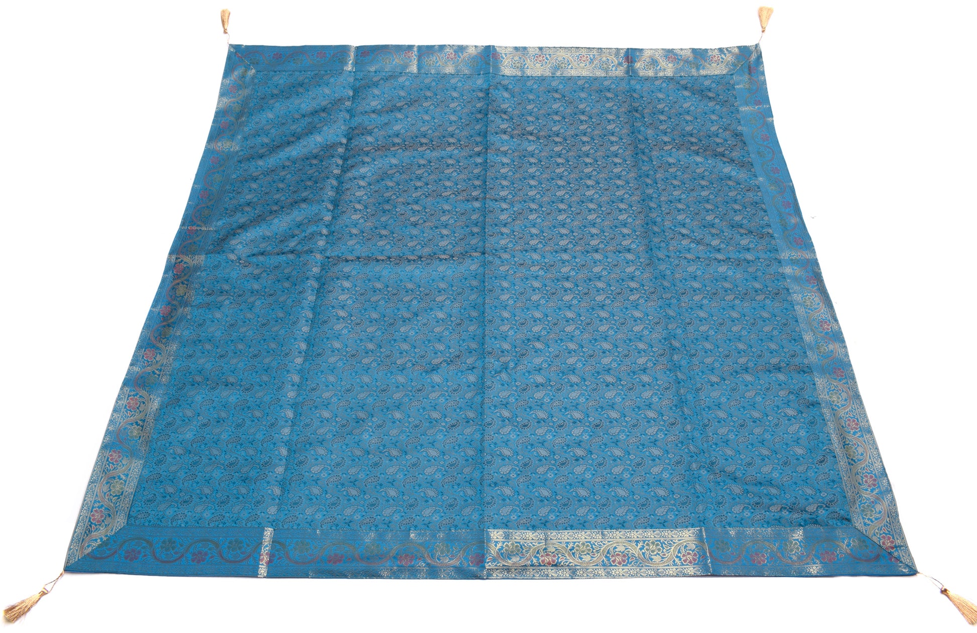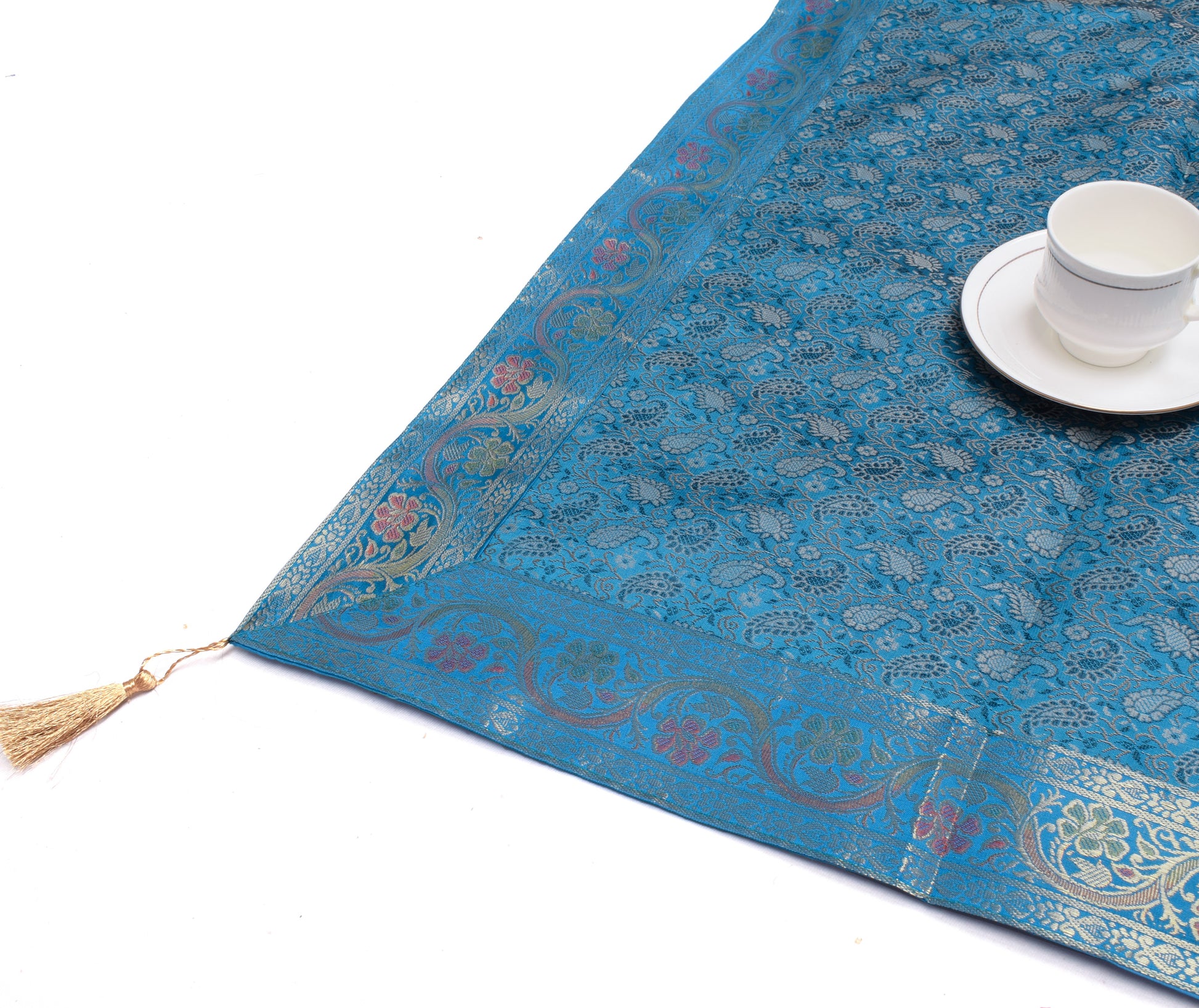 48 Inch Square Table Top Cover Blue Woven Zari Border Silk Brocade Cloth