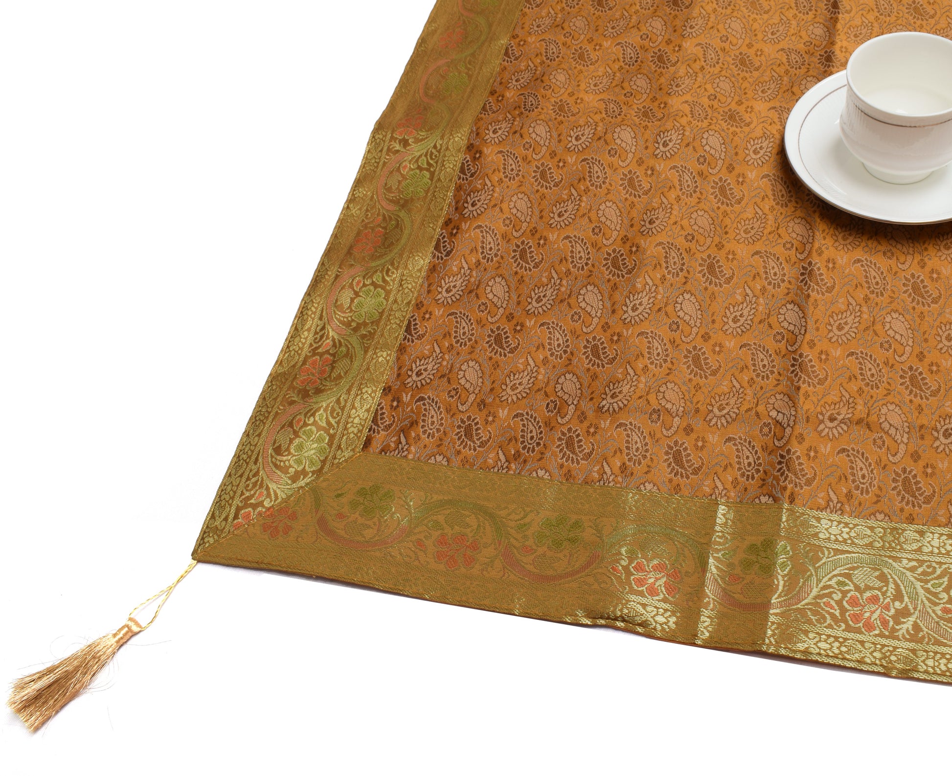 48 Inch Square Table Top Cover Mustard Woven Zari Border Silk Brocade Cloth