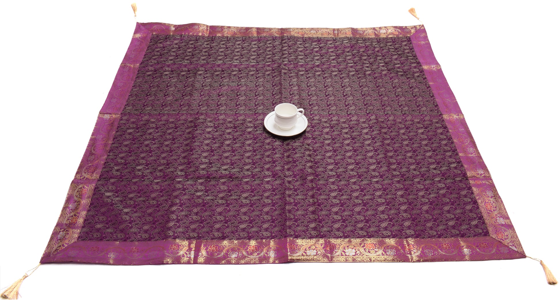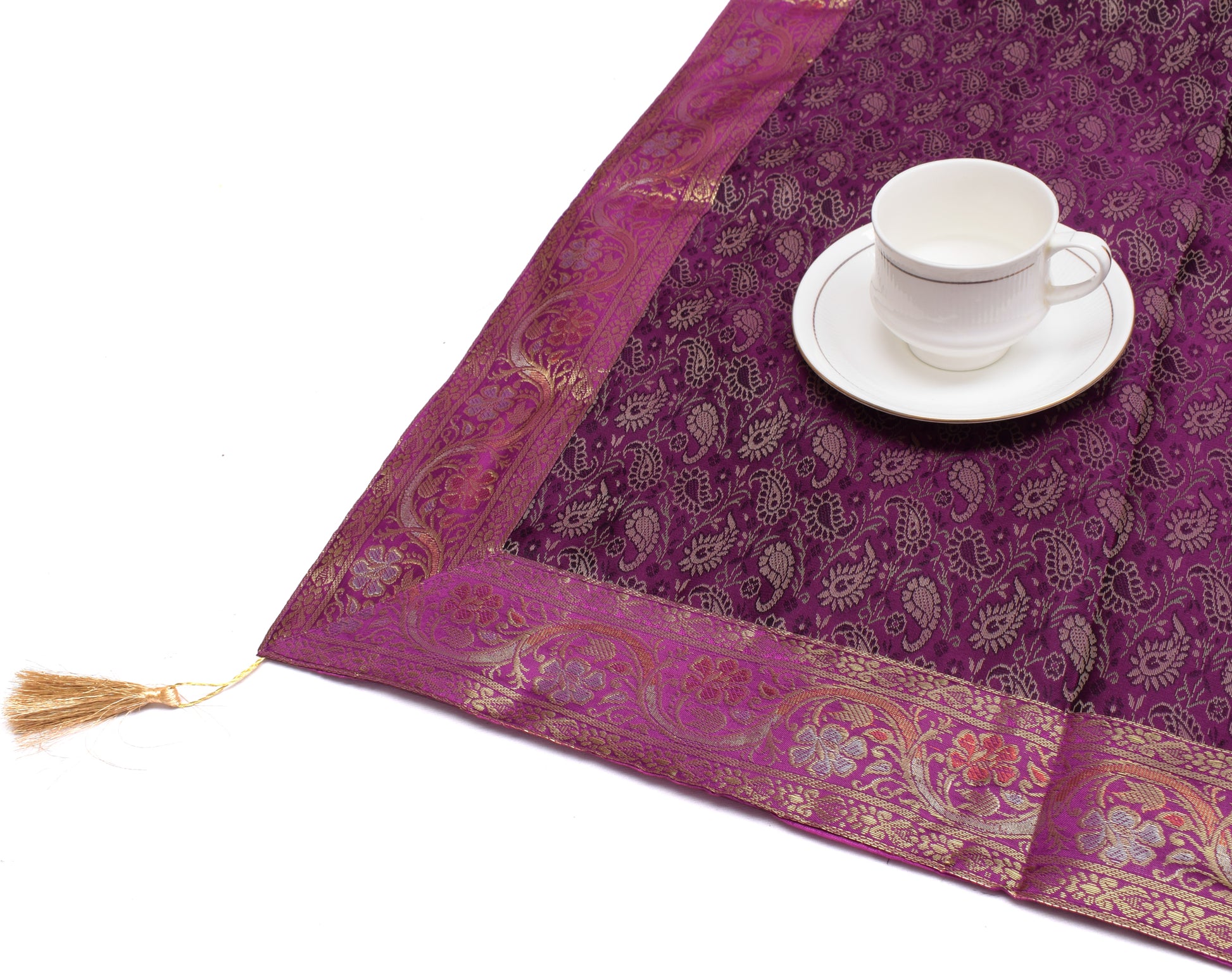 48 Inch Square Table Top Cover Purple Woven Zari Border Silk Brocade Cloth
