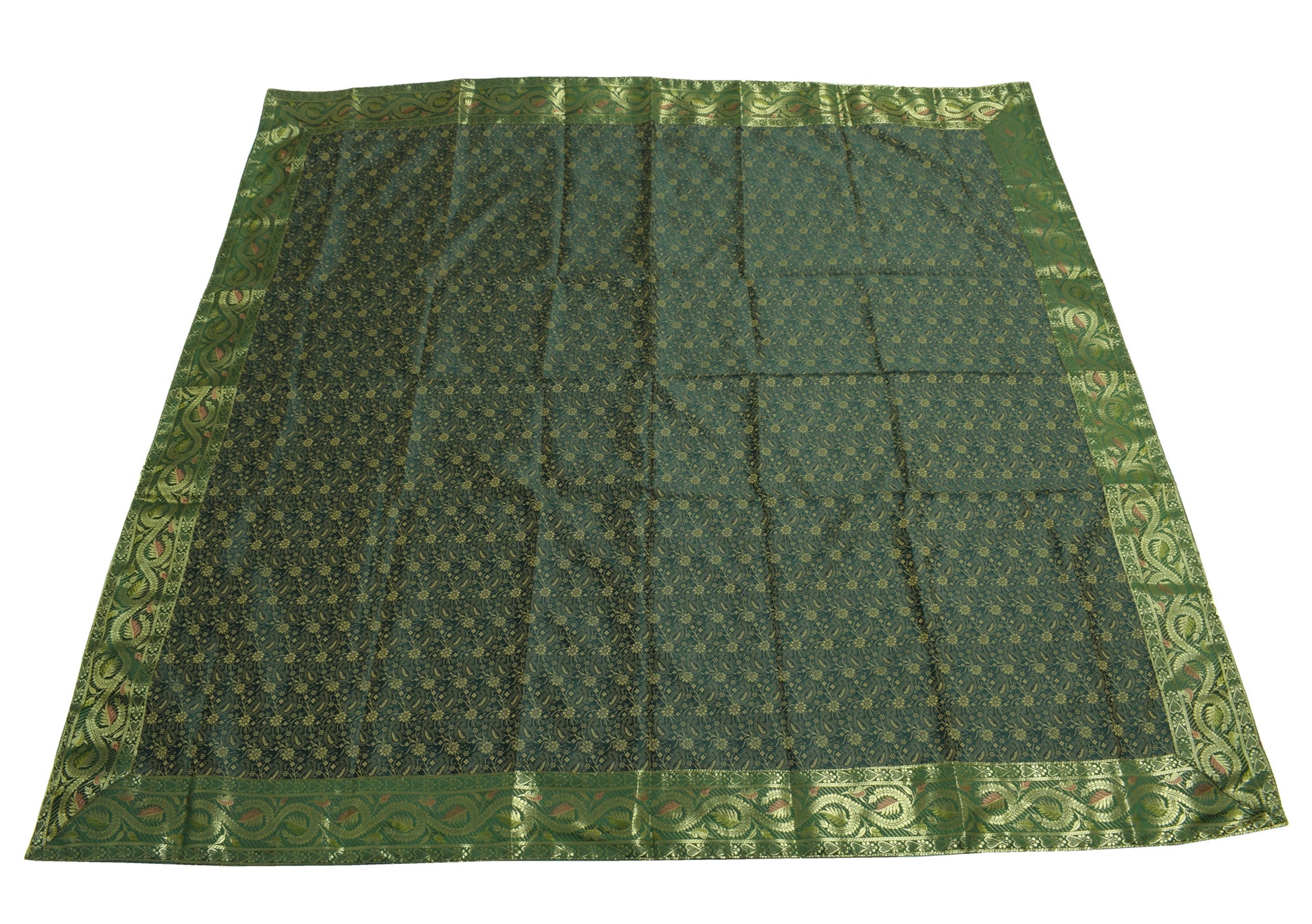 48 Inch Square Table Top Cover Dark Green Woven Zari Border Silk Brocade Cloth