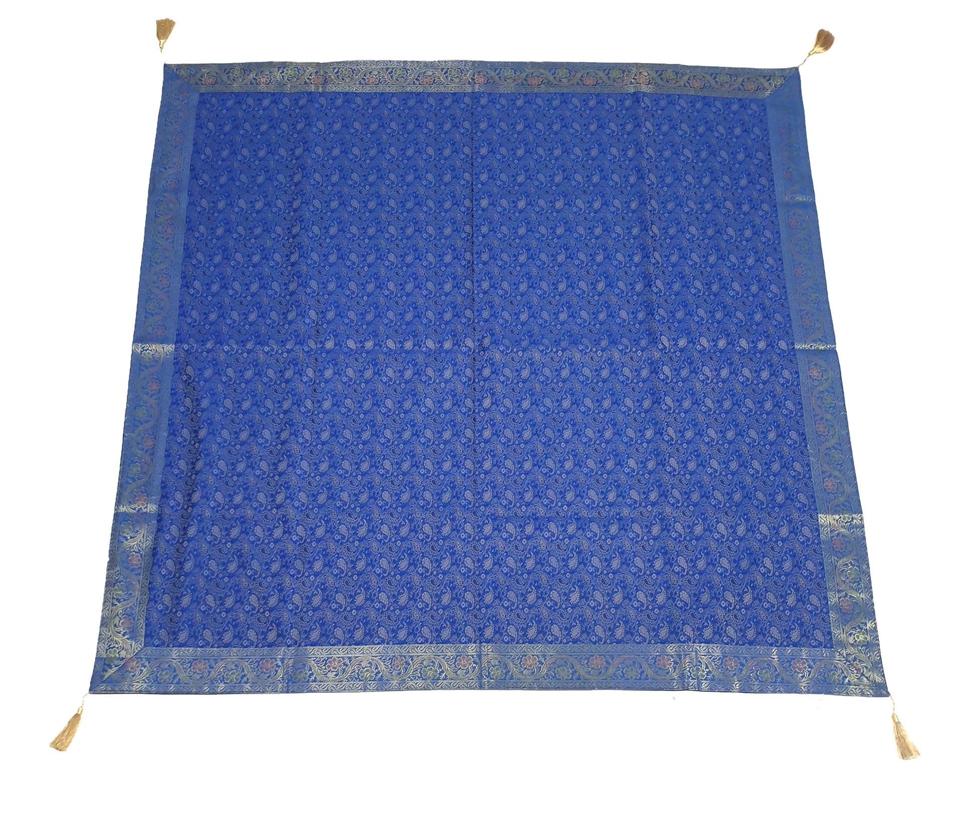 Banarasi Vastra Presents 48 Inch x 48 Inch Woven Golden Zari Brocade Banarasi Silk Table Cover with Woven Paisley Pattern Tanchoi Fabric in the center Part of the cover with all Side Floral Zari Woven Border with 4 side Golden Zari Tassel. this Cover comes with Matching color Back lining fabric.