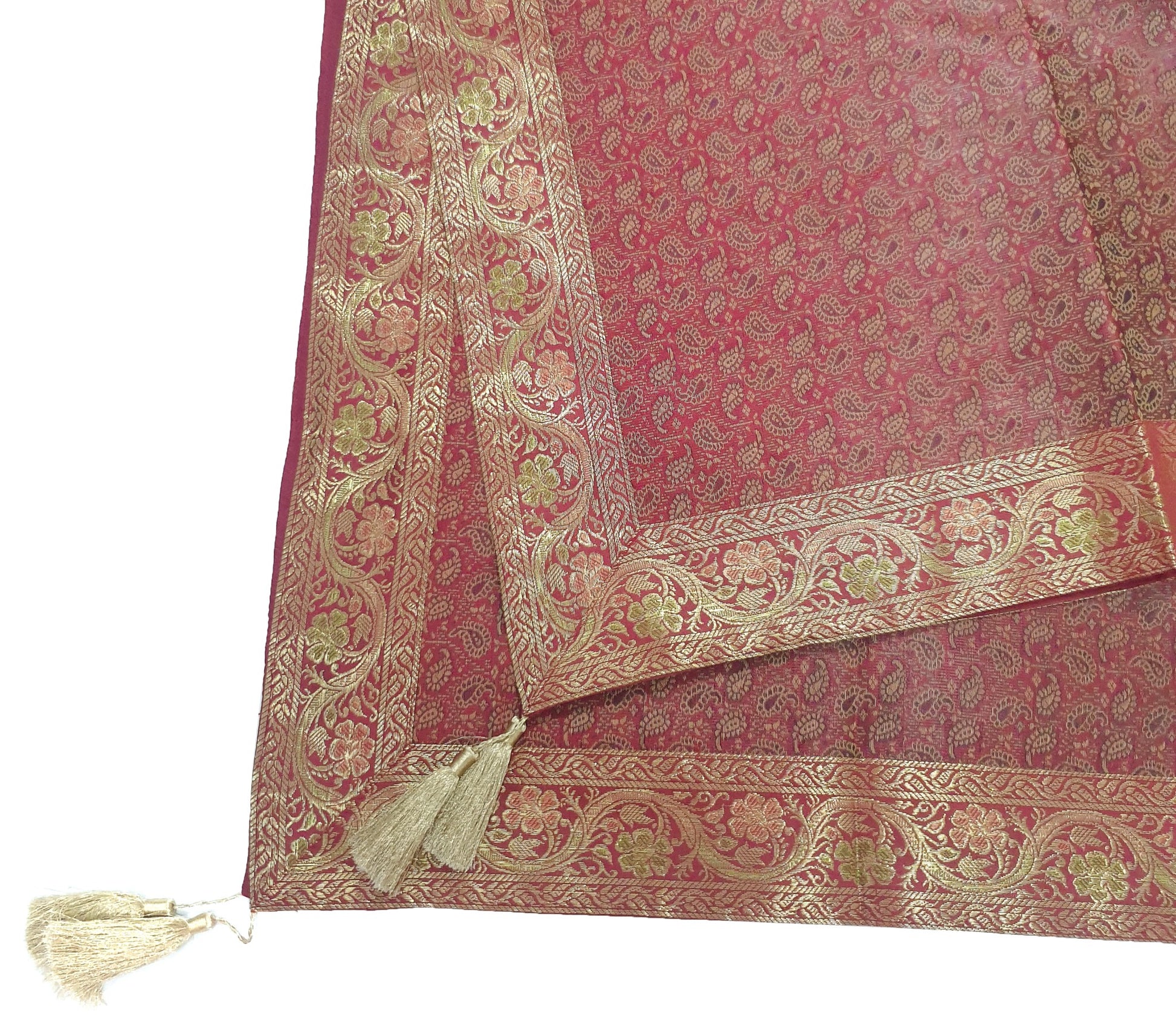 Banarasi Vastra Presents 48 Inch x 48 Inch Woven Golden Zari Brocade Banarasi Silk Table Cover with Woven Paisley Pattern Tanchoi Fabric in the center Part of the cover with all Side Floral Zari Woven Border with 4 side Golden Zari Tassel. this Cover comes with Matching color Back lining fabric.