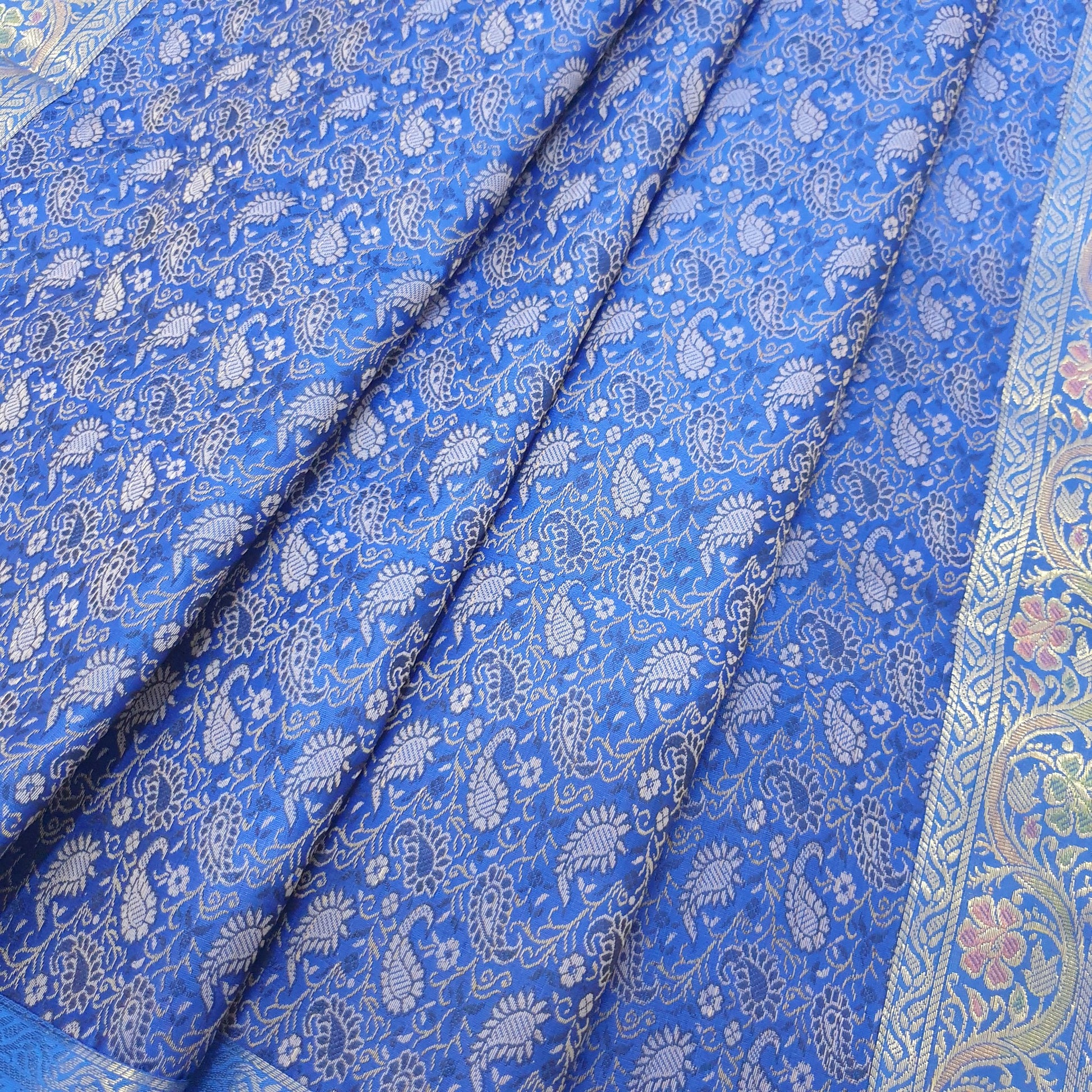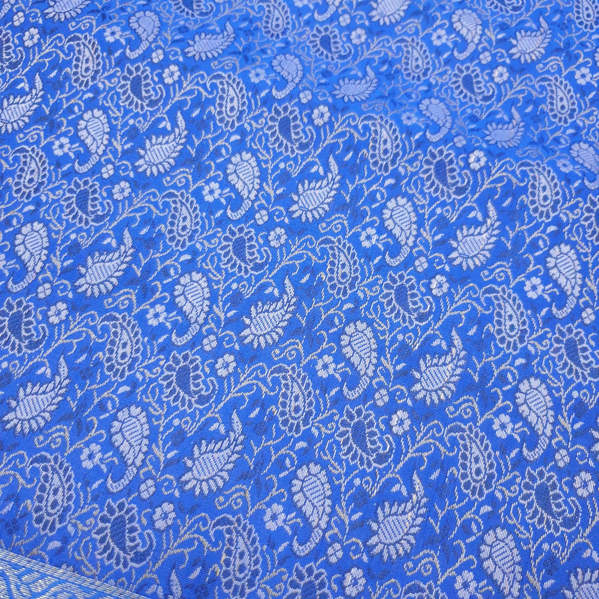 90"x48" Banarasi Dining Table Top Cover Indian Blue Silk Woven Paisley Cloth