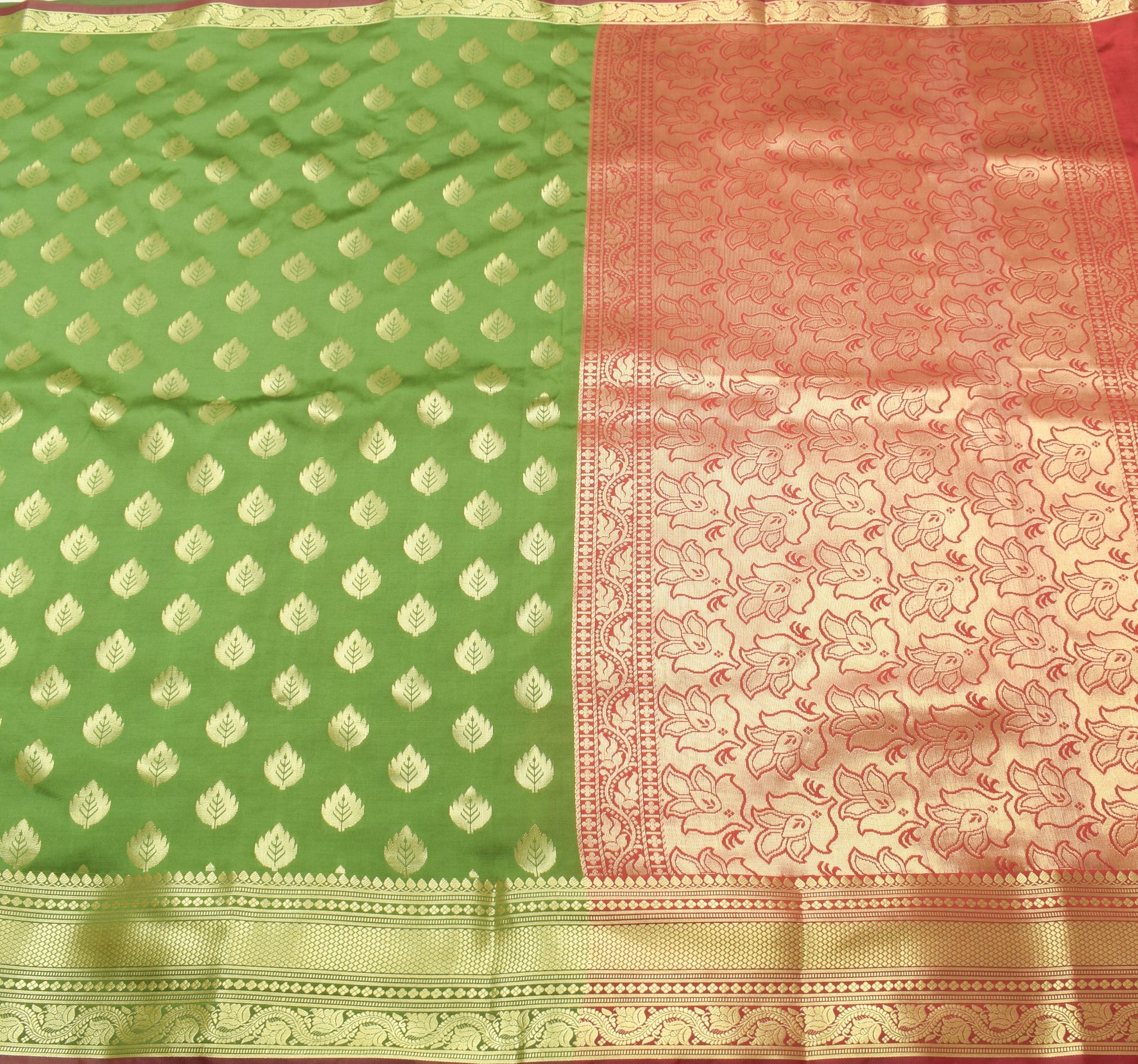 - Color: Henna Green & Maroon Border Pallu