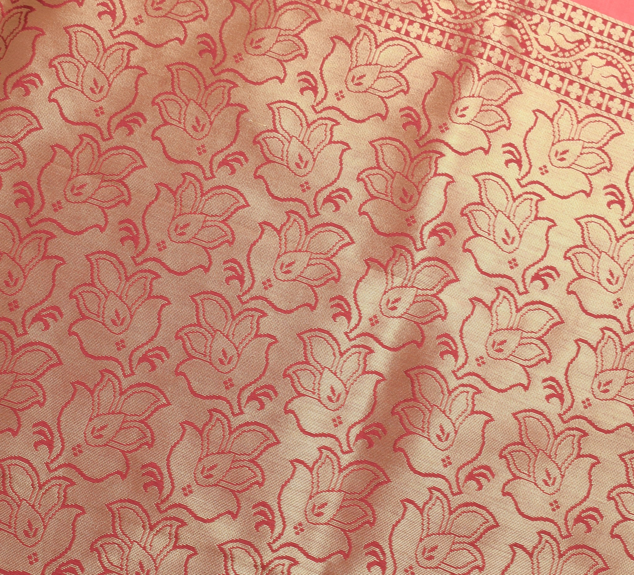 Banarasi Art Silk Saree with Blouse Fabric Coral Pink Leaves Gold Zari Weaving