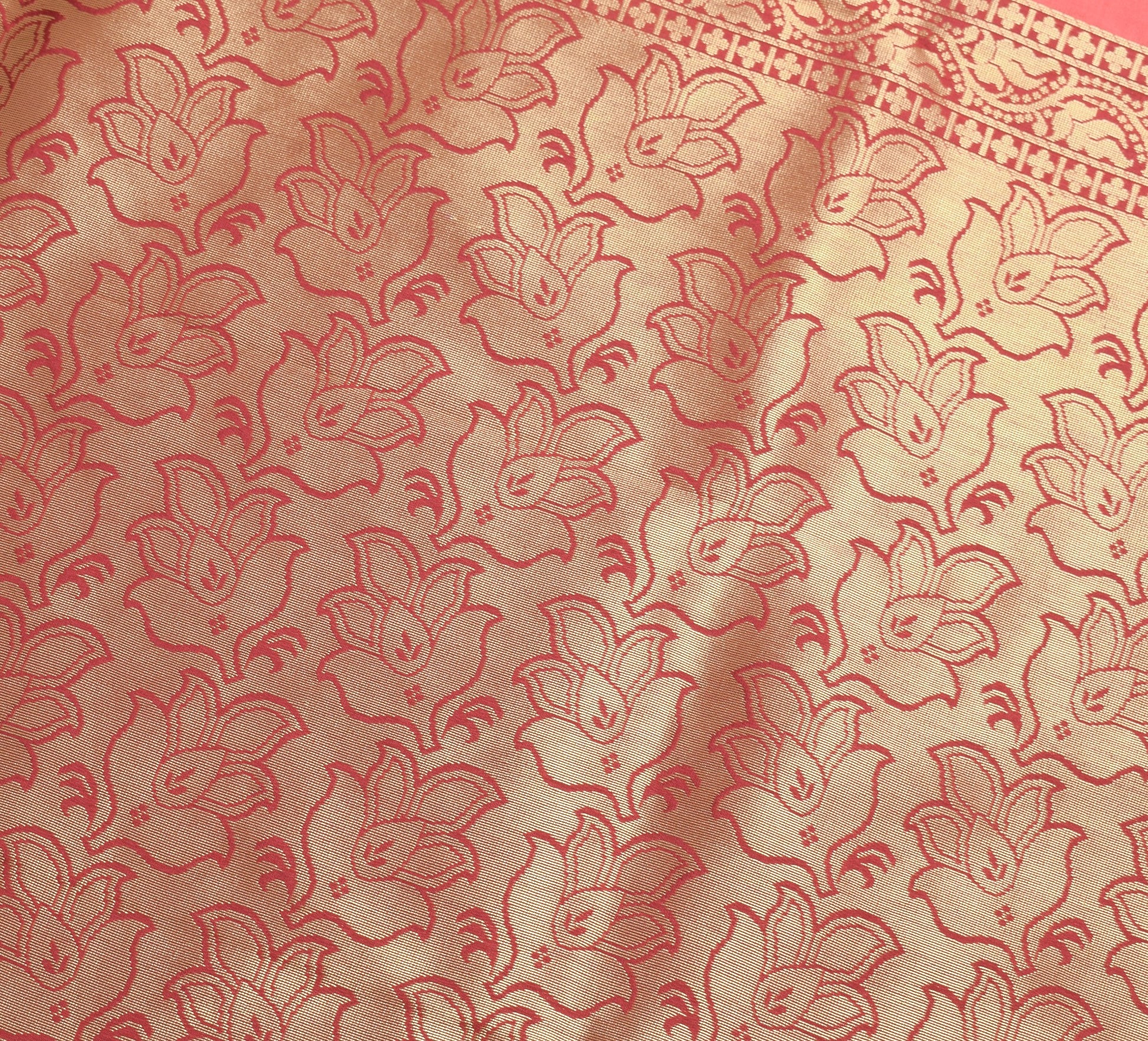 - Color: Coral Pink & Maroon Border Pallu