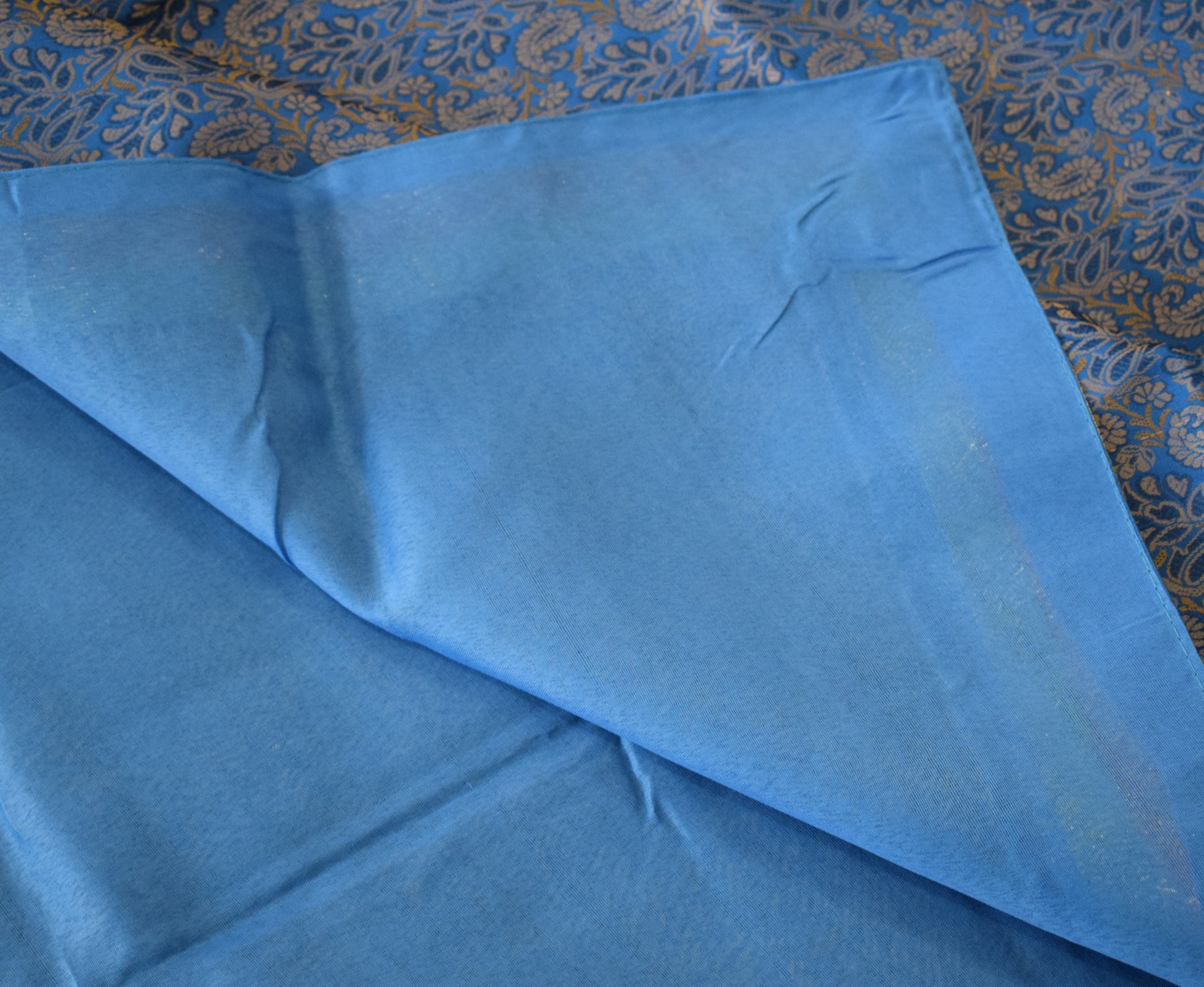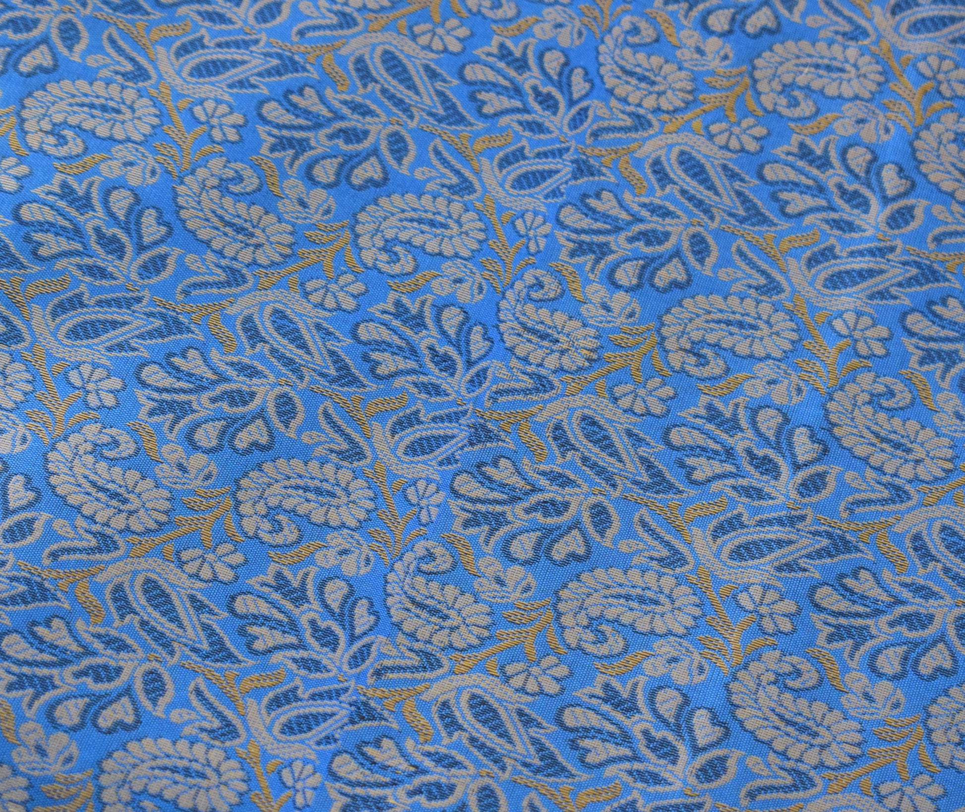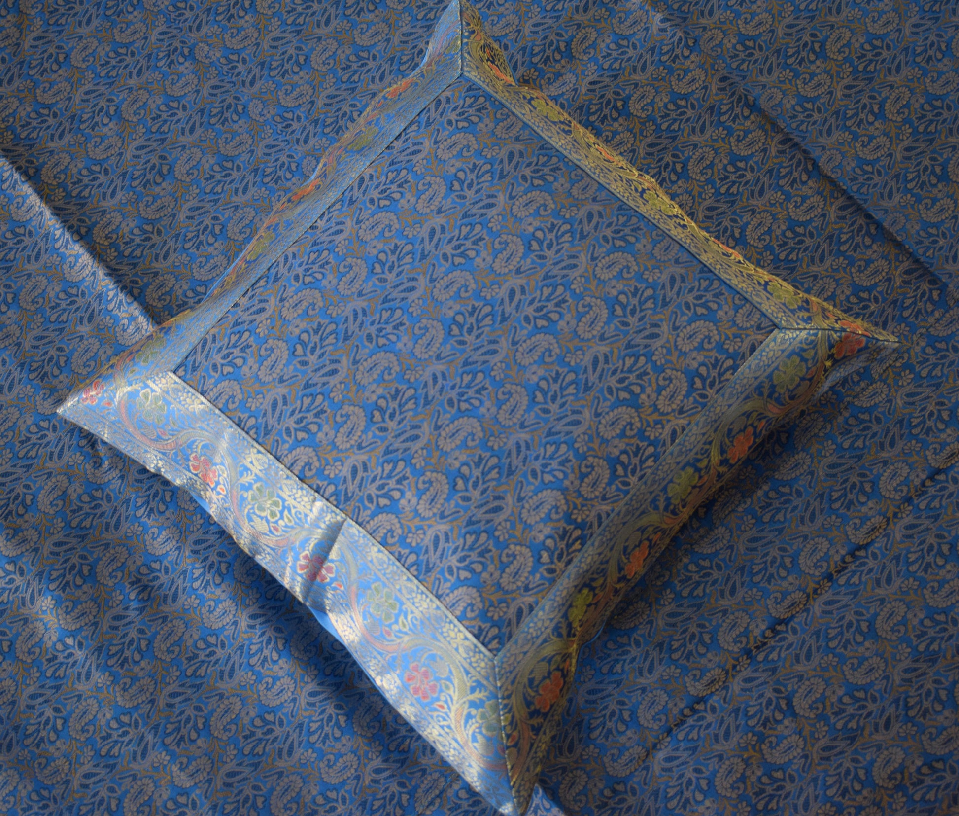This is a Patch Work Bed Cover Set in Art or Artificial Silk Fabric with all side Banarasi Silk Woven Golden Silk Brocade Border, this Bed Cover comes with Matching color Back lining fabric with Hidden Zip which allow you to insert the Blanket in Bed Cover and Pillow in the Cushion Cover & Pillow Cover . The base color of the cover is Dark Sky Blue Color Border & Art or Artificial Silk fabric.