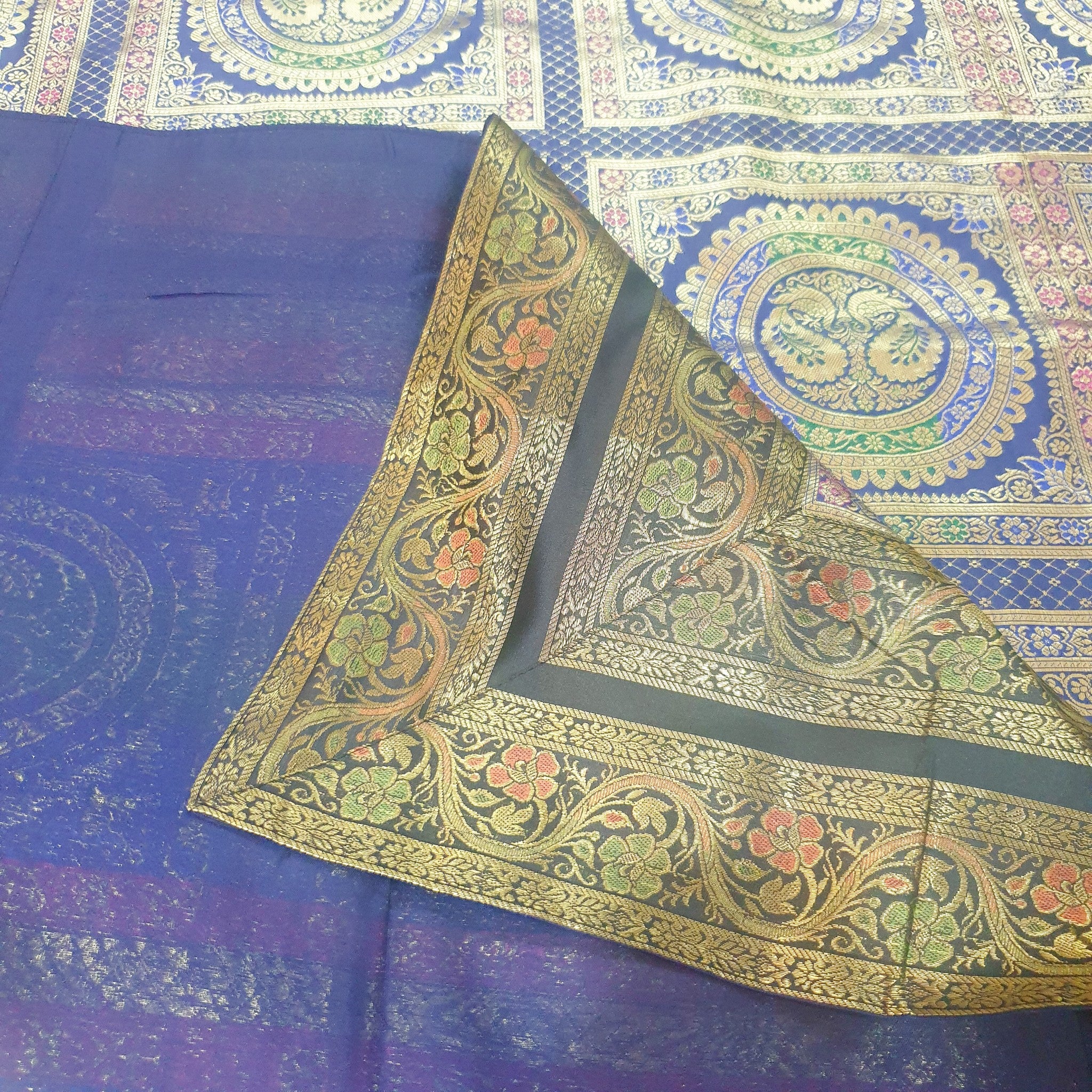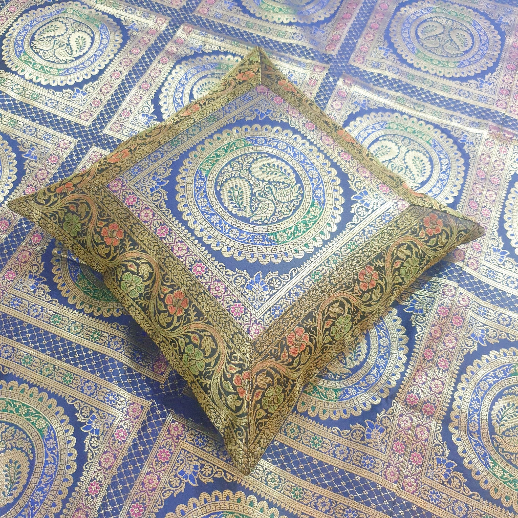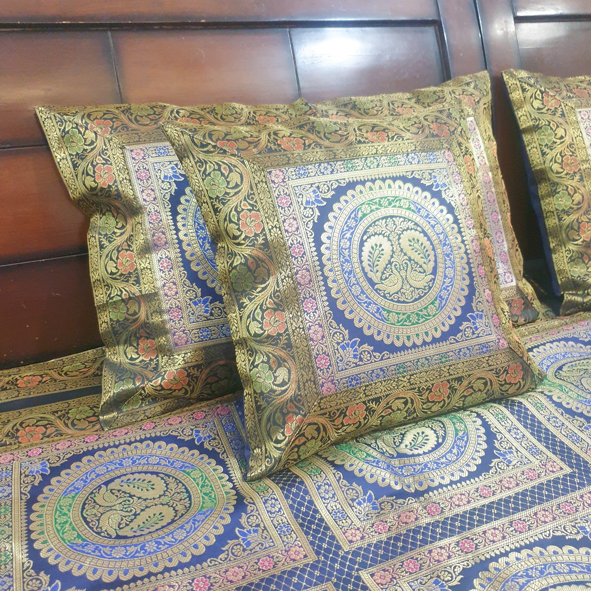 Banarasi Bed Cushion & Pillow Cover Dark Blue Peacock Set Silk & Woven Brocade