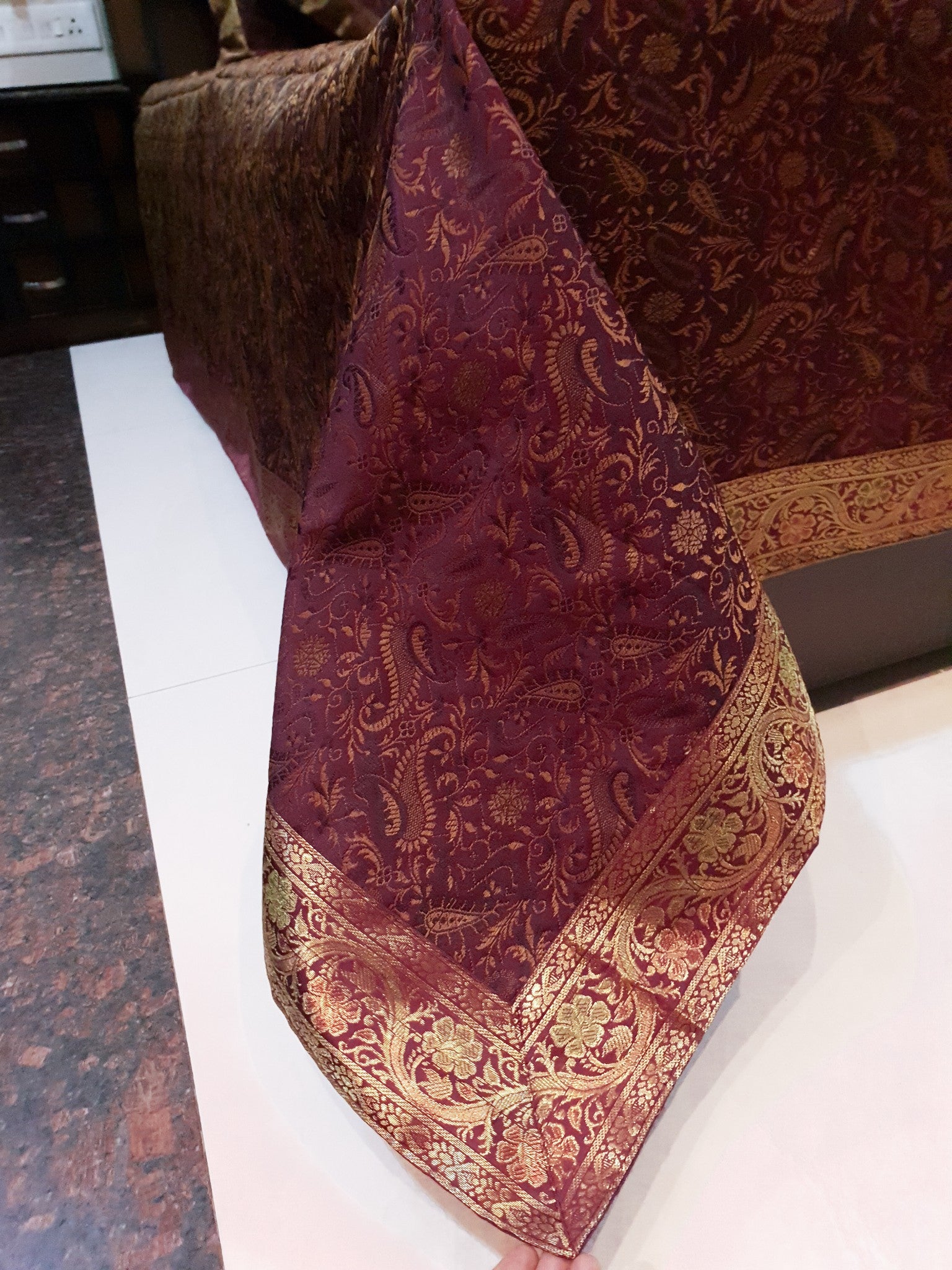 This is a Patch Work Bed Cover Set in Art Silk Fabric with all side Banarasi Silk Woven Golden Zari Brocade Border, this Bed Cover comes with Matching color Back lining fabric with Hidden Zip which allow you to insert the Blanket in Bed Cover and Pillow in the Cushion Cover & Pillow Cover . The base color of the cover is Wine.
