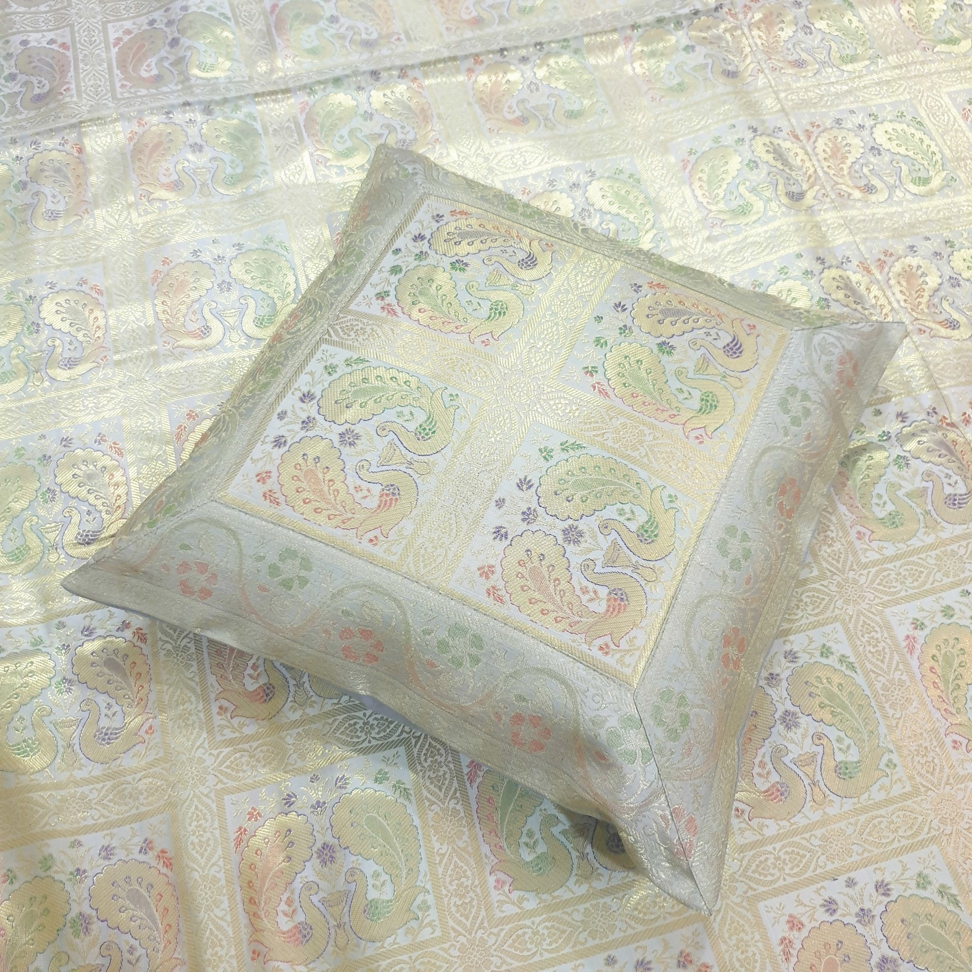 Banarasi Bed Cushion & Pillow Cover Silk & Woven Zari Brocade Peacock Gray Set