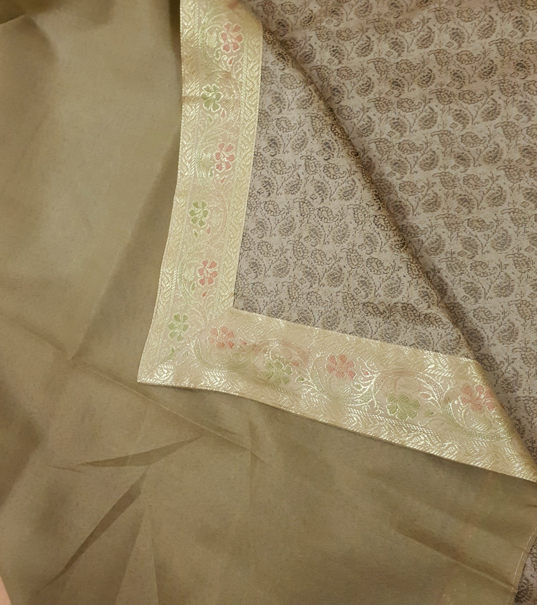 This is a Patch Work Bed Cover Set in Art Silk Fabric with all side Banarasi Silk Woven Golden Zari Brocade Border, this Bed Cover comes with Matching color Back lining fabric with Hidden Zip which allow you to insert the Blanket in Bed Cover and Pillow in the Cushion Cover & Pillow Cover . The base color of the cover is Beige.