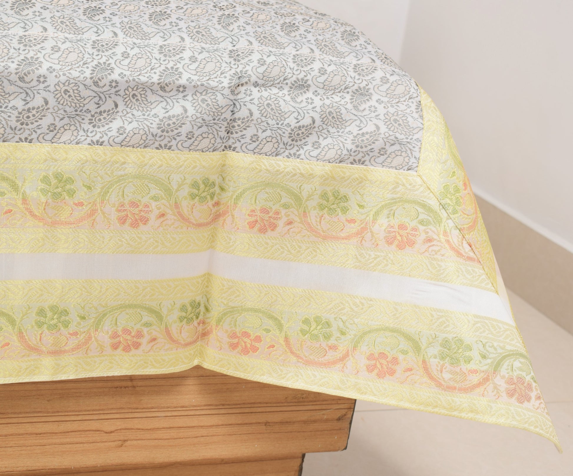 This is a Patch Work Diwan Set in Art Silk Fabric with all side Banarasi Silk Woven Golden Zari Brocade Border, this Diwan Set comes with Matching color Back lining fabric with Hidden Zip which allow you to insert the Blanket in Bed Cover and Pillow in the Cushion Cover & Bolster Cover . The base color of the cover is Gray Color Border & Art or Artificial Silk fabric.