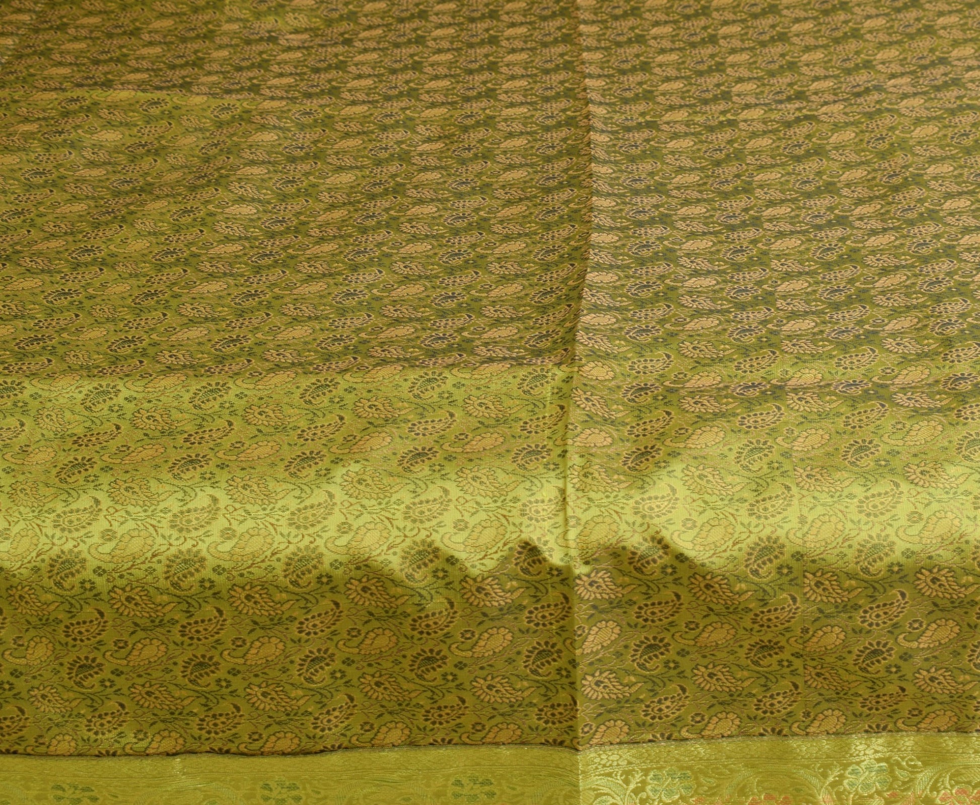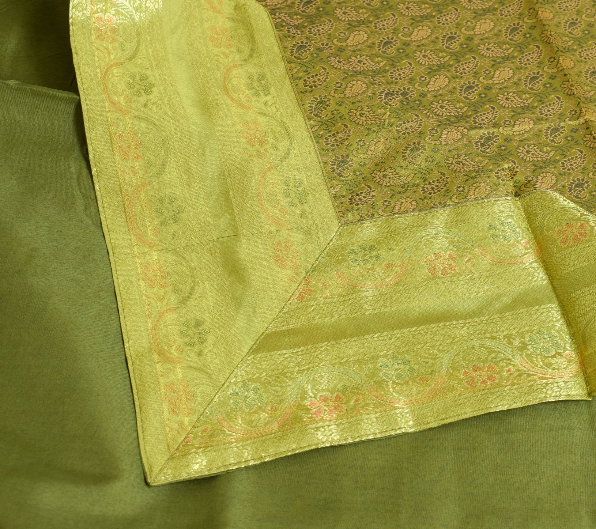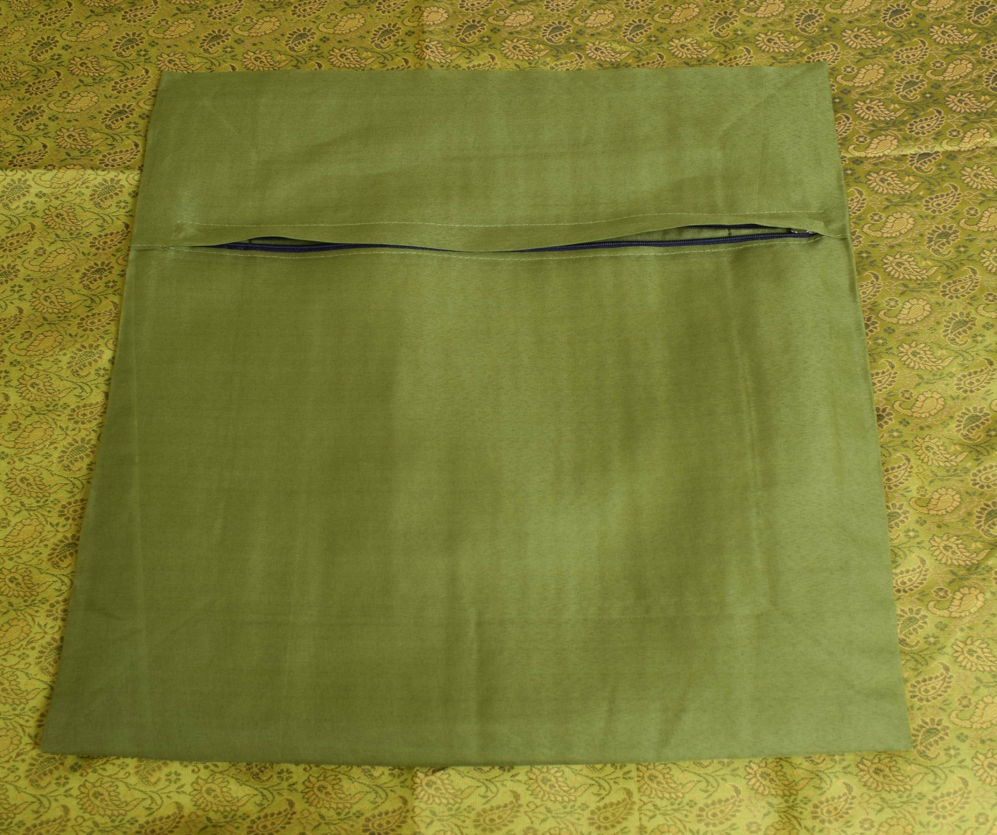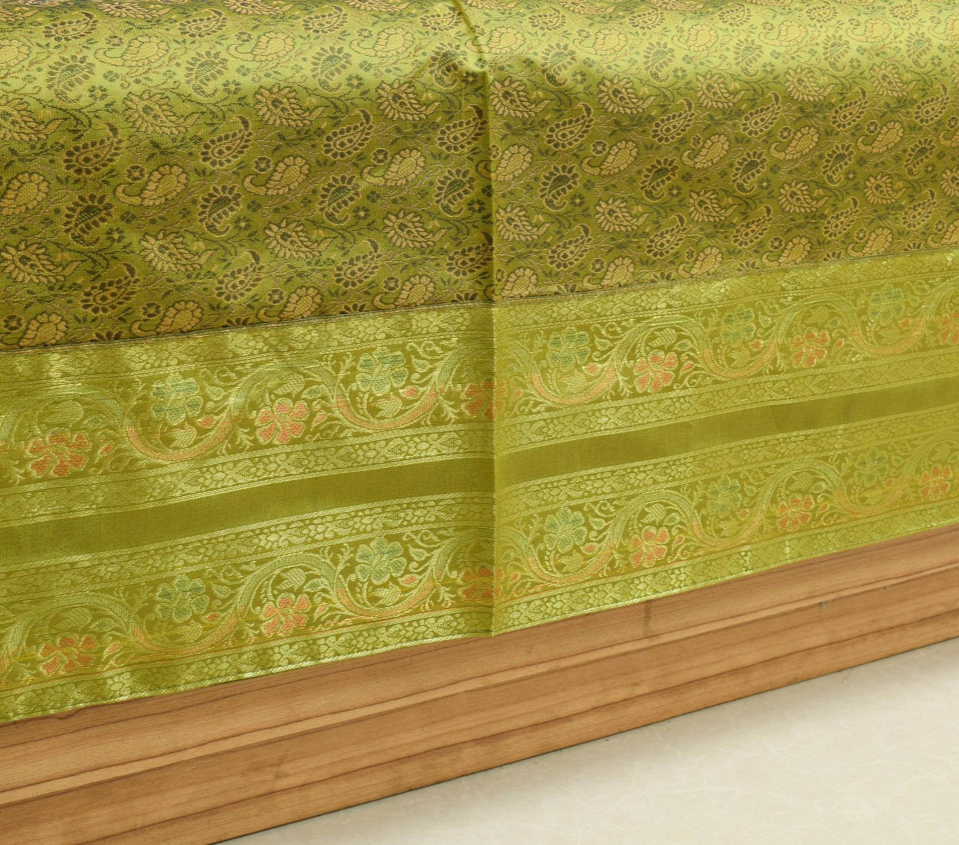 This is a Patch Work Diwan Set in Art Silk Fabric with all side Banarasi Silk Woven Golden Zari Brocade Border, this Diwan Set comes with Matching color Back lining fabric with Hidden Zip which allow you to insert the Blanket in Bed Cover and Pillow in the Cushion Cover & Bolster Cover . The base color of the cover is Green Color Border & Art or Artificial Silk fabric.