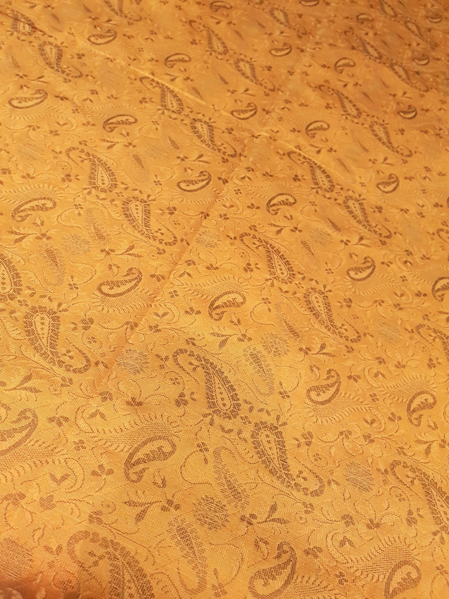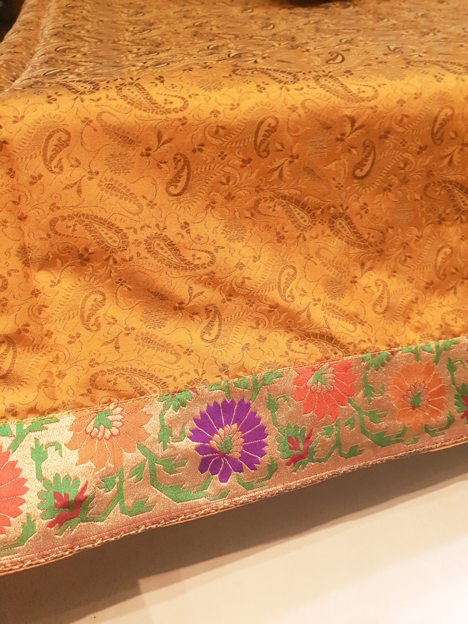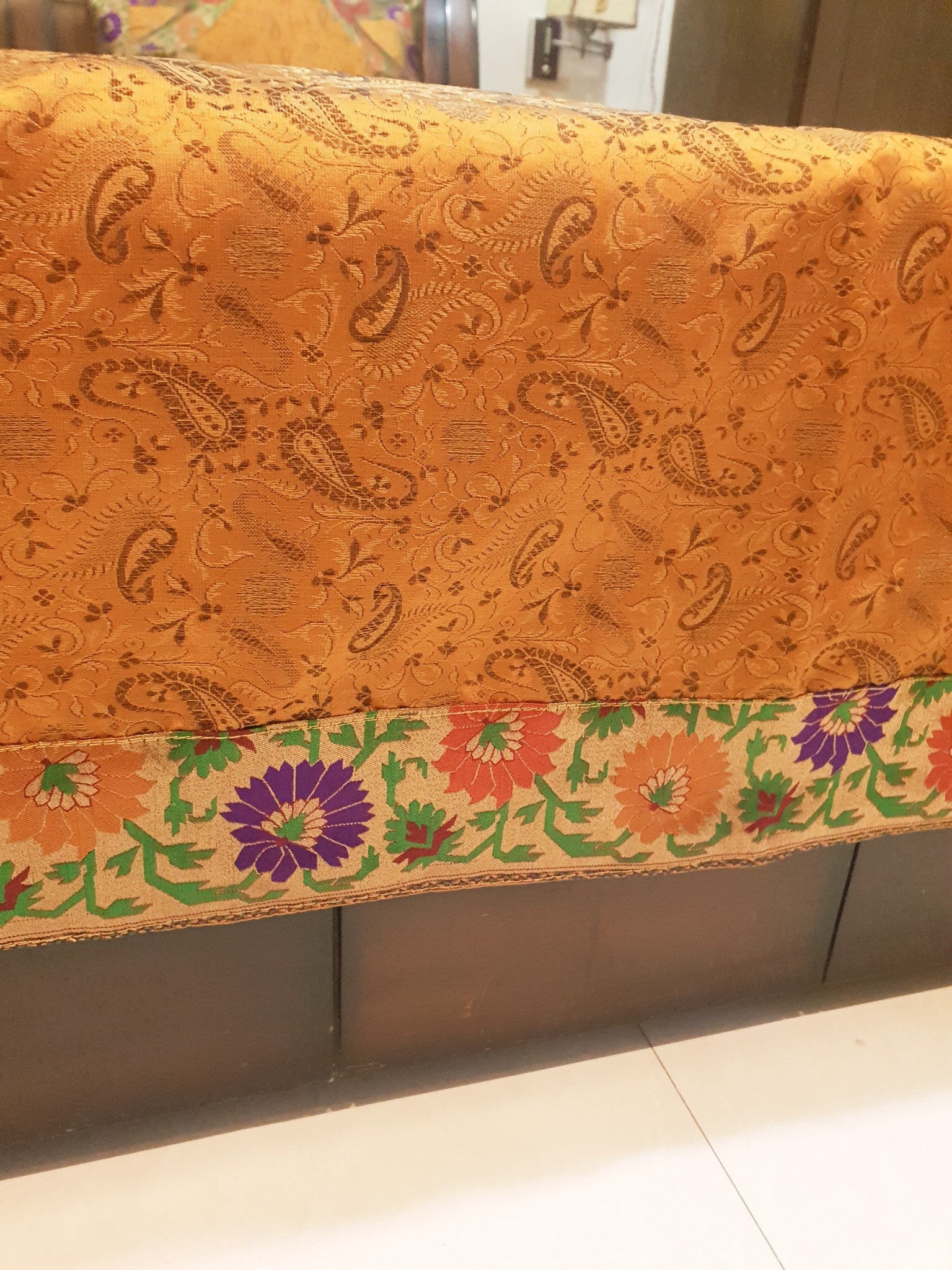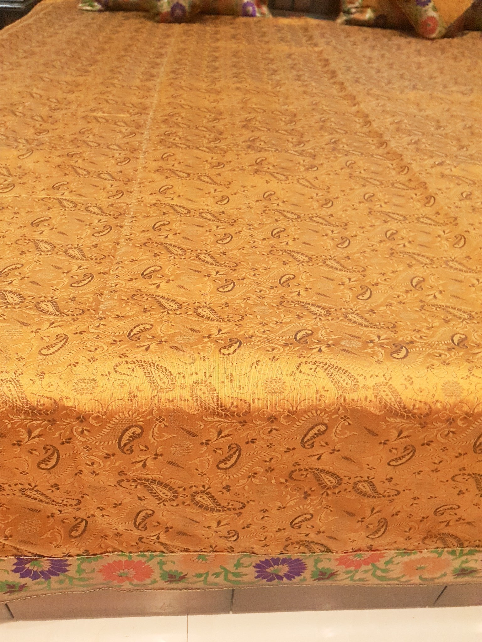 This is a Patch Work Bed Cover Set in Art Silk Fabric with all side Banarasi Silk Woven Golden Zari Brocade Border, this Bed Cover comes with Matching color Back lining fabric with Hidden Zip which allow you to insert the Blanket in Bed Cover and Pillow in the Cushion Cover & Pillow Cover . The base color of the cover is Mustard .