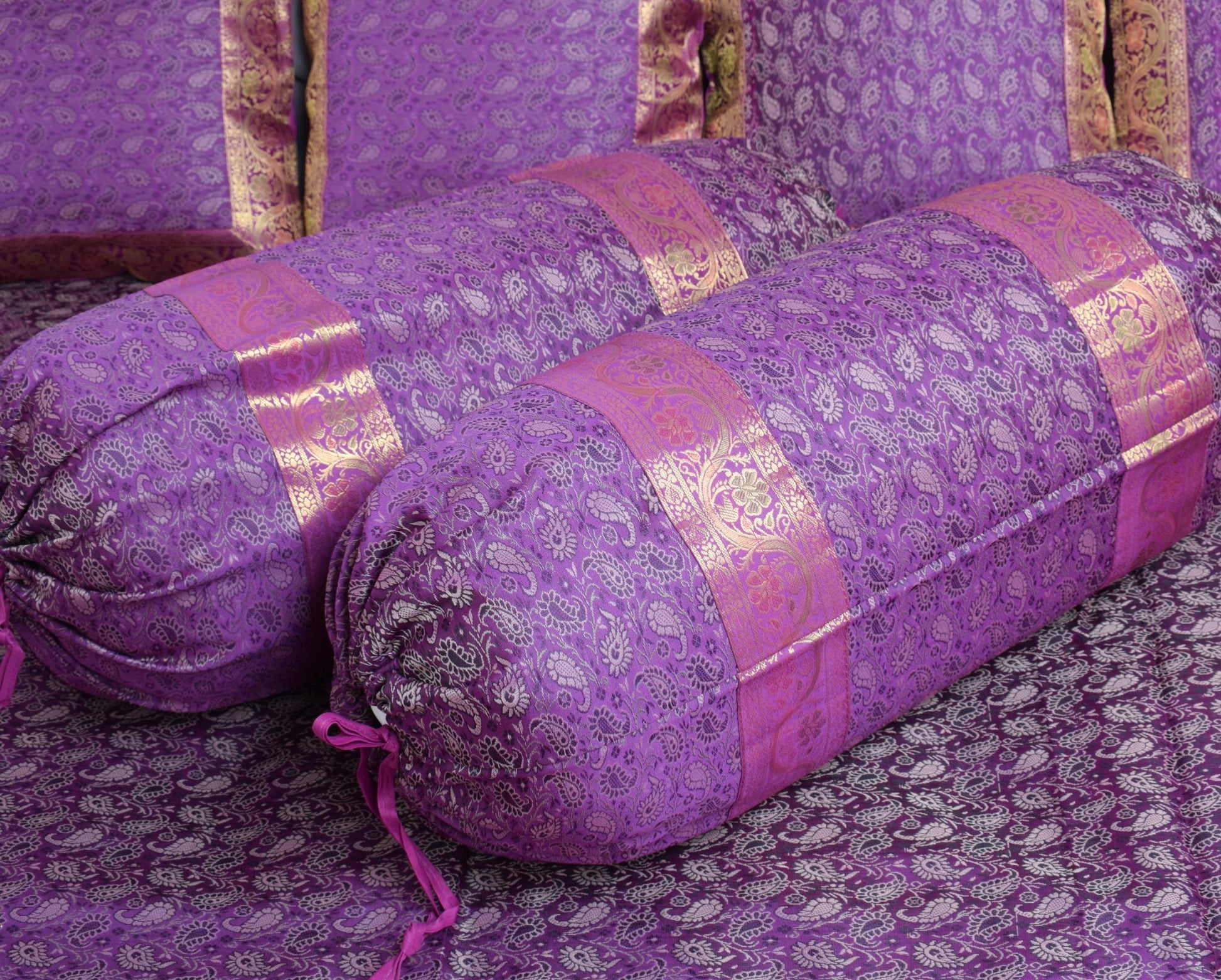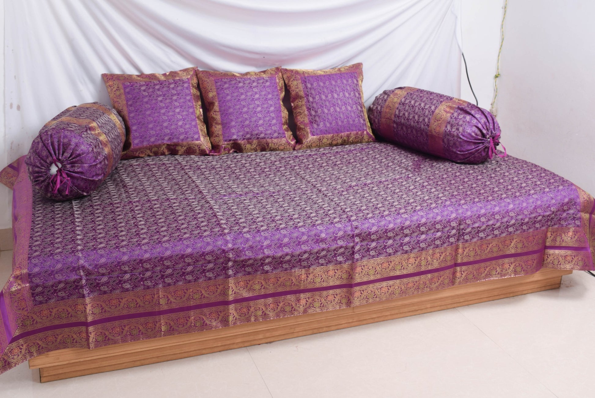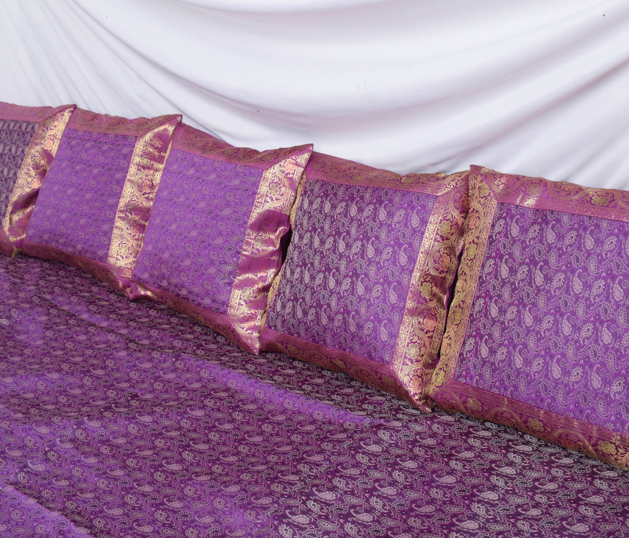 Banarasi Purple Diwan Set Cushion & Bolster Cover Silk & Woven Zari Brocade