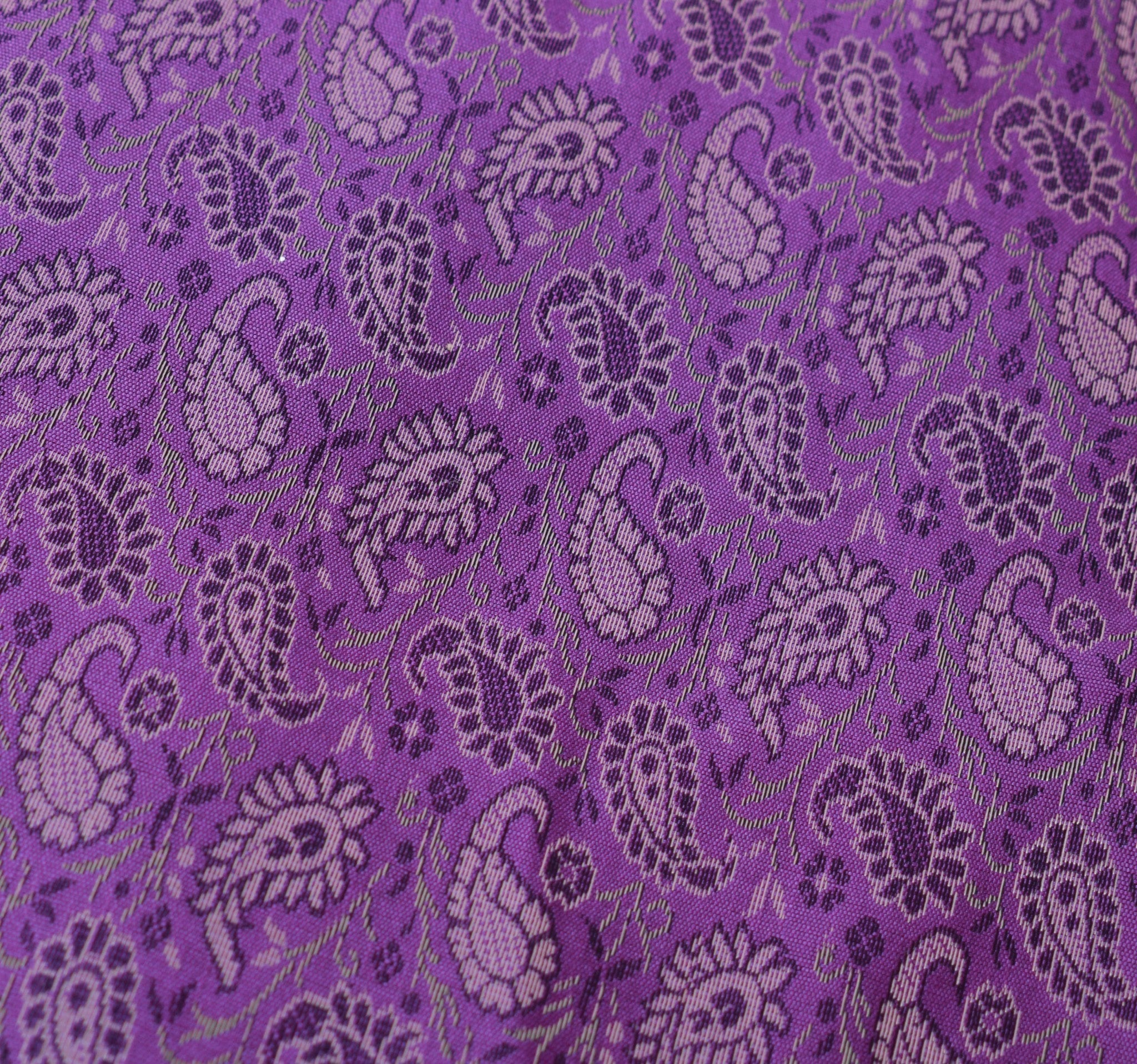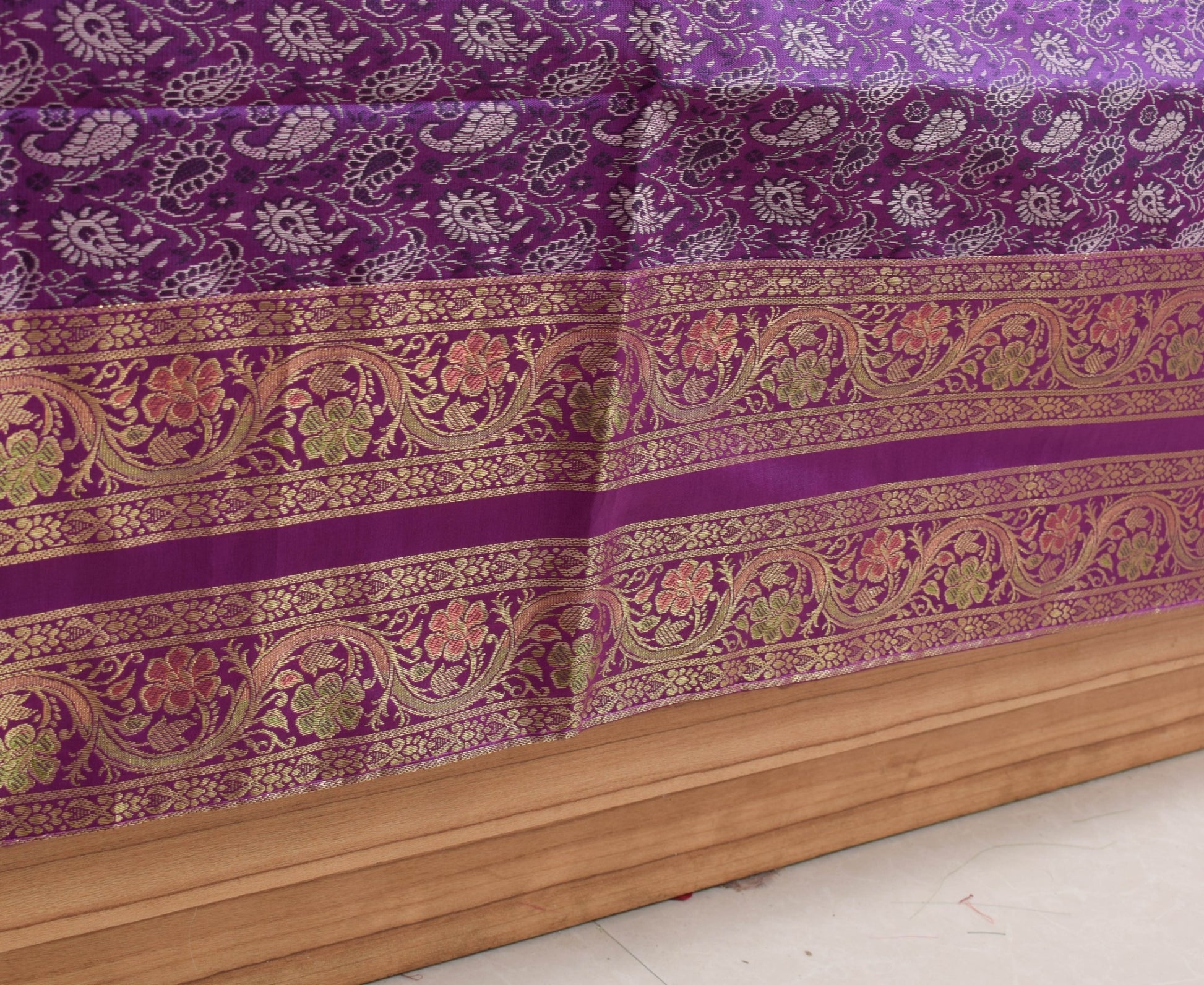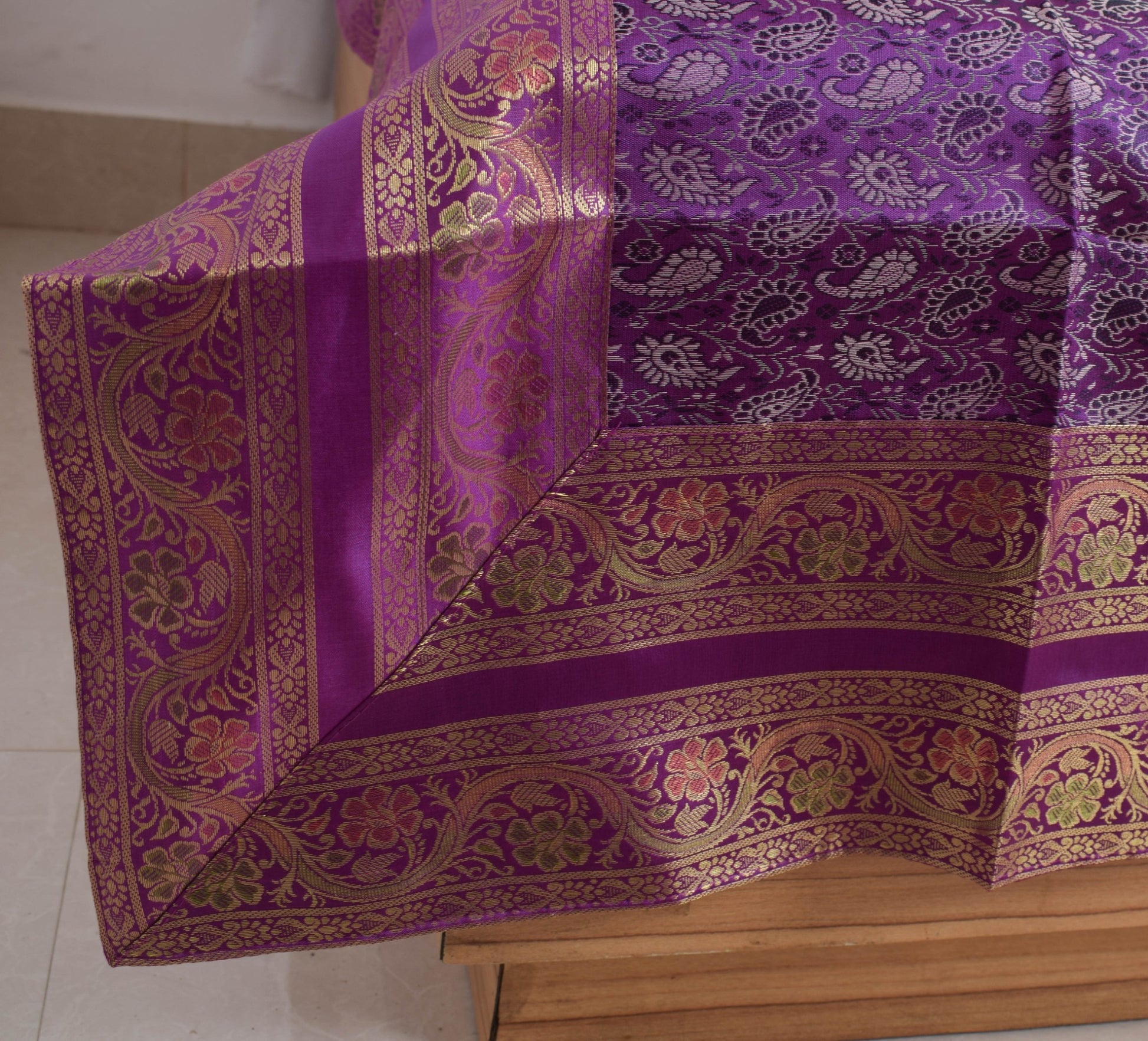 This is a Patch Work Diwan Set in Art Silk Fabric with all side Banarasi Silk Woven Golden Zari Brocade Border, this Diwan Set comes with Matching color Back lining fabric with Hidden Zip which allow you to insert the Blanket in Bed Cover and Pillow in the Cushion Cover & Bolster Cover . The base color of the cover is Purple Color Border & Art or Artificial Silk fabric.