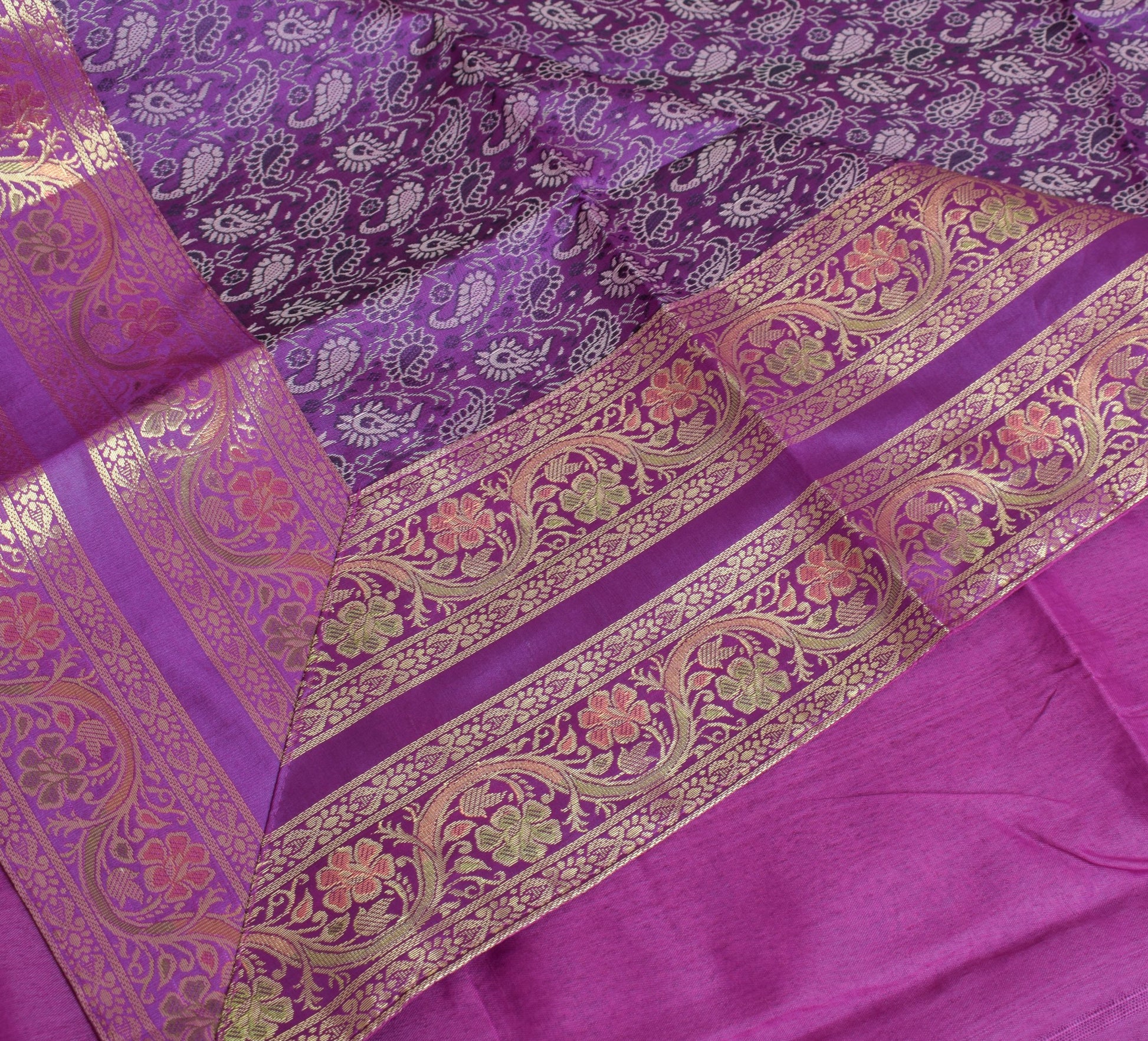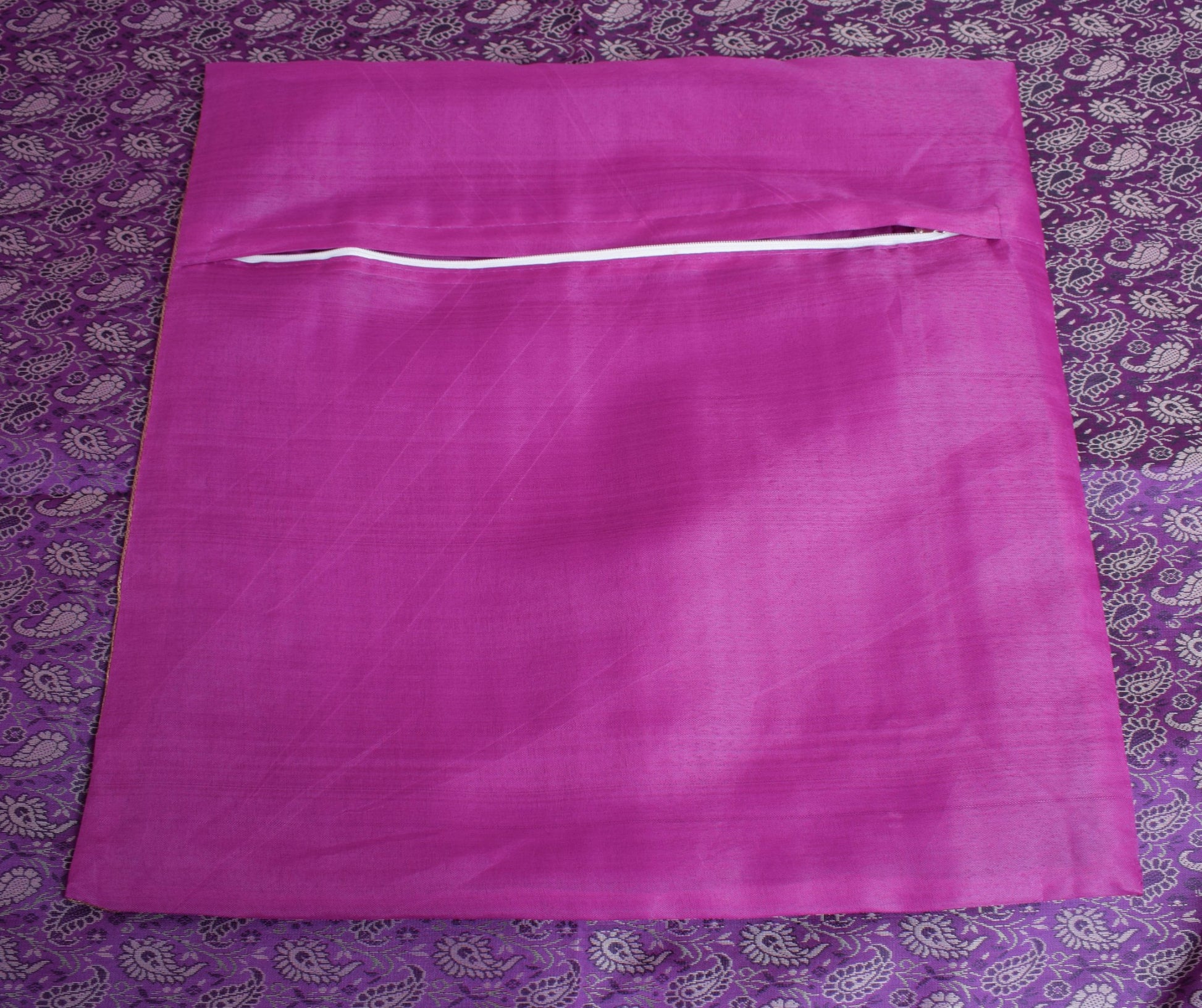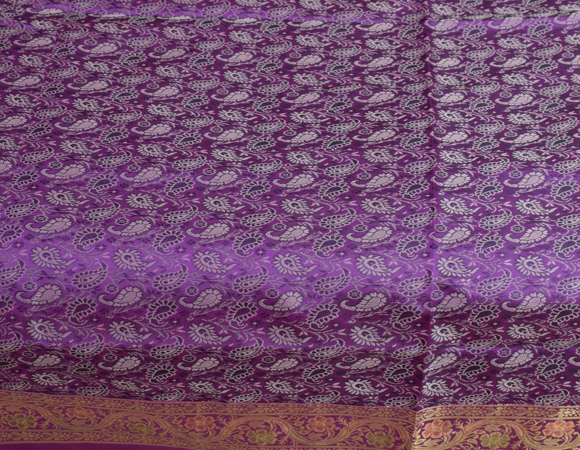 This is a Patch Work Diwan Set in Art Silk Fabric with all side Banarasi Silk Woven Golden Zari Brocade Border, this Diwan Set comes with Matching color Back lining fabric with Hidden Zip which allow you to insert the Blanket in Bed Cover and Pillow in the Cushion Cover & Bolster Cover . The base color of the cover is Purple Color Border & Art or Artificial Silk fabric.