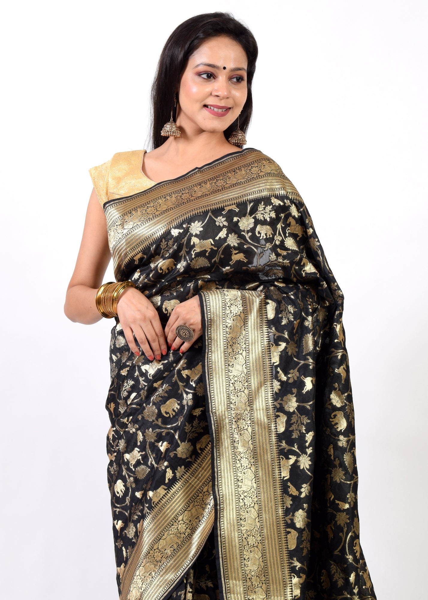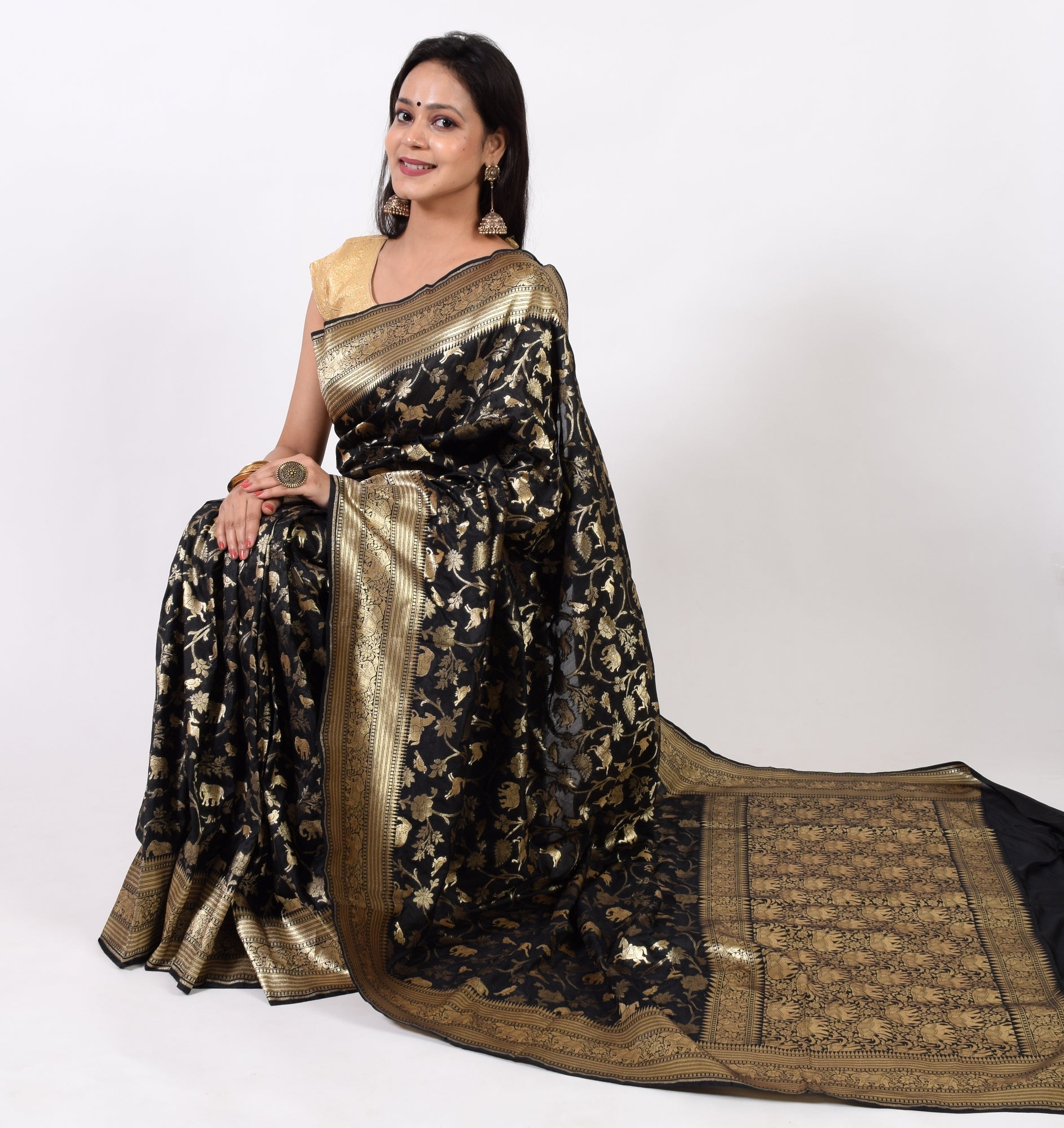 Banarasi Vastra Presents Shikargah Pattern Saree in Black color with Golden Zari Woven Deer, Birds & Elephant Pattern in Blend Katan Silk, this saree comes with Zari Woven Elephant border and Pallu with Blouse fabric .