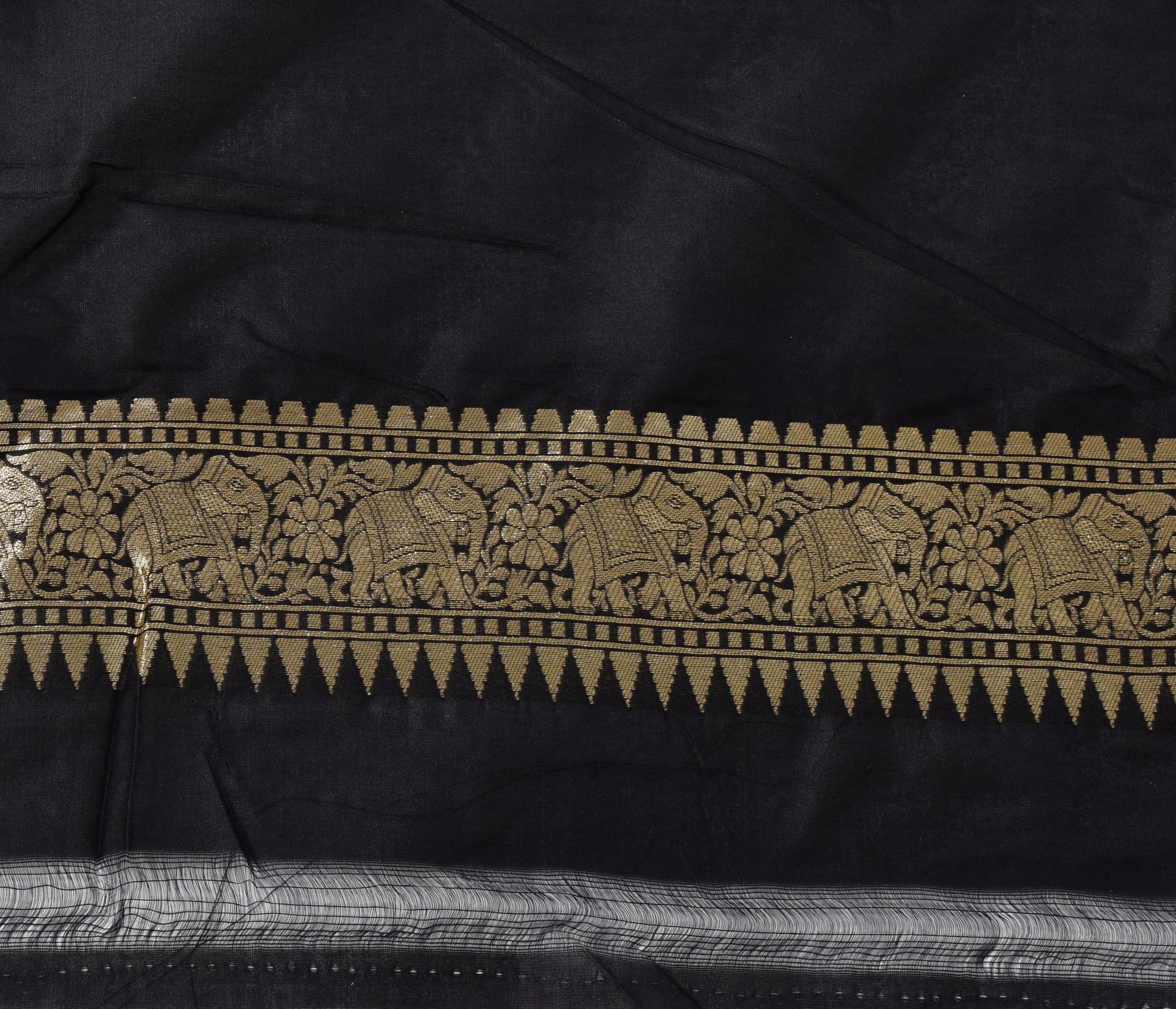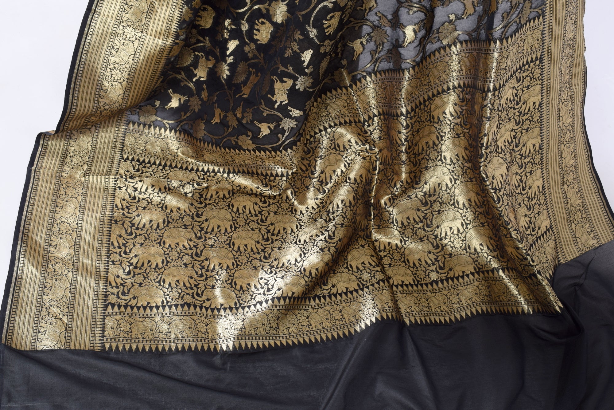 Banarasi Shikargah Zari Woven Black Sari Bend Silk Elephant Deer Birds Fabric