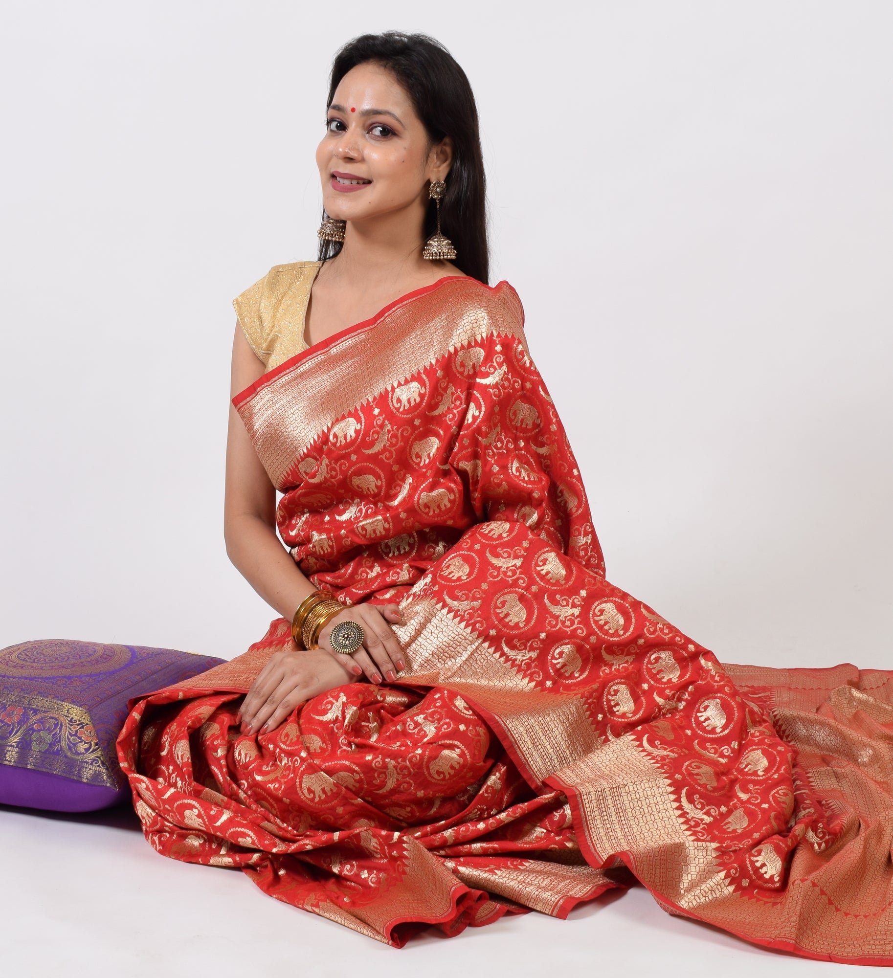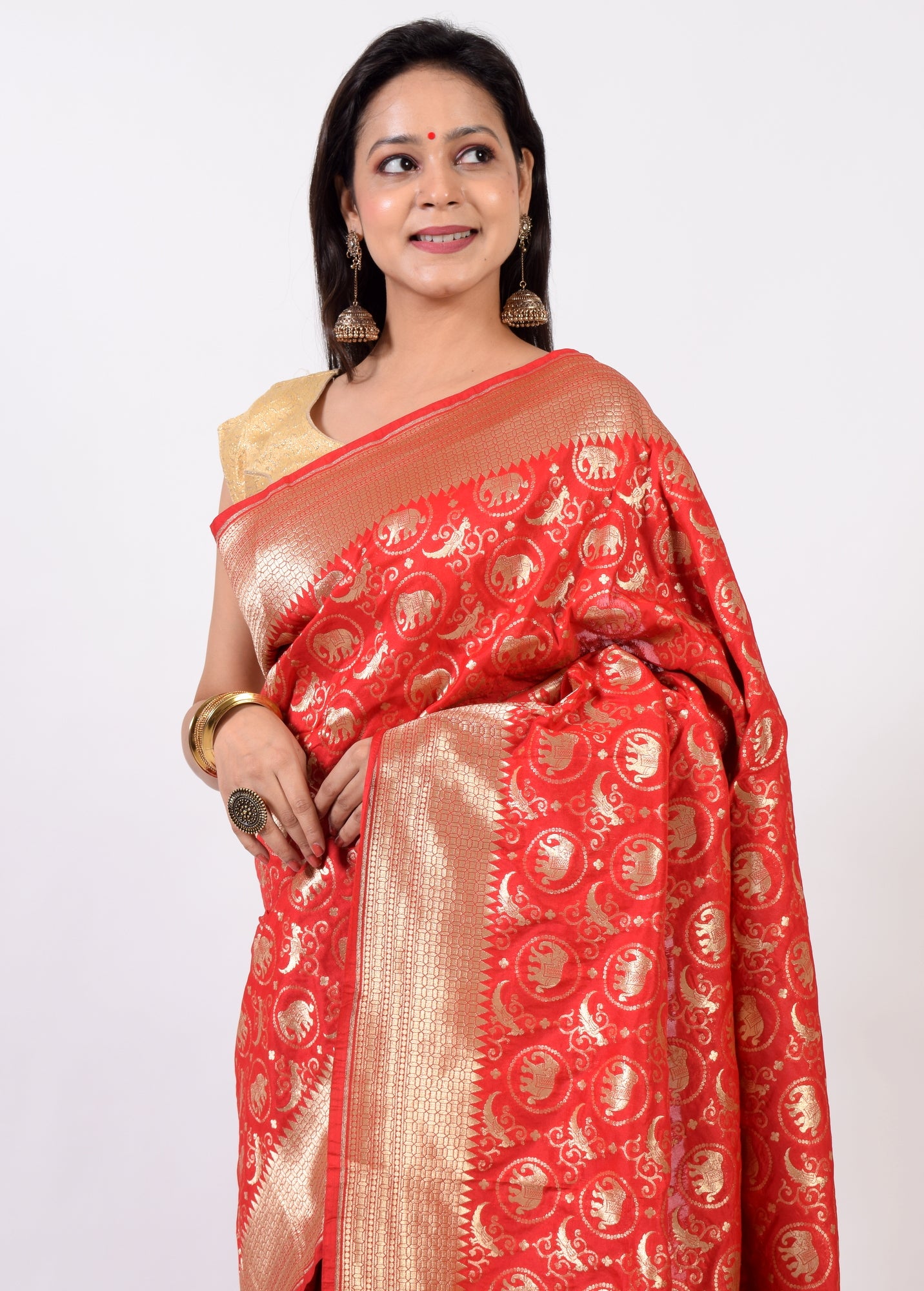Banarasi Shikargah Saree Zari Woven Red Sari Bend Silk Elephant Birds Fabric