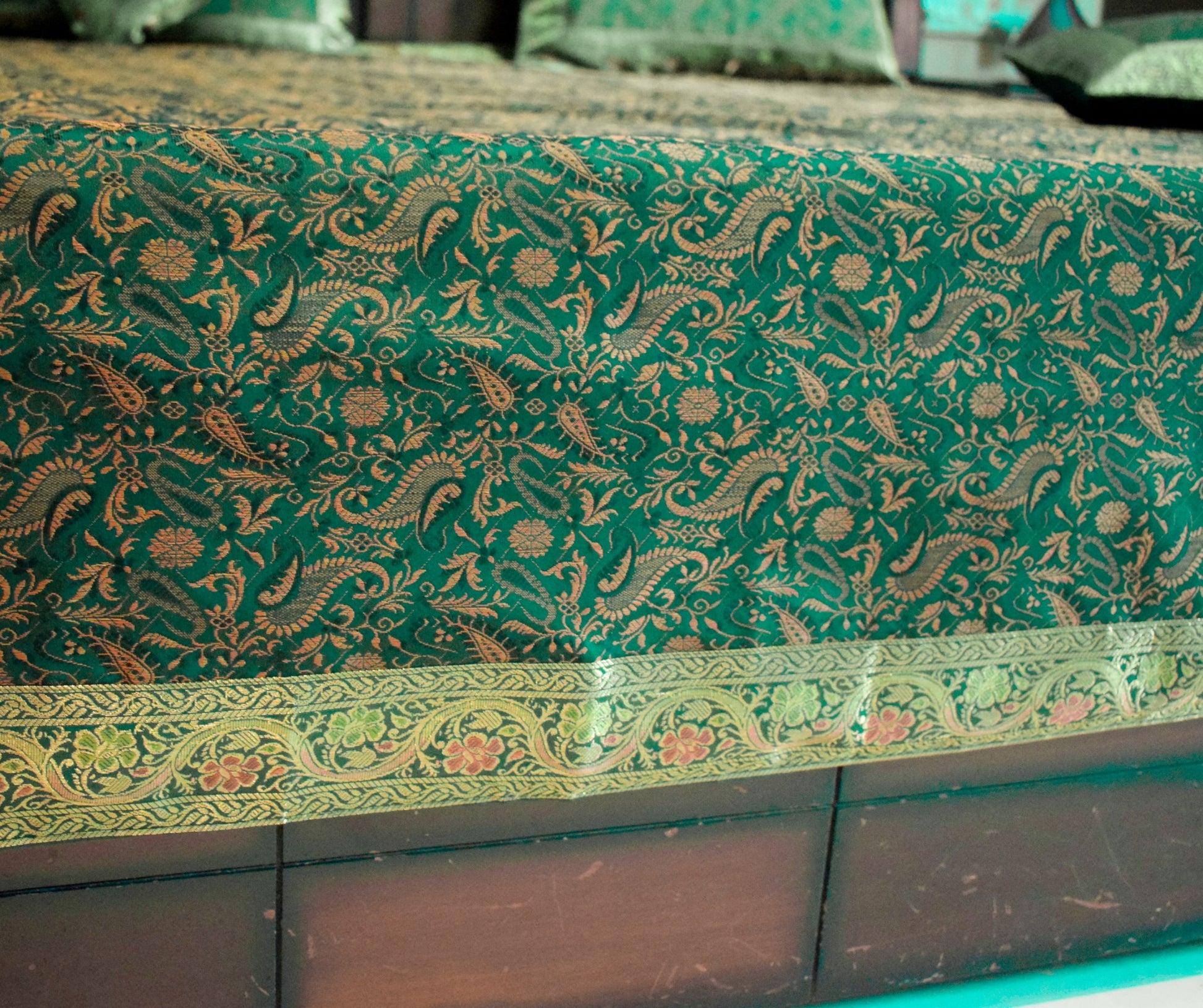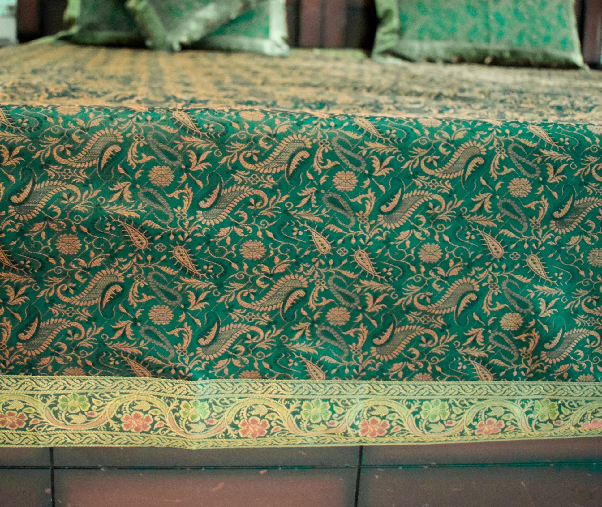 This is a Patch Work Bed Cover Set in Art Silk Fabric with all side Banarasi Silk Woven Golden Zari Brocade Border, this Bed Cover comes with Matching color Back lining fabric with Hidden Zip which allow you to insert the Blanket in Bed Cover and Pillow in the Cushion Cover & Pillow Cover . The base color of the cover is Dark Green.