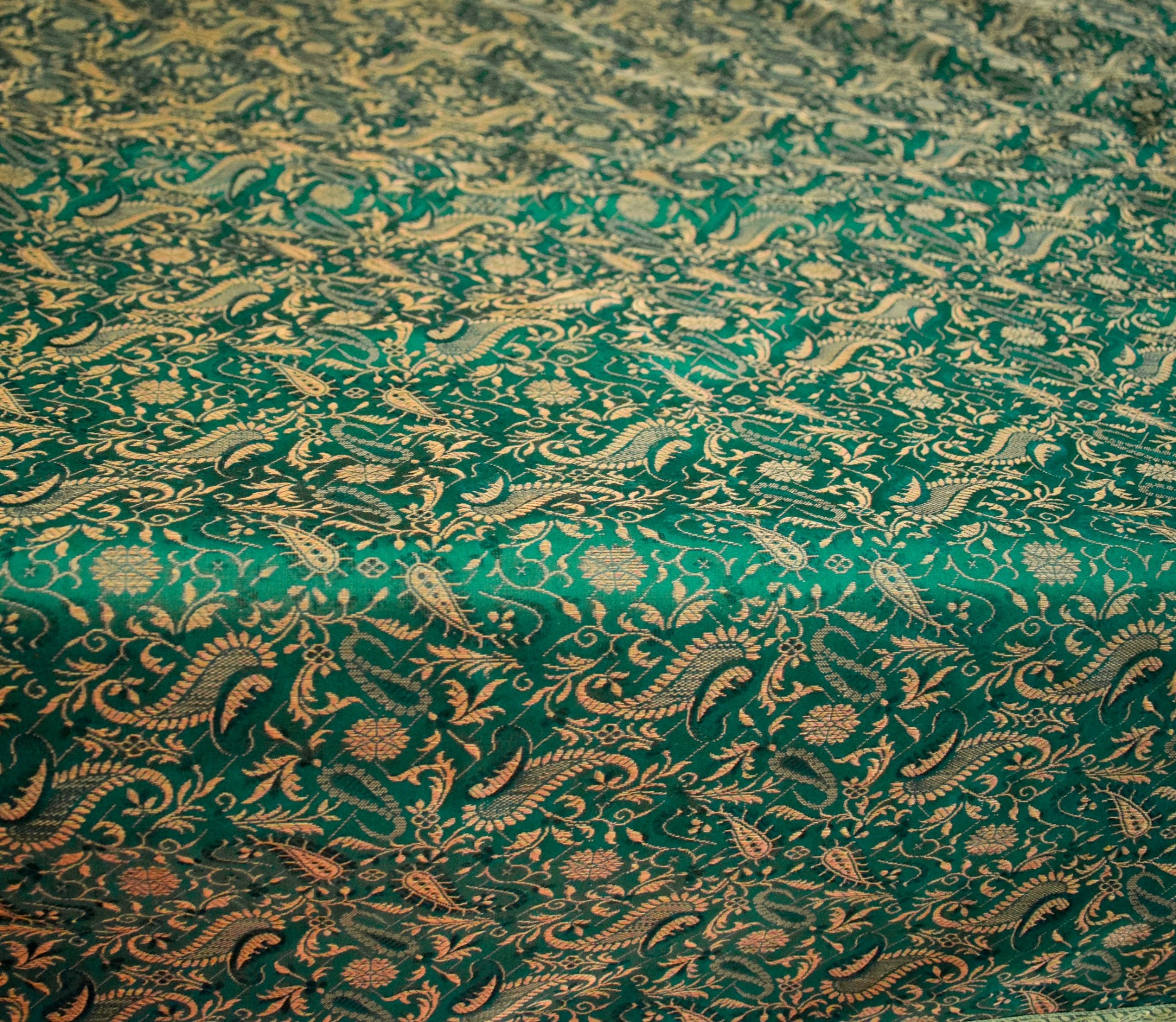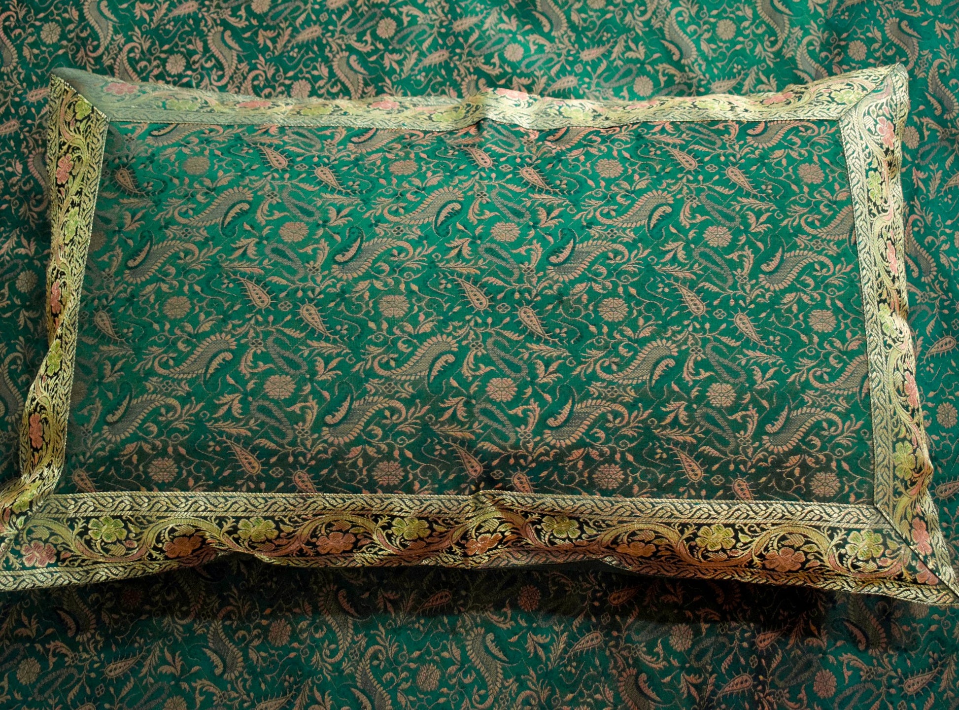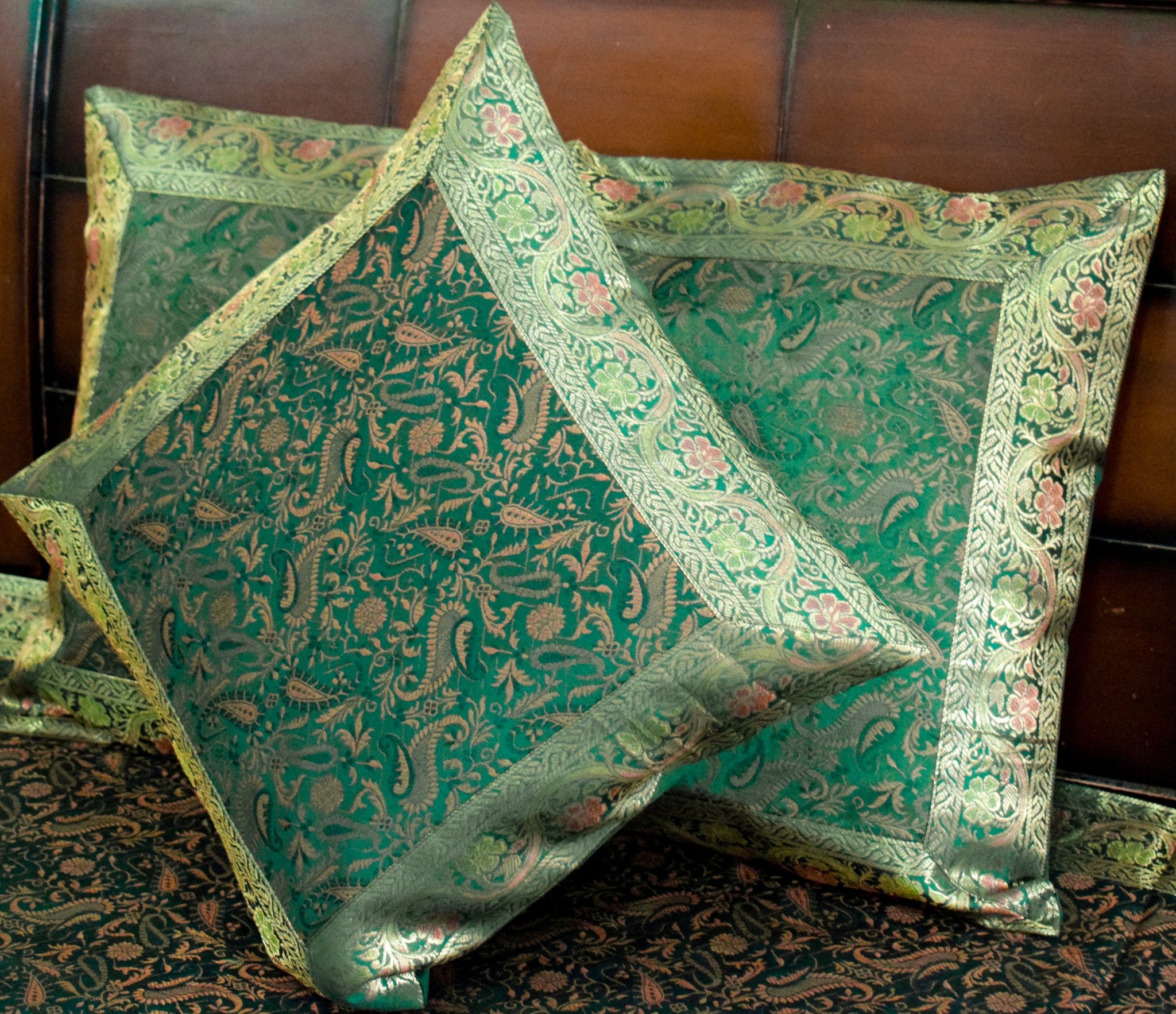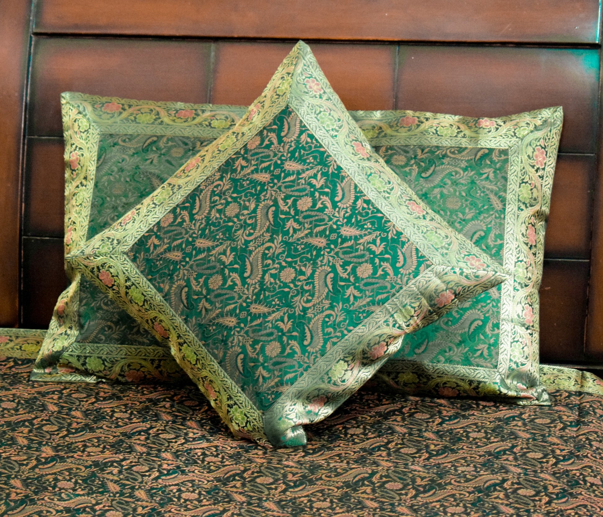 Banarasi Silk Cushion & Pillow Cover Set – Dark Green Zari Brocade Woven Design