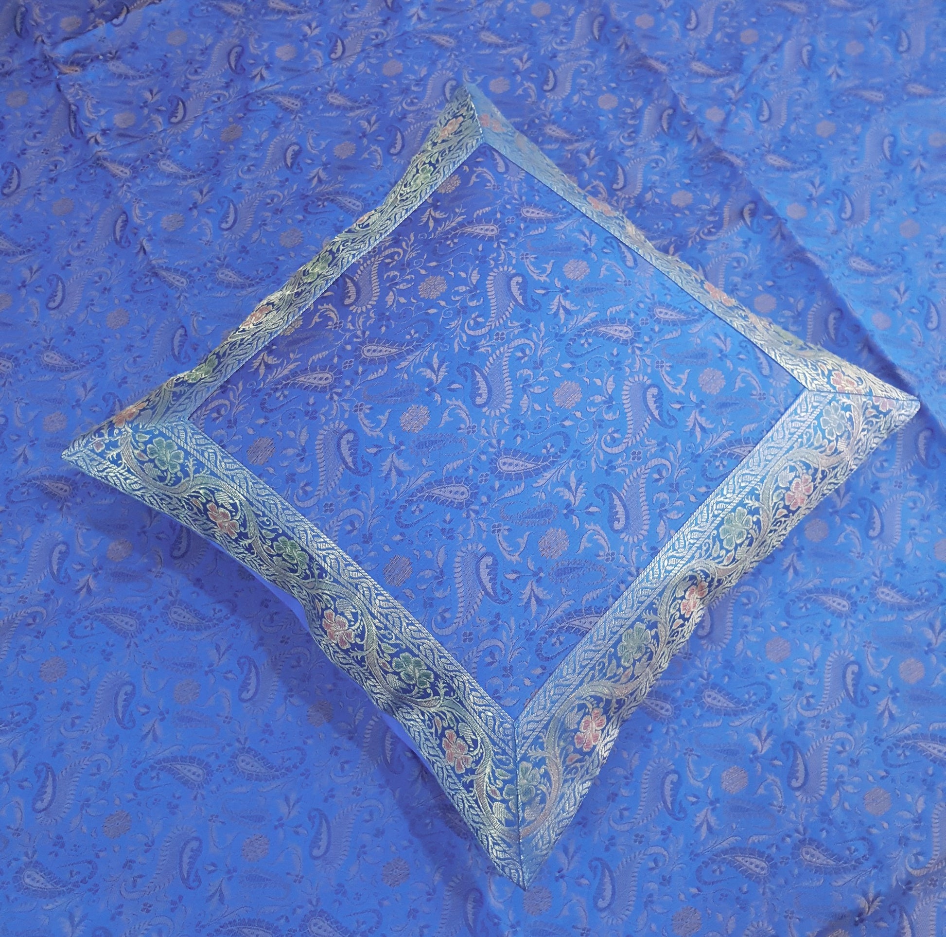 Banarasi Turquoise Blue Bed Cushion & Pillow Cover Set Silk Woven Zari Brocade