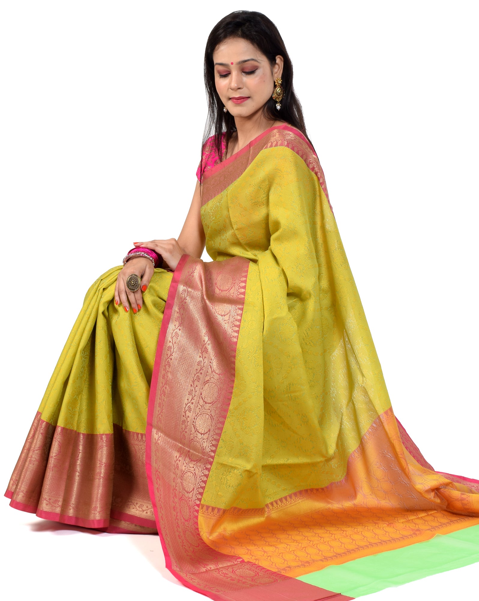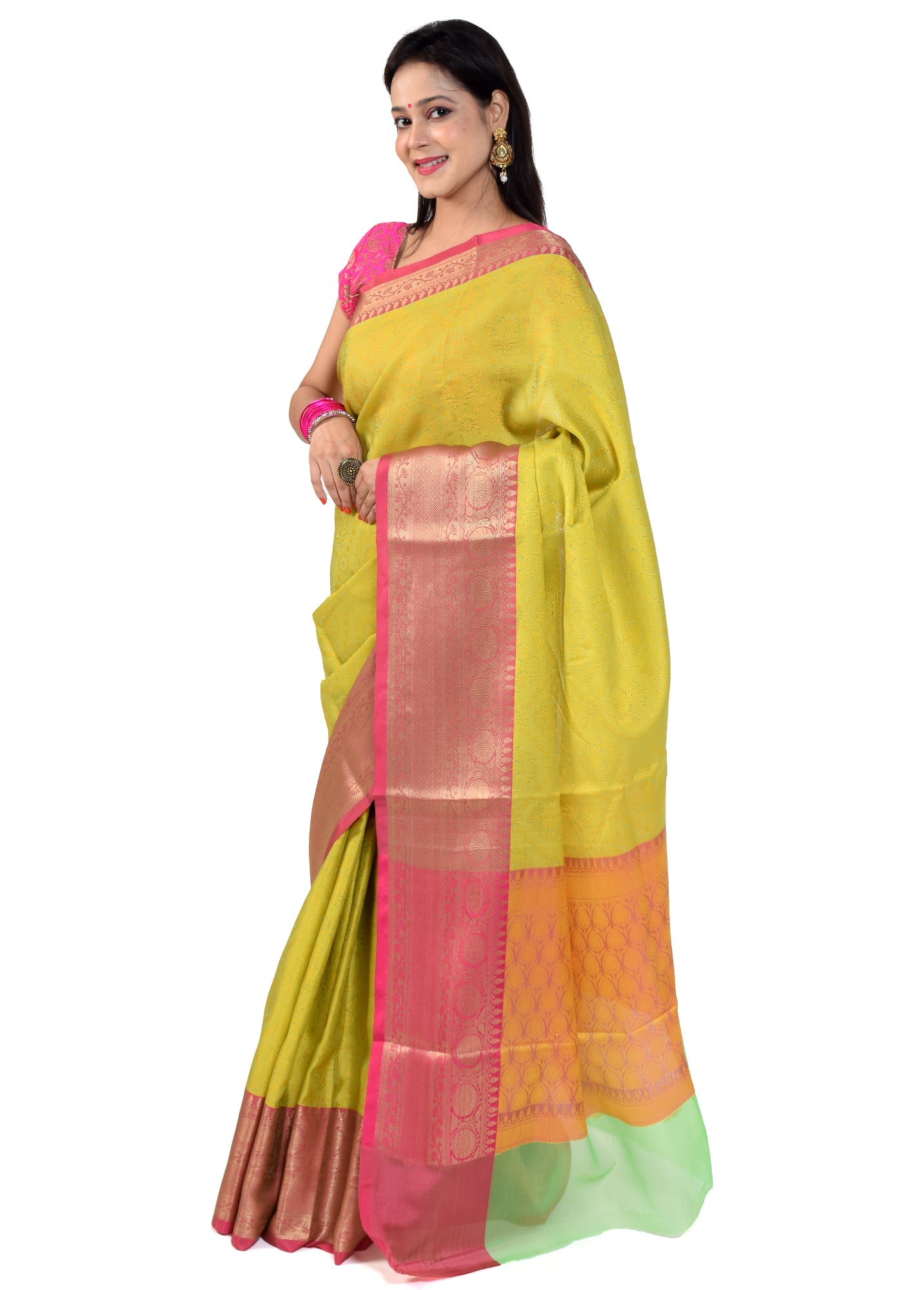 Banarasi Vastra Presents Beautiful Florescent Green Color Kora Silk Tanchoi Saree with Resham Woven Floral Pattern in the center part of the Saree Comes with Zari Woven Contrast Pink Skirt Border & Pallu.