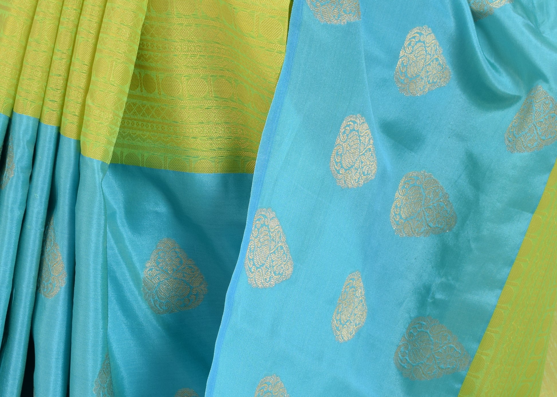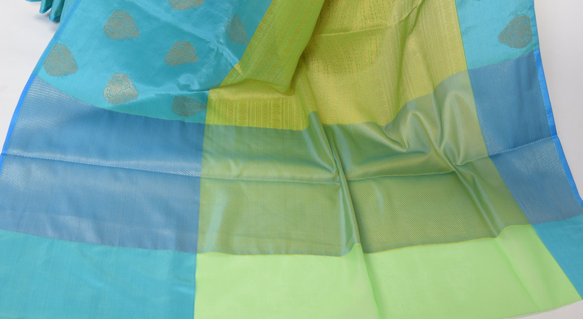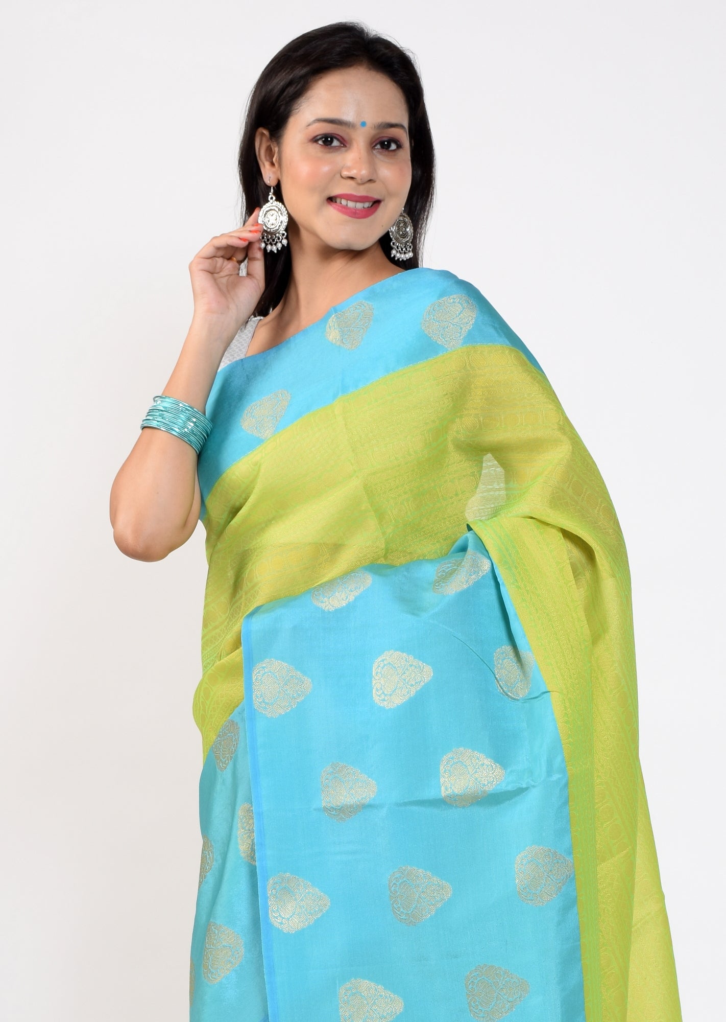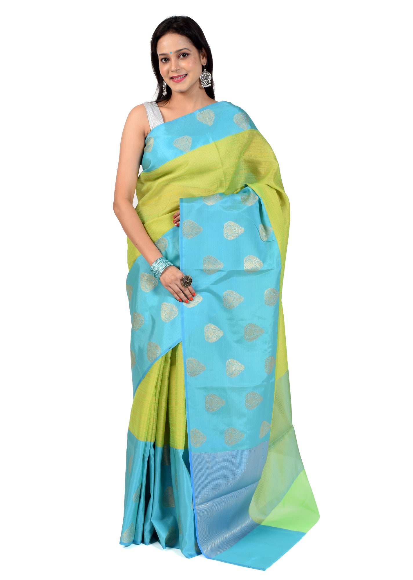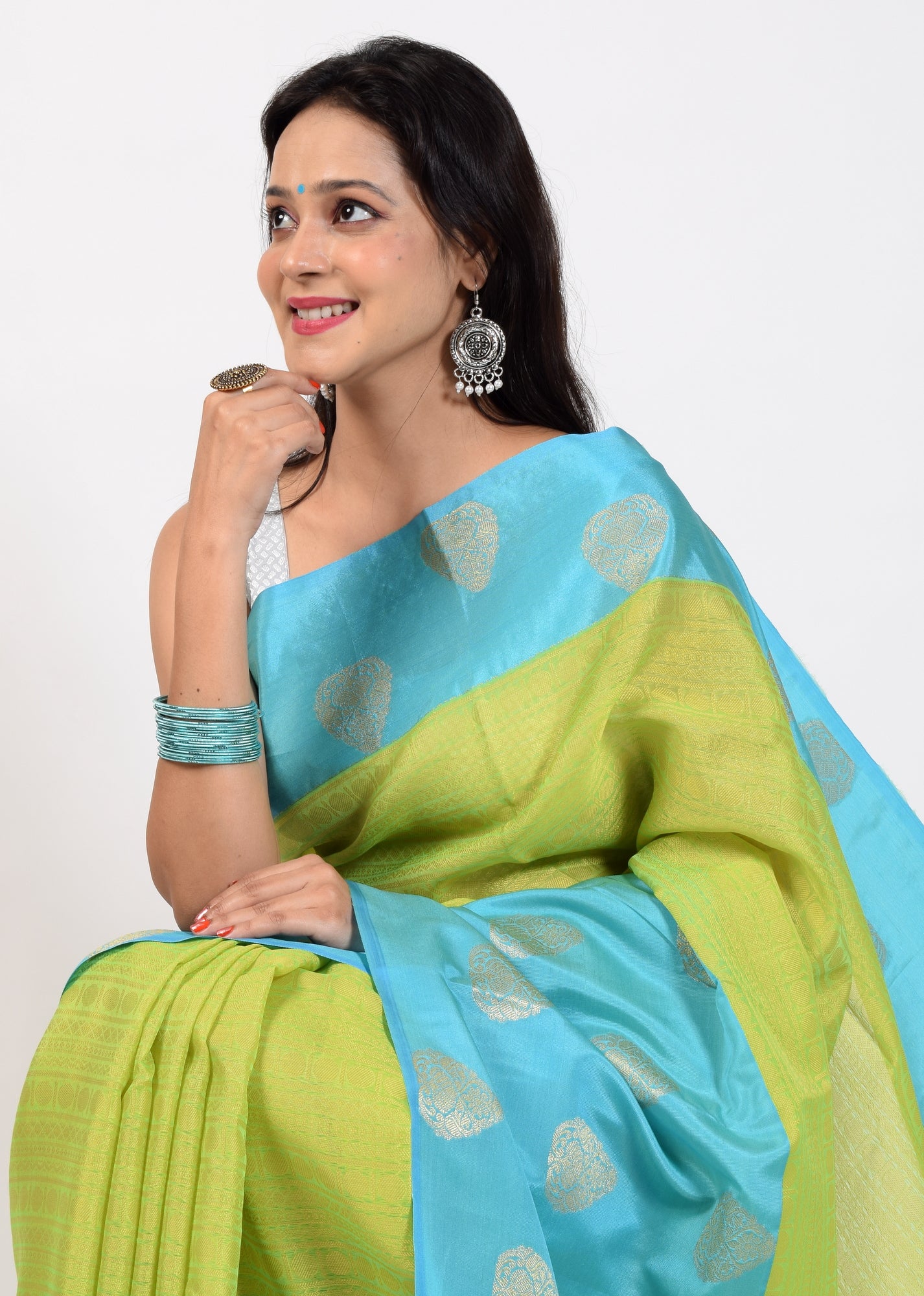Banarasi Vastra Presents Beautiful Light Green Color Kora Silk Tanchoi Saree with Resham Woven Abstract Pattern in the center part of the Saree Comes with Zari Woven Contrast Turquoise Blue Skirt Border & Pallu.