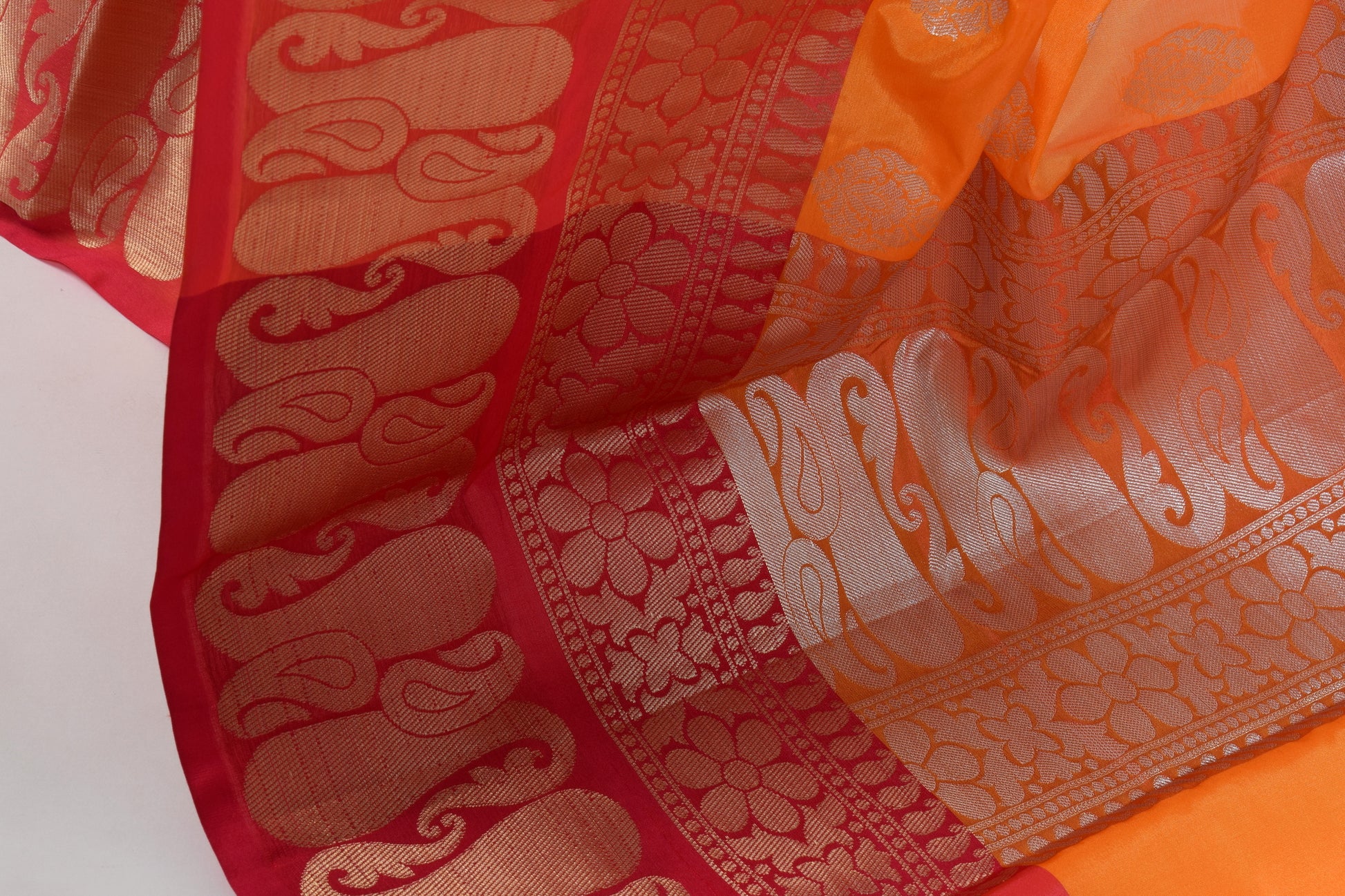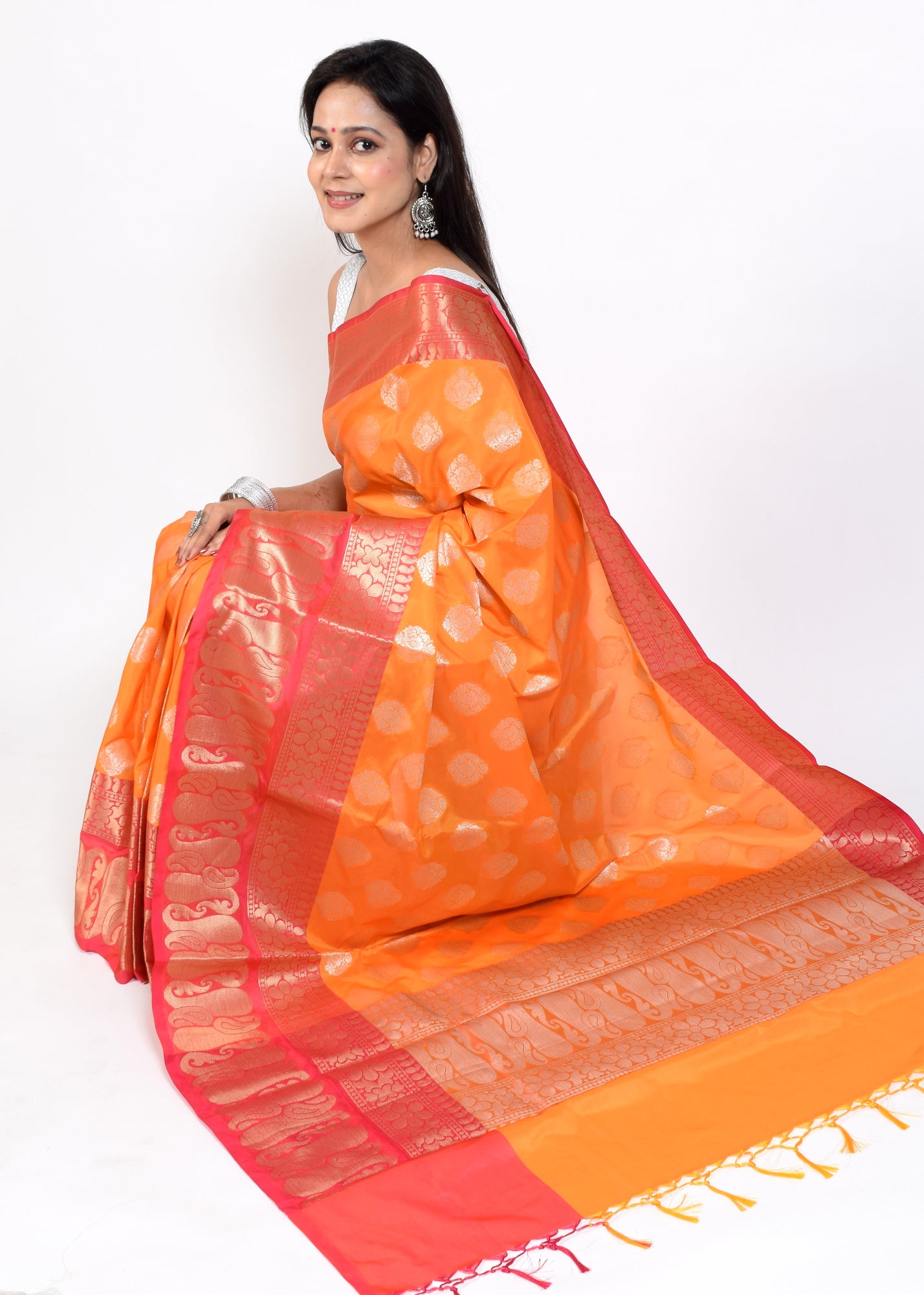 Banarasi Vastra Presents Beautiful Semi Katan Silk Woven Saree in Orange Color with Silver Zari Buta on the center part of the Sari with Silver Golden Zari Woven Contrast Floral & Paisley Border.