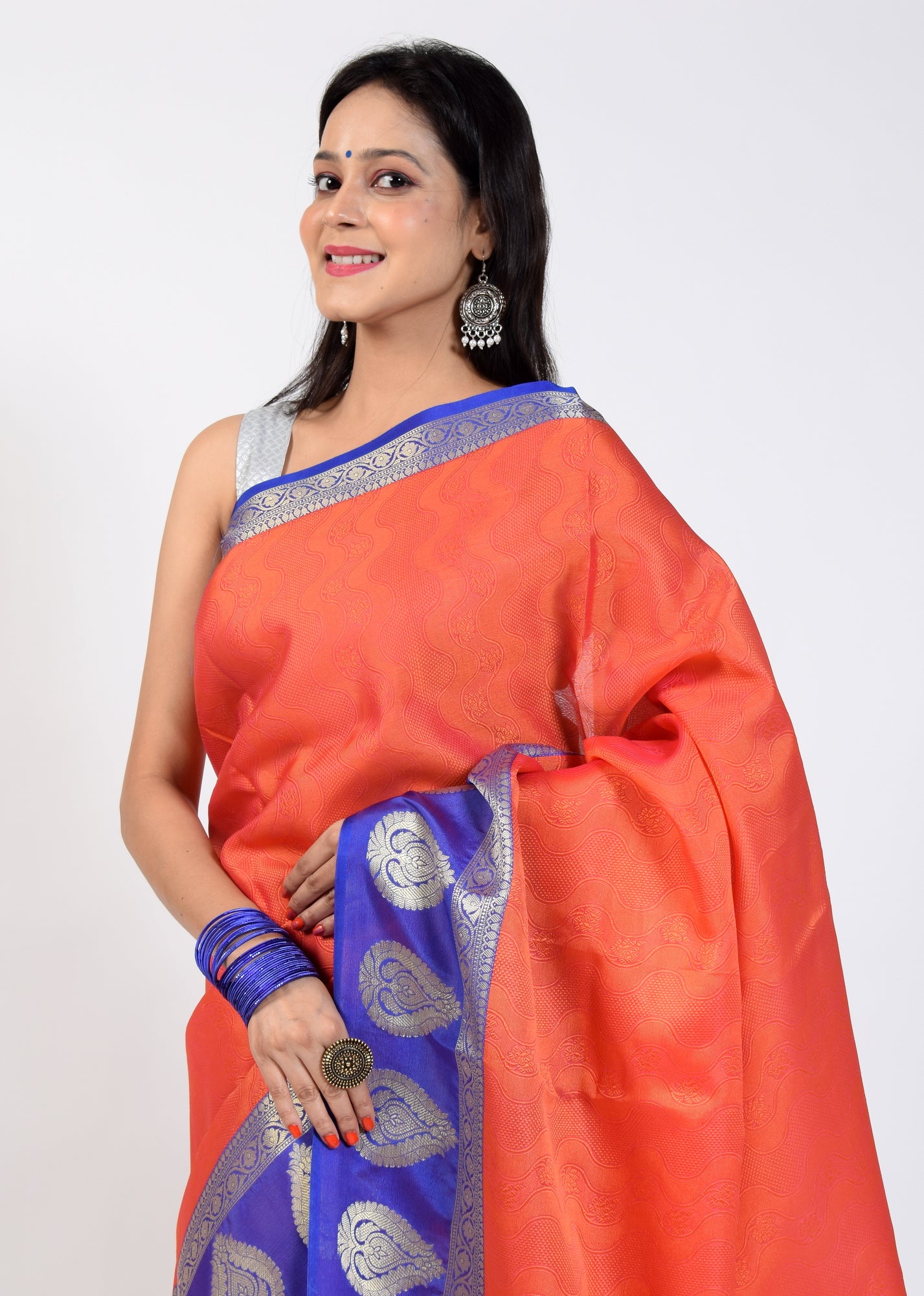 Banarasi Vastra Kora Silk Tanchoi Saree Resham Body Zari Woven Skirt Border Rust