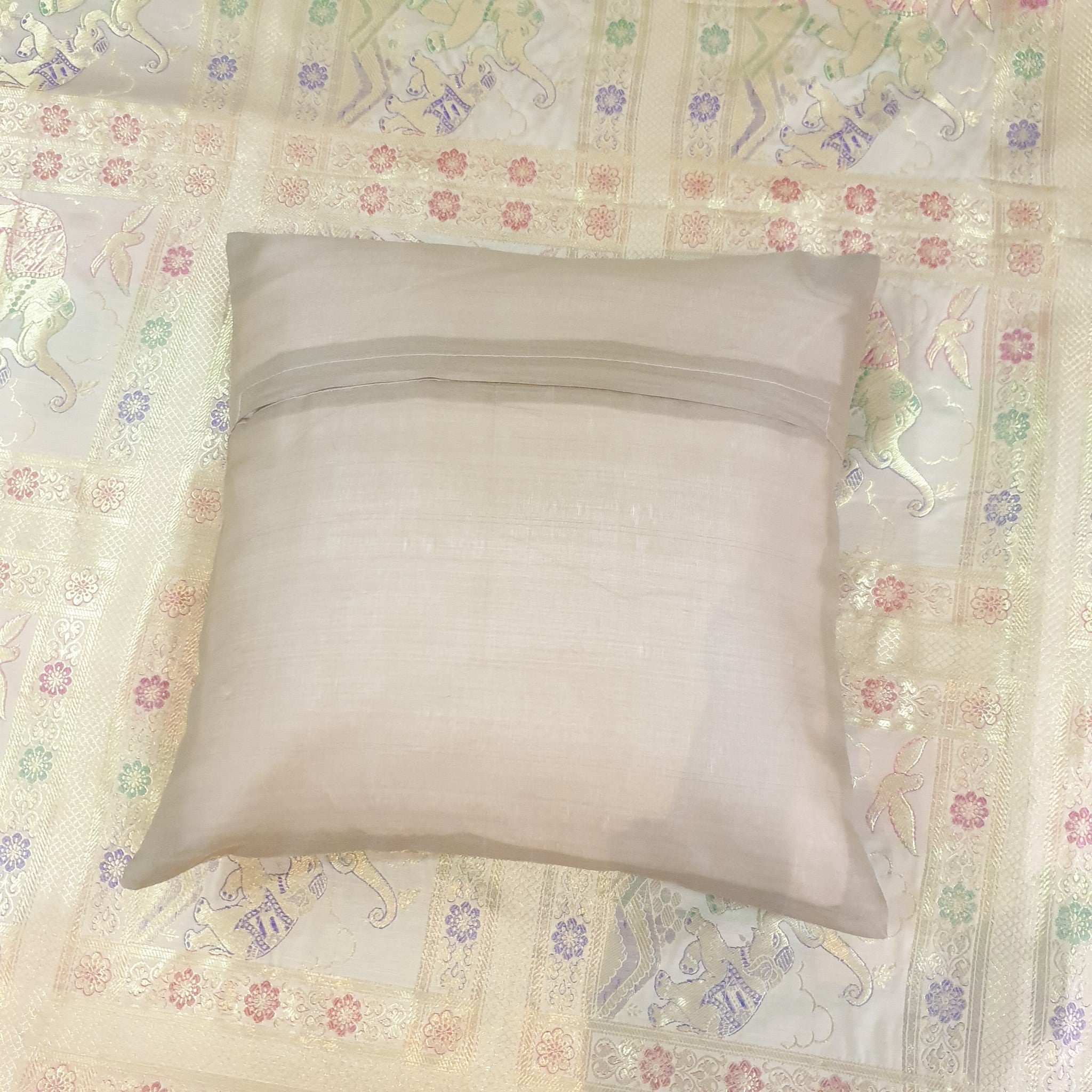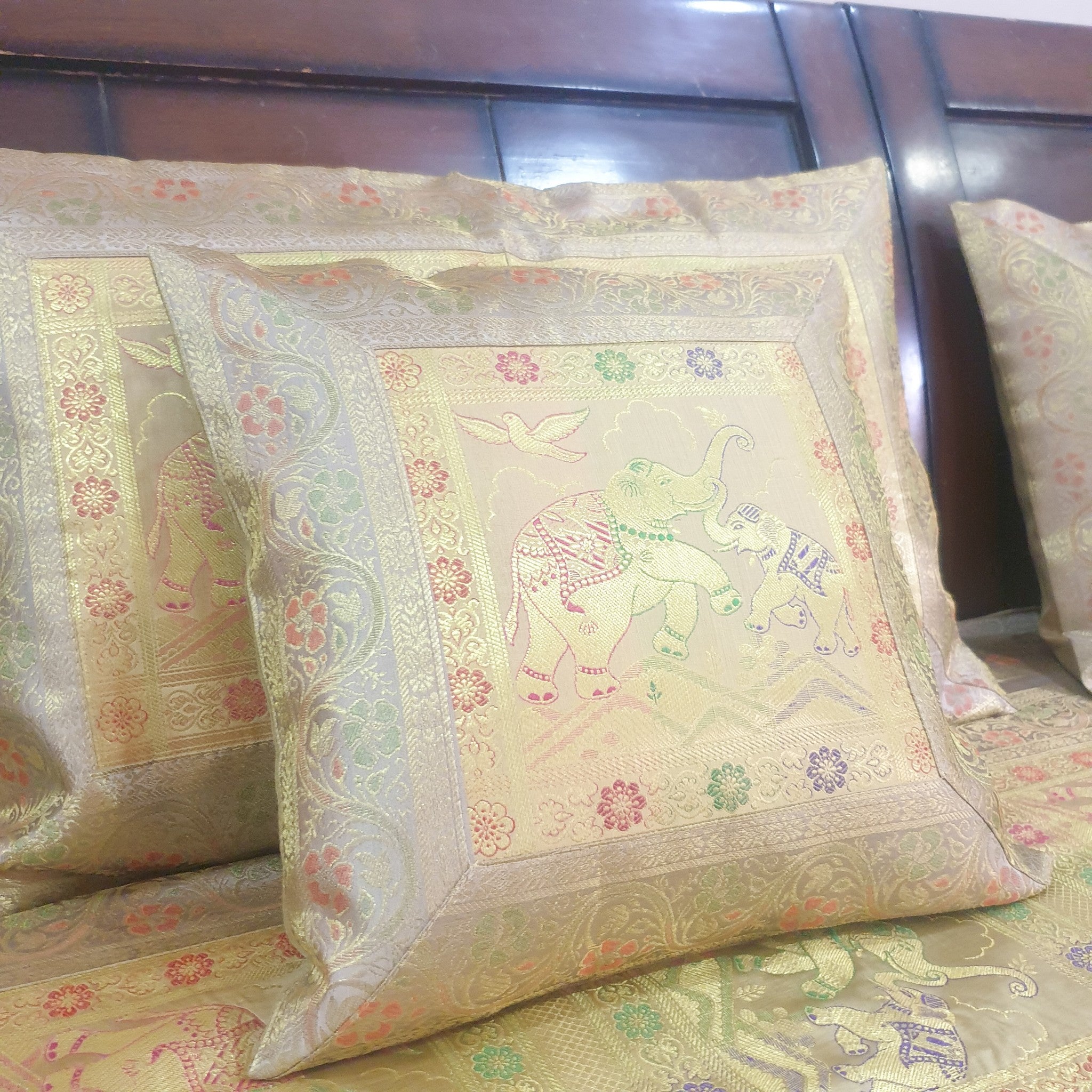 Beige Banarasi Bed Cushion & Pillow Cover Set Elephant Silk & Woven Brocade Gift