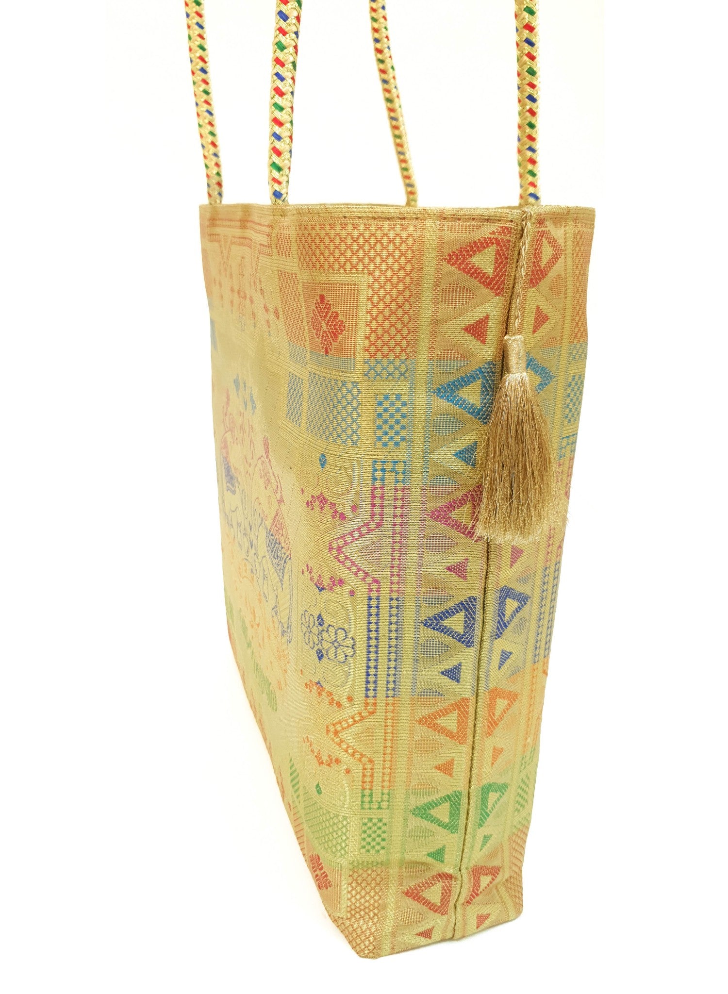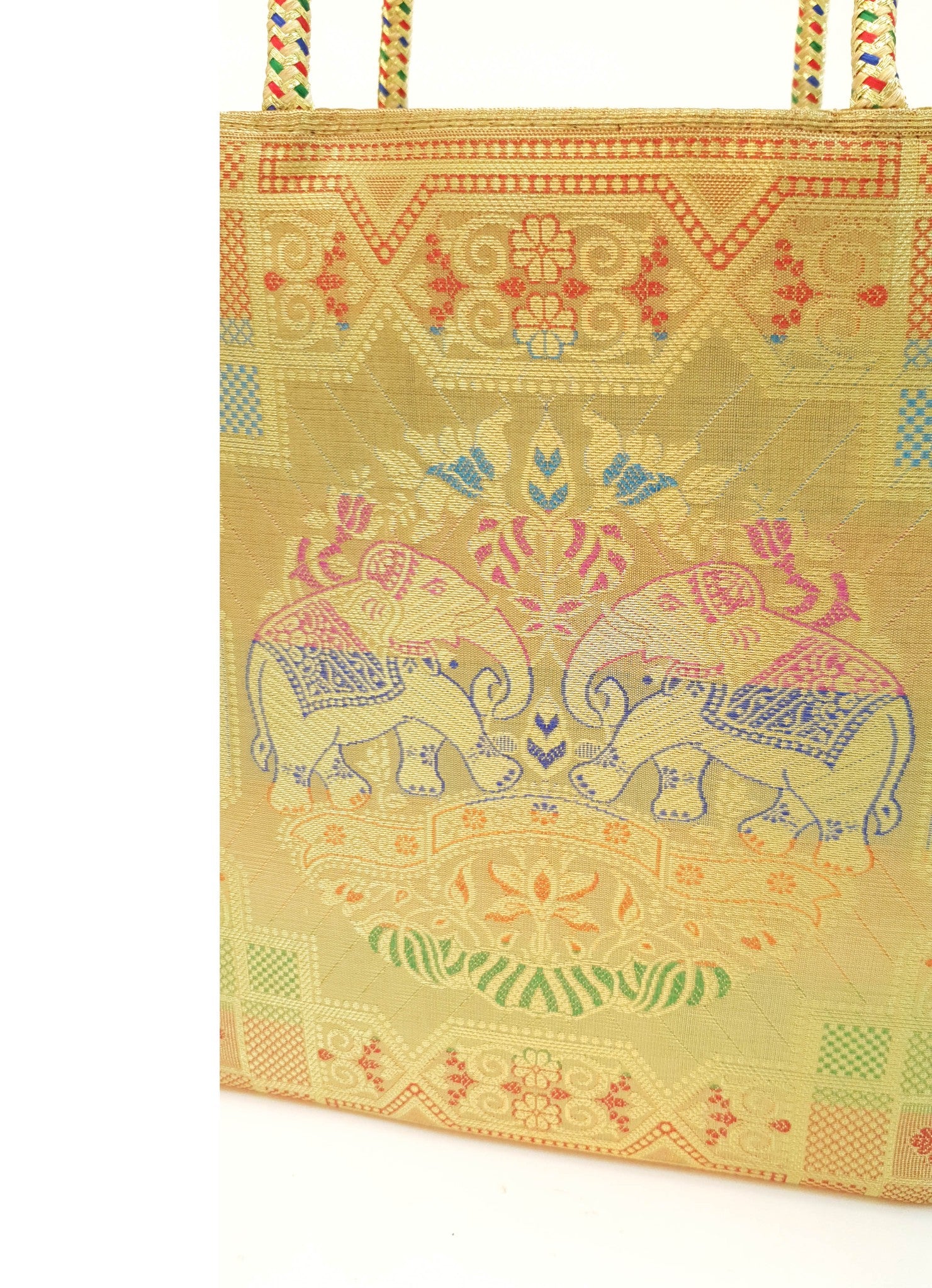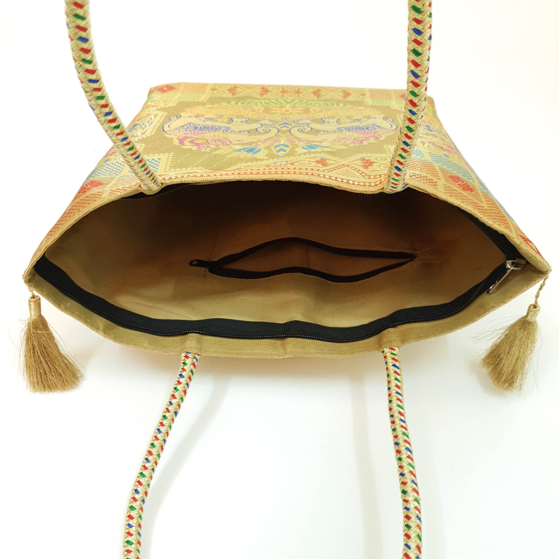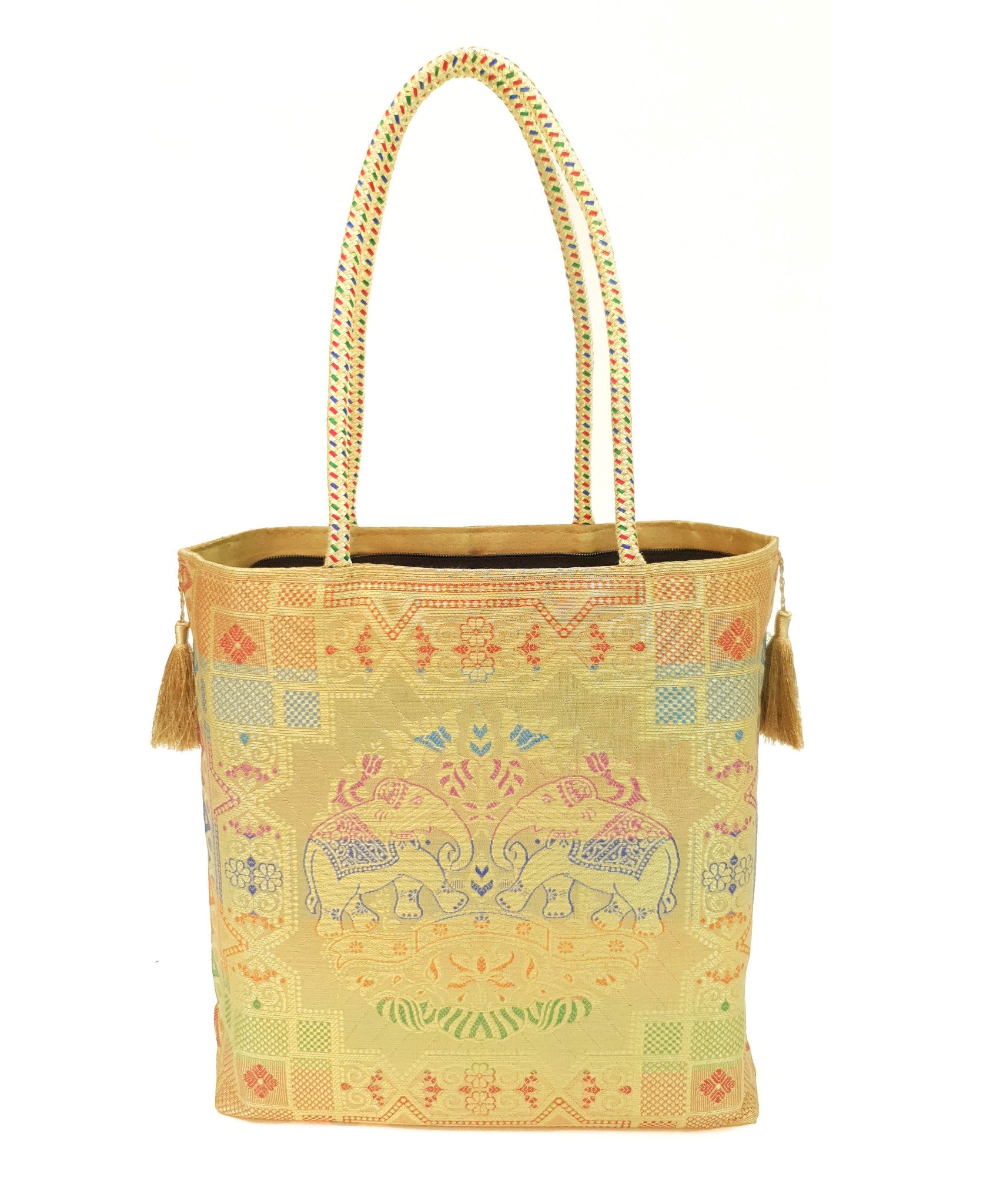 Beige Hand Bag Banarasi Zari Brocade Golden Tassels Elephant Motif Shoulder Bag