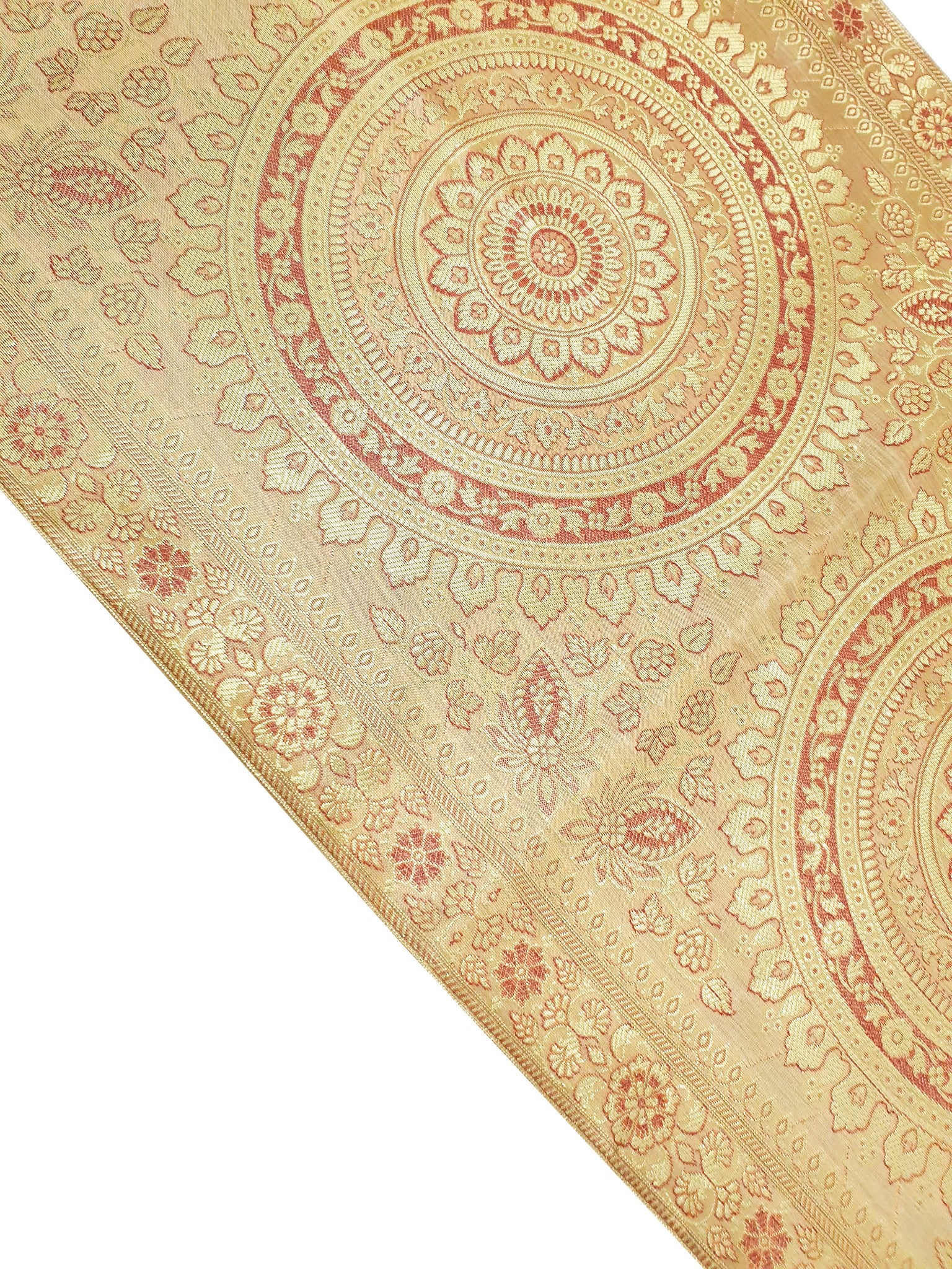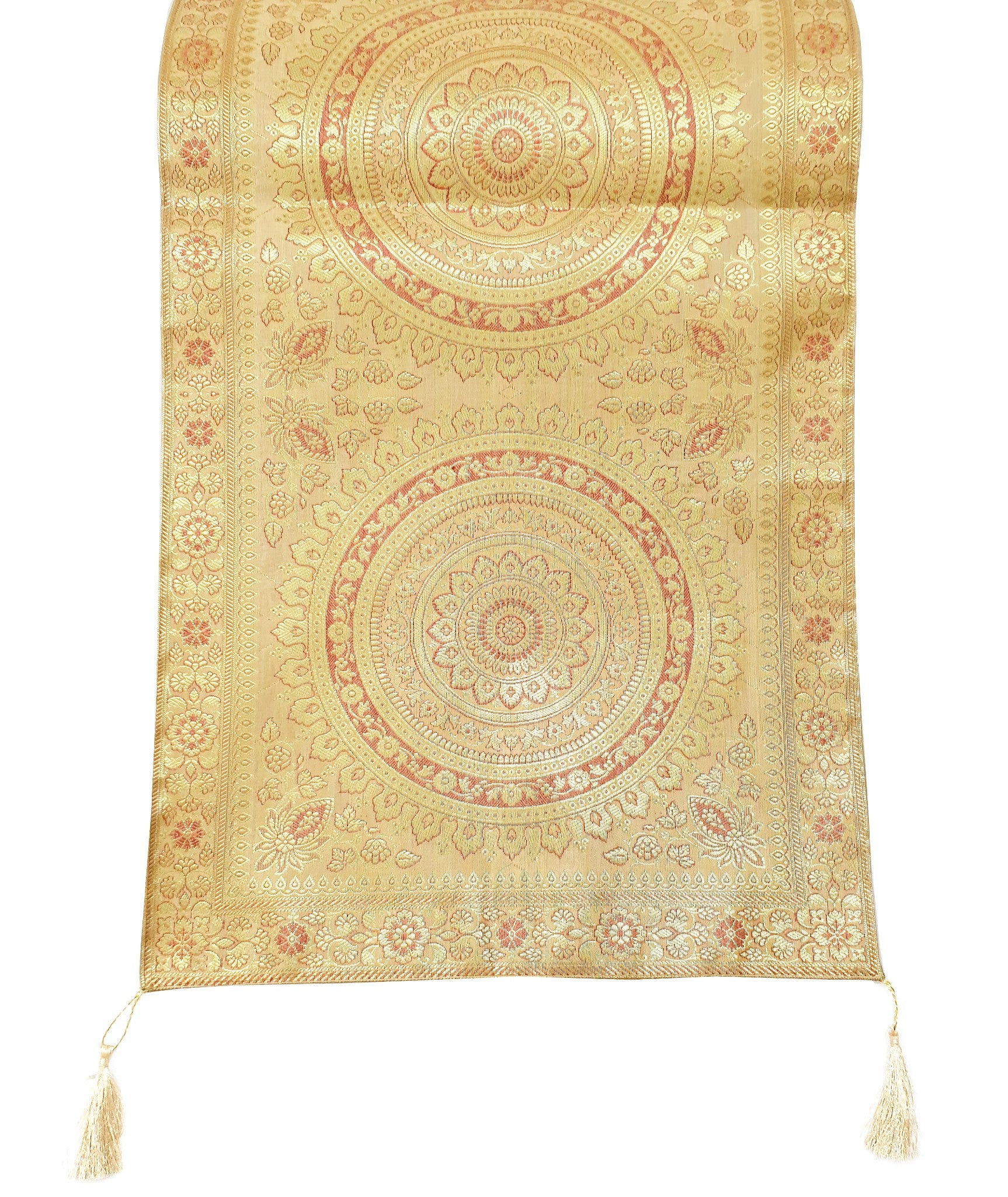 Banarasi Vastra Presents 16 Inch x 72 Inch Woven Golden Zari Brocade Banarasi Silk Table Runner with Woven Mandala Pattern Tanchoi Fabric in the center Part of the cover with all Side Floral Zari Woven Border with 4 side Golden Zari Tassel. this Runner comes with Matching color Back lining fabric.