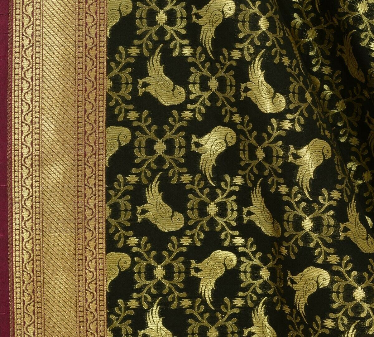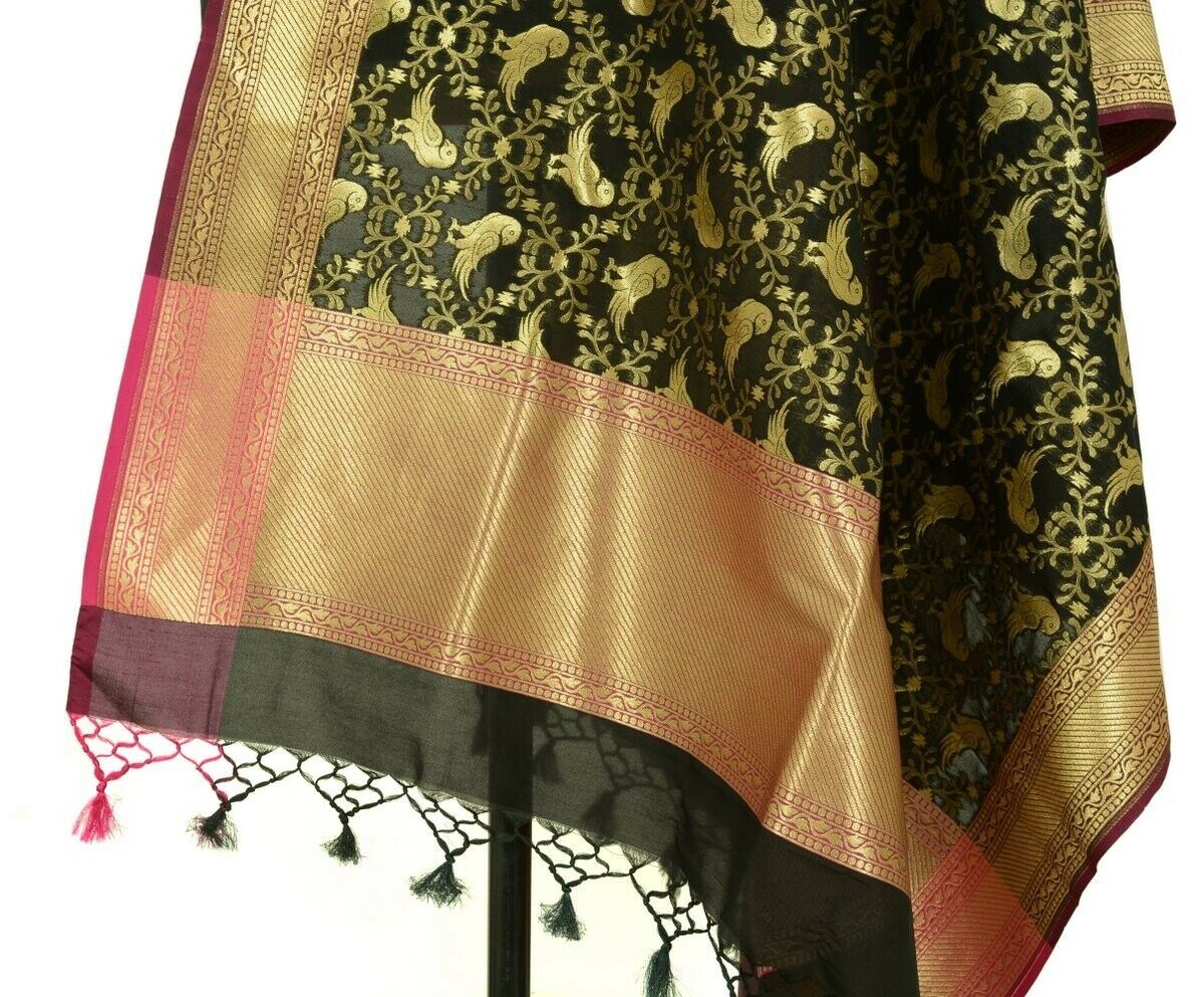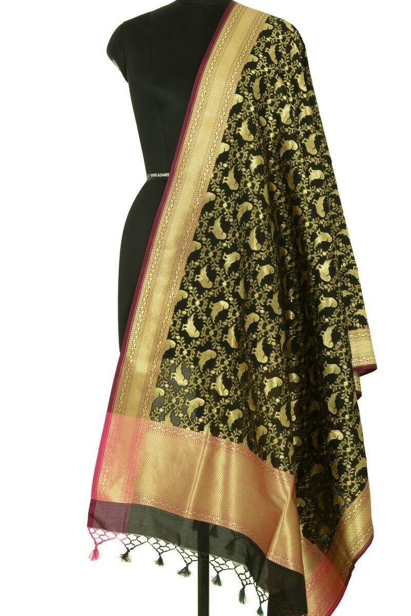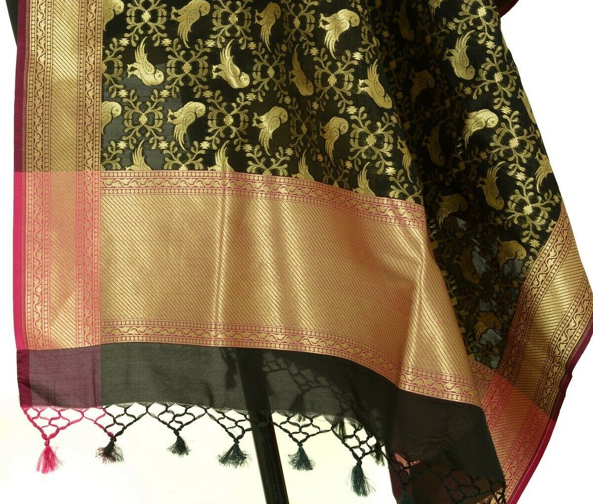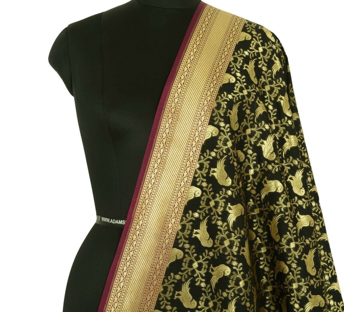 Black Banarasi Dupatta Birds Woven Zari Brocade Indian Long Stole Wrap Scarves