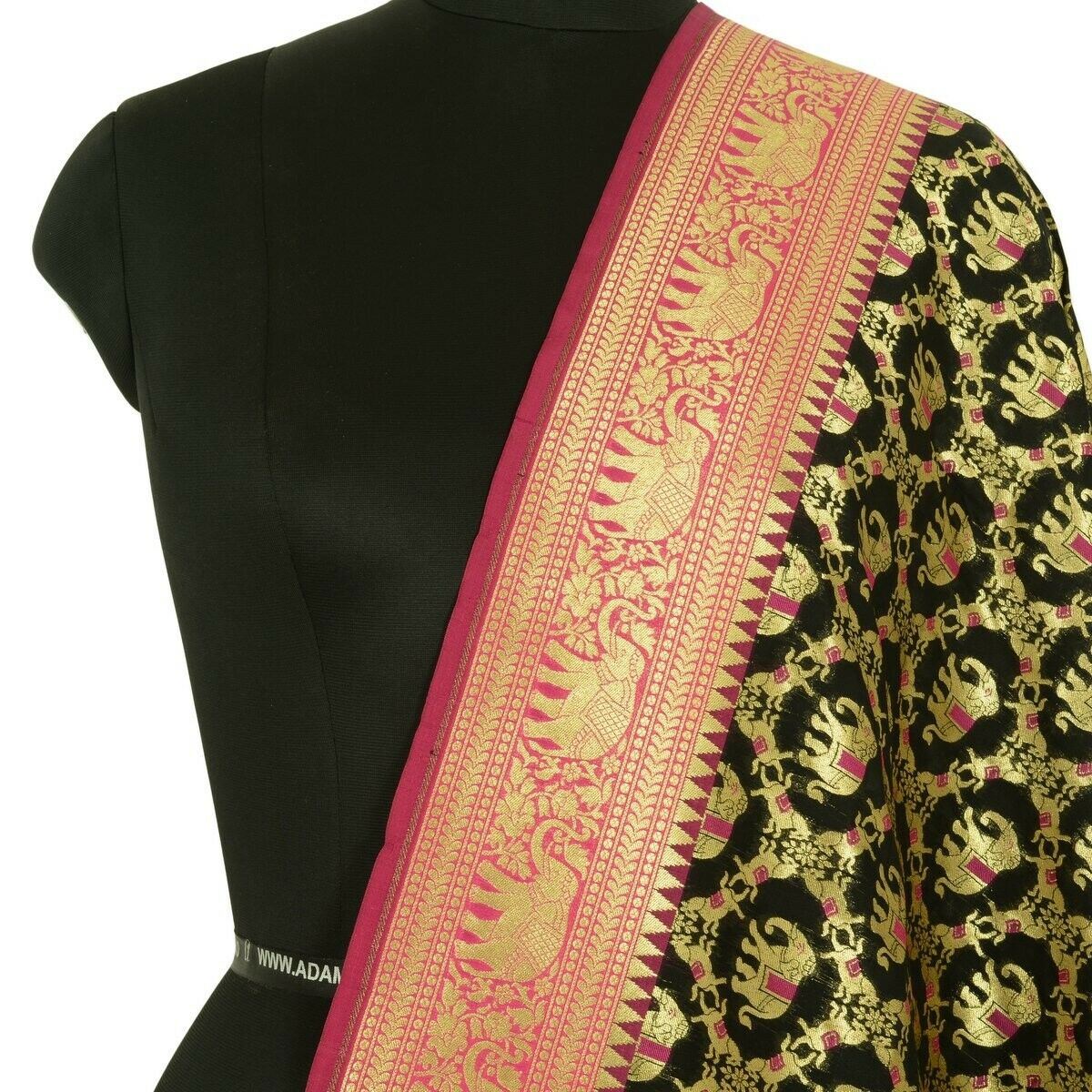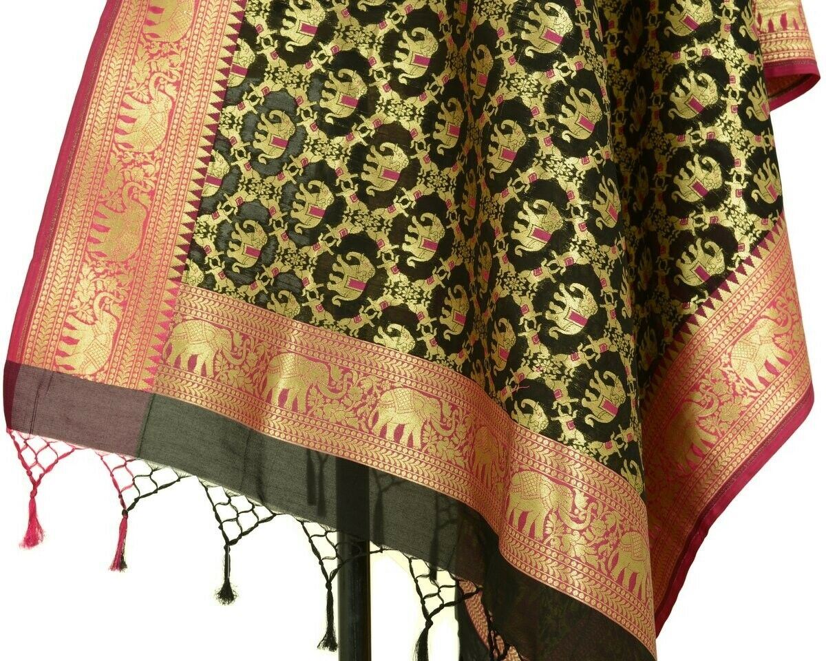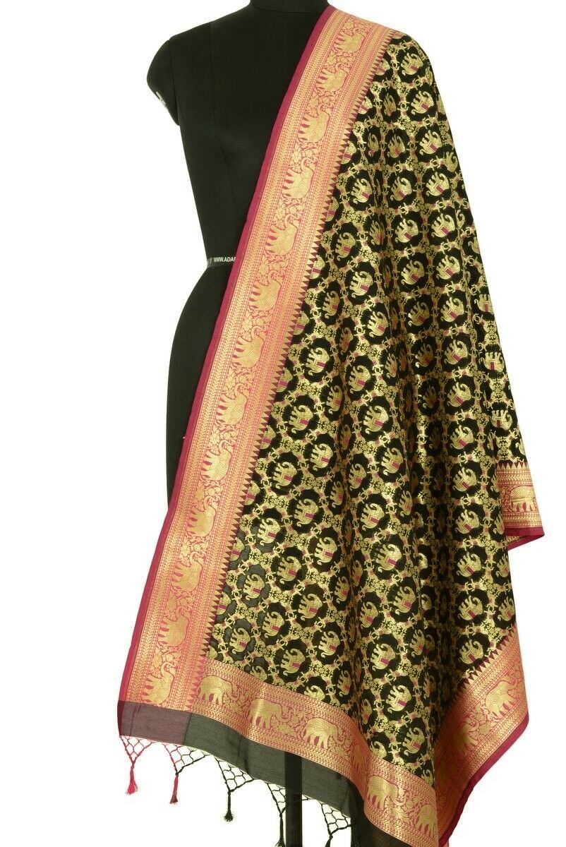 Black Banarasi Dupatta Elephant & Horse Woven Zari Brocade India Long Stole Wrap