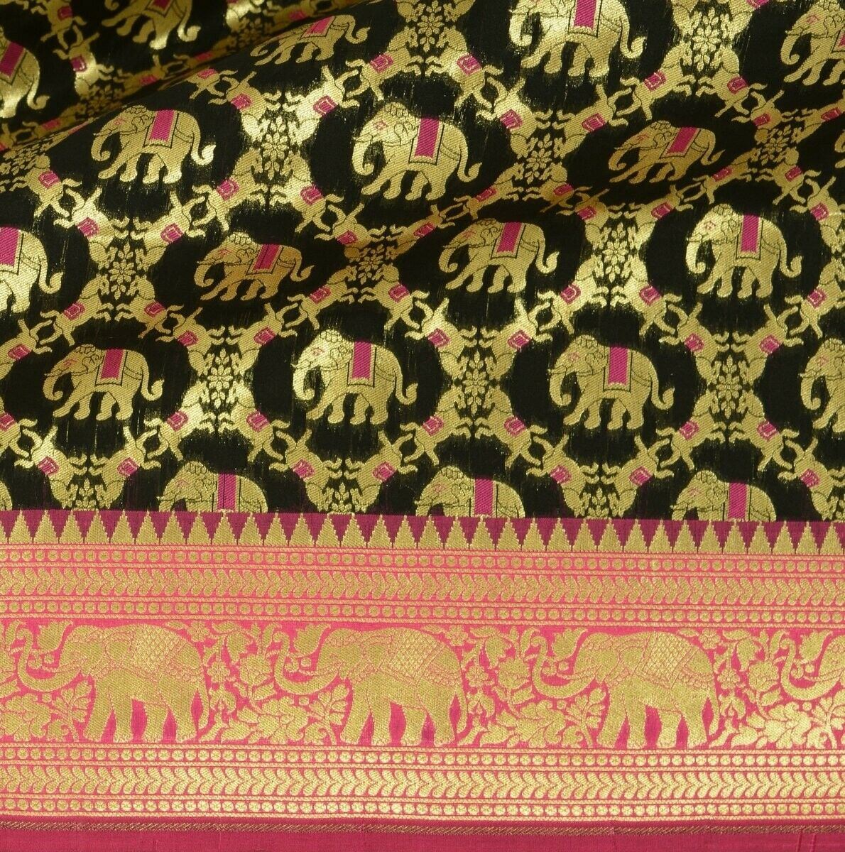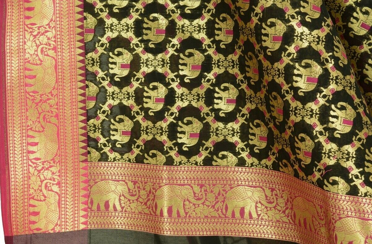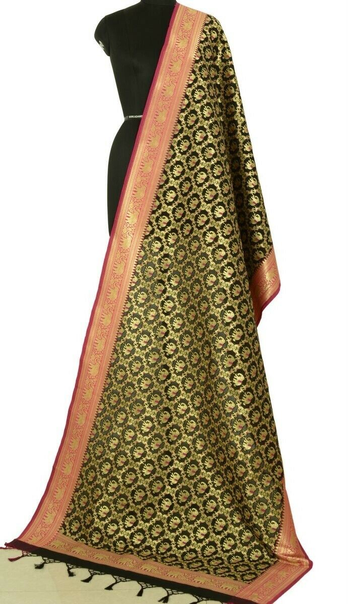Black Banarasi Dupatta Elephant & Horse Woven Zari Brocade India Long Stole Wrap