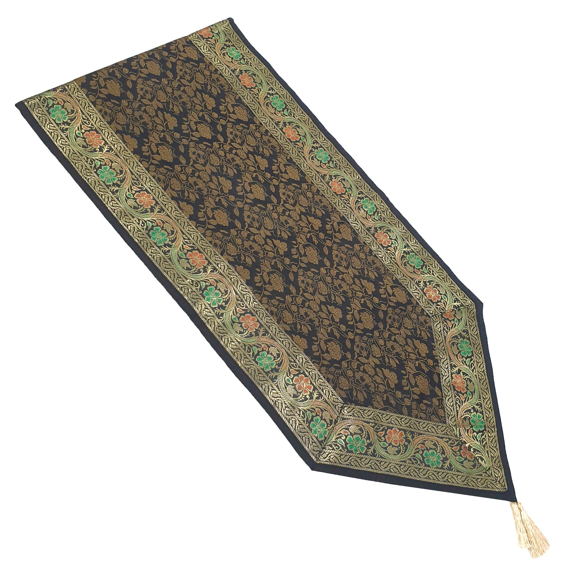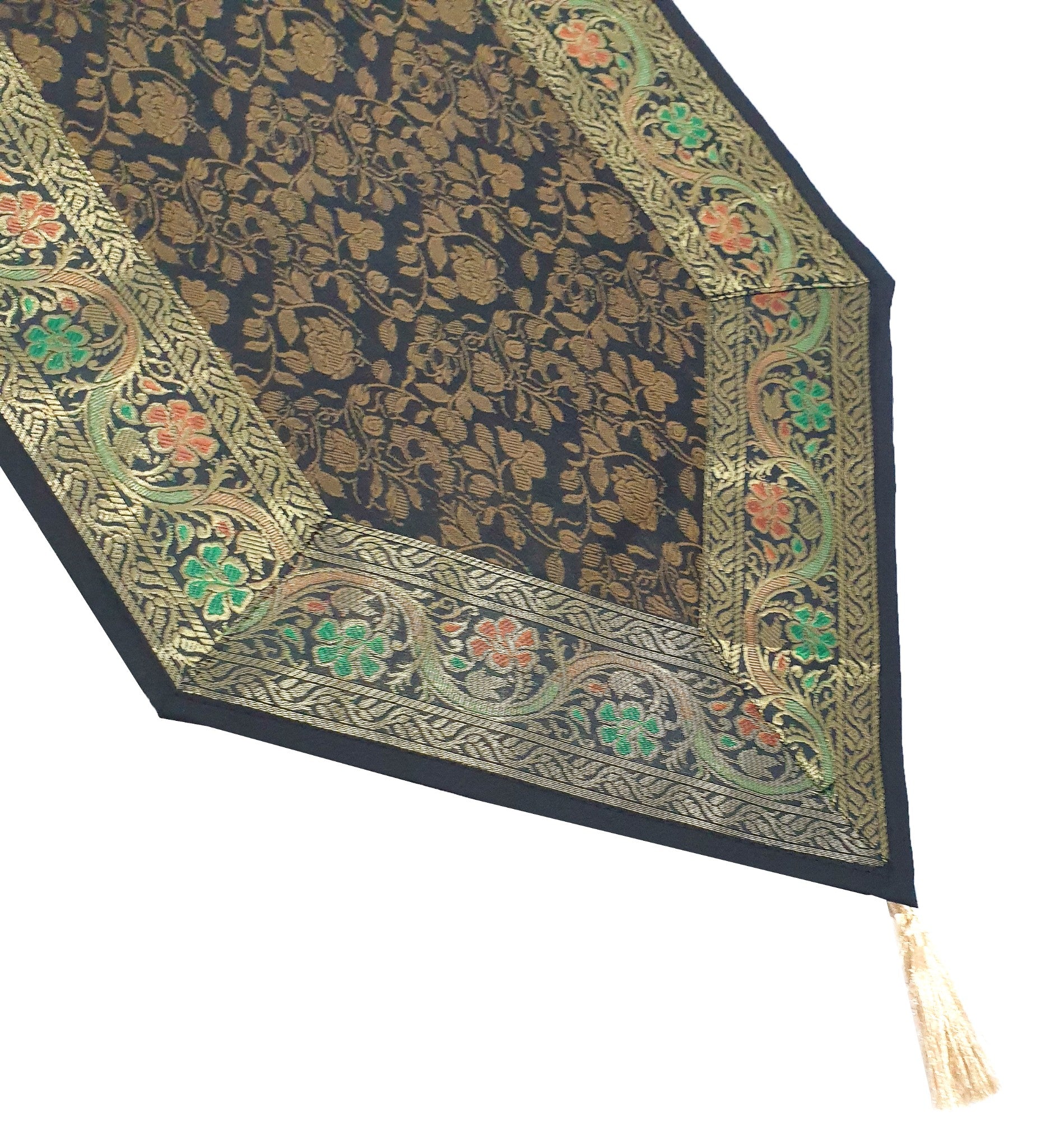 Black Banarasi Table Runner Silk Brocade Floral Dining Decor Indian Gift Cloth