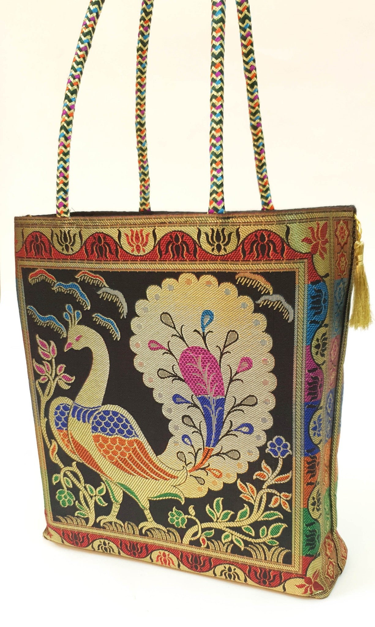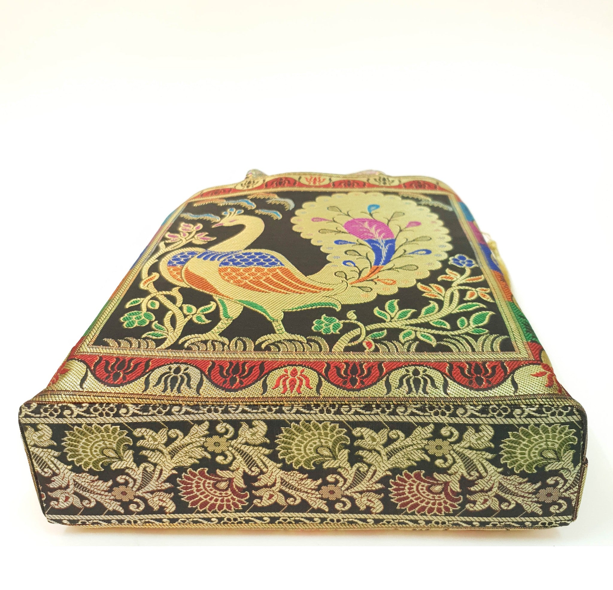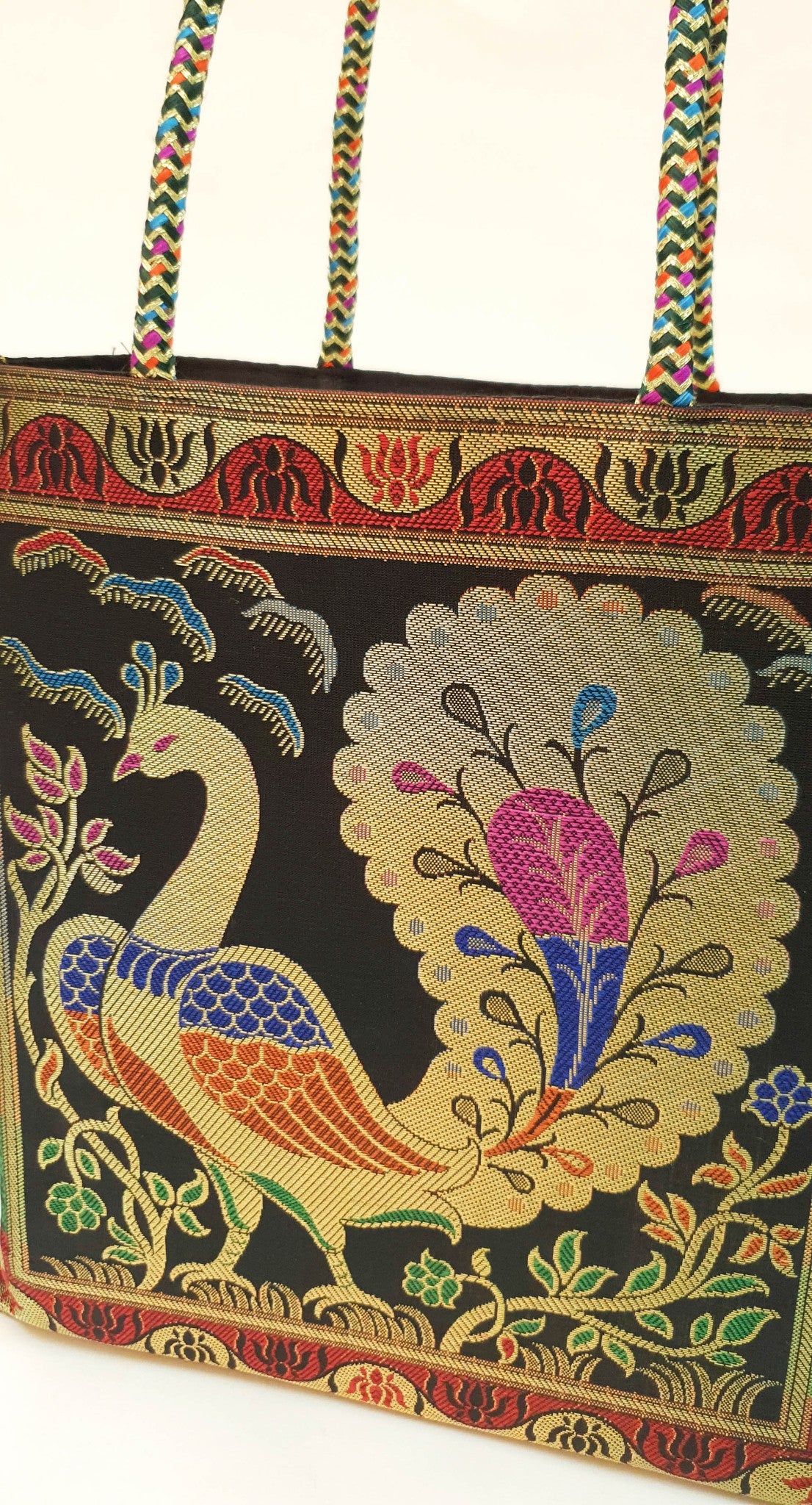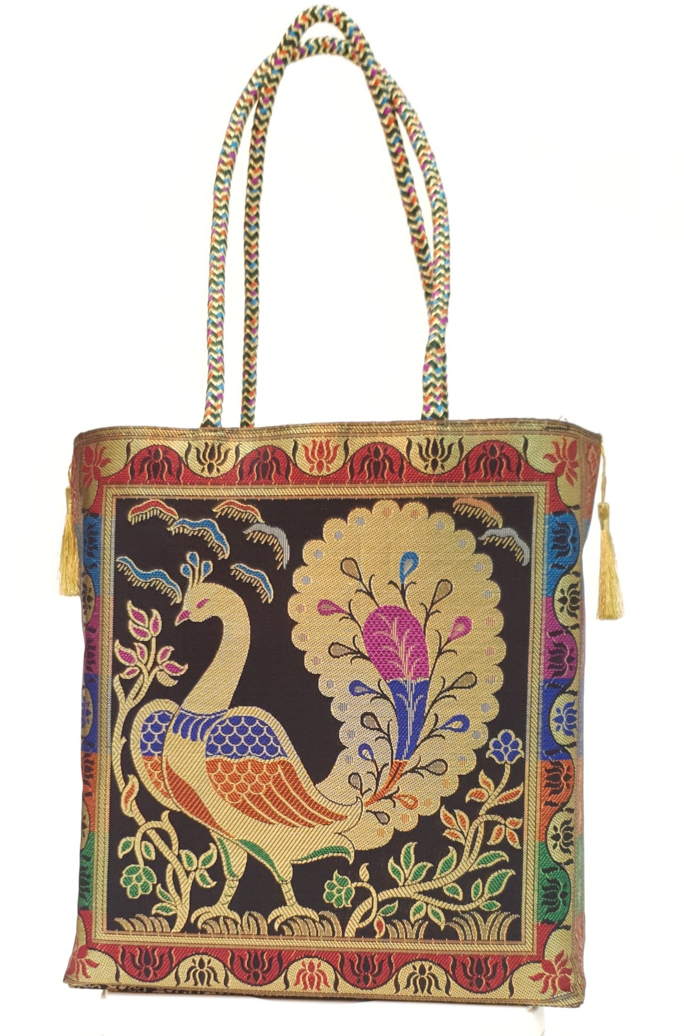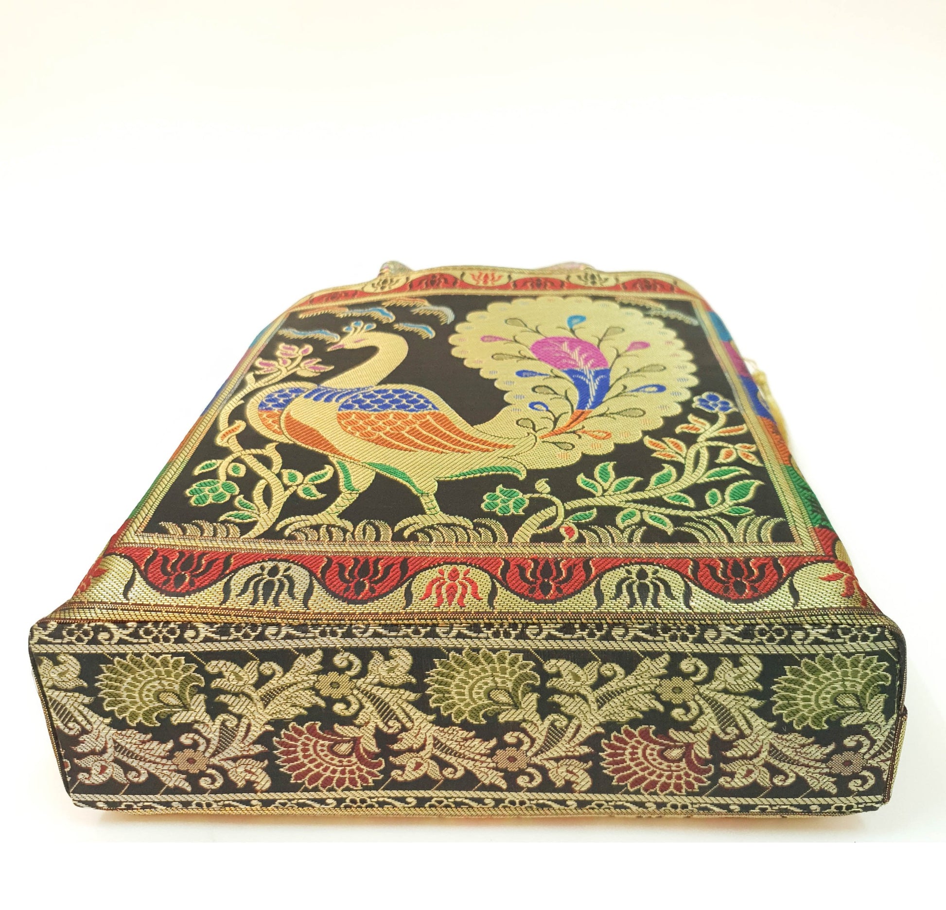 Black Handbag Indian Ethnic Peacock Woven Zari Brocade Fabric Shoulder Hand Bag