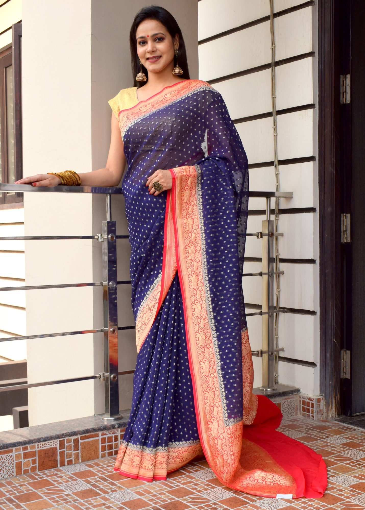 Banarasi Vastra Presents 100% Pure Khaddi Georgette Silk Banarasi Handloom Saree in Blackish Blue Color with Zari Woven Small Motifs Pattern in the center part of the saree with Red Color Elephant & Deer Woven Contrast Zari Border & Rich Pallu.