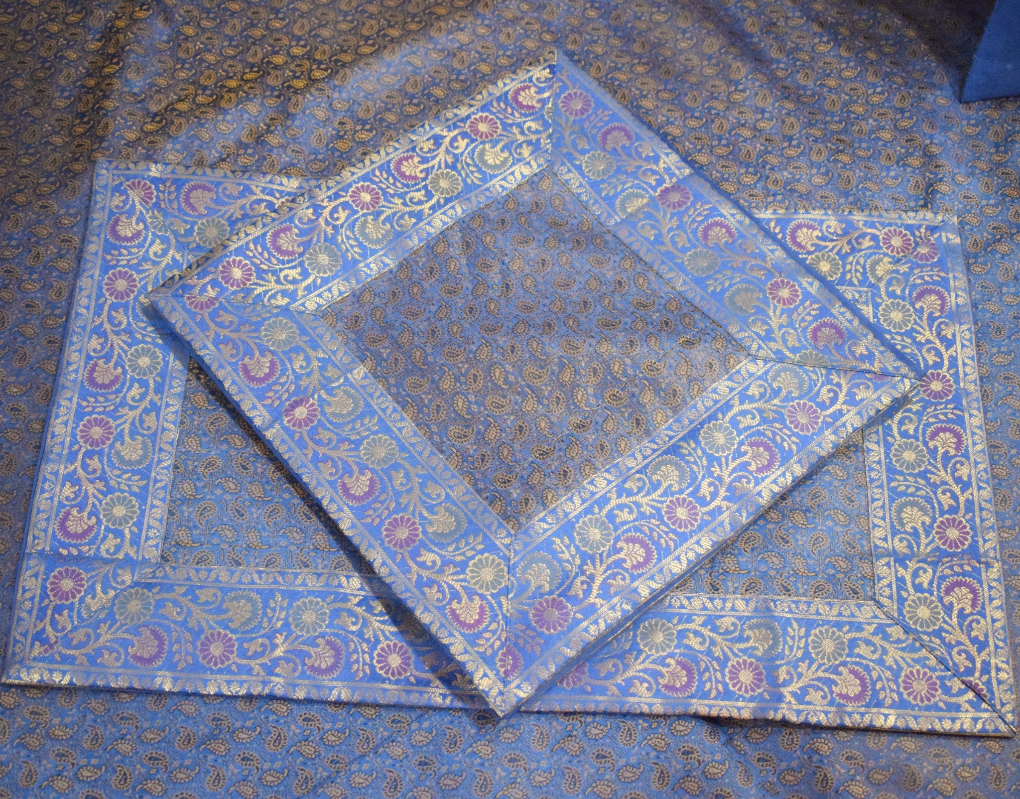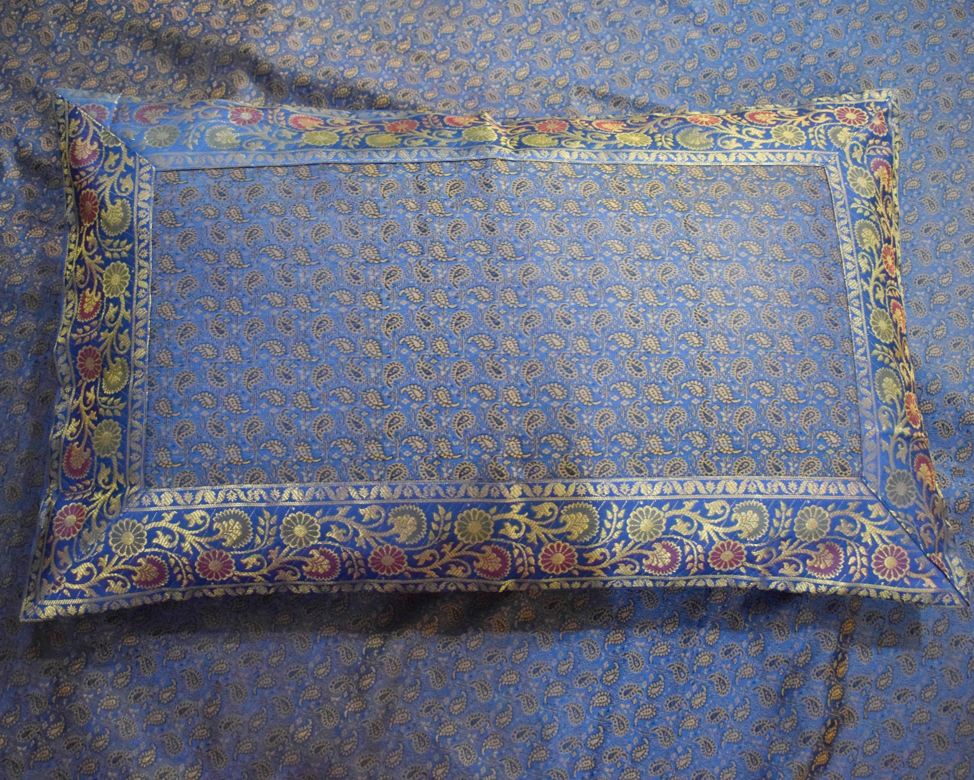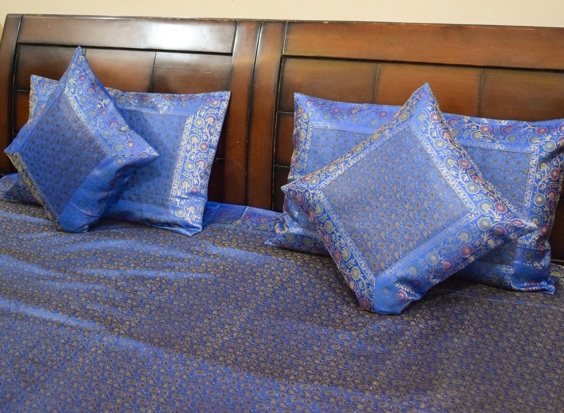 Blue Banarasi Bed, Cushion & Pillow Cover Set Indian Silk & Woven Zari Brocade