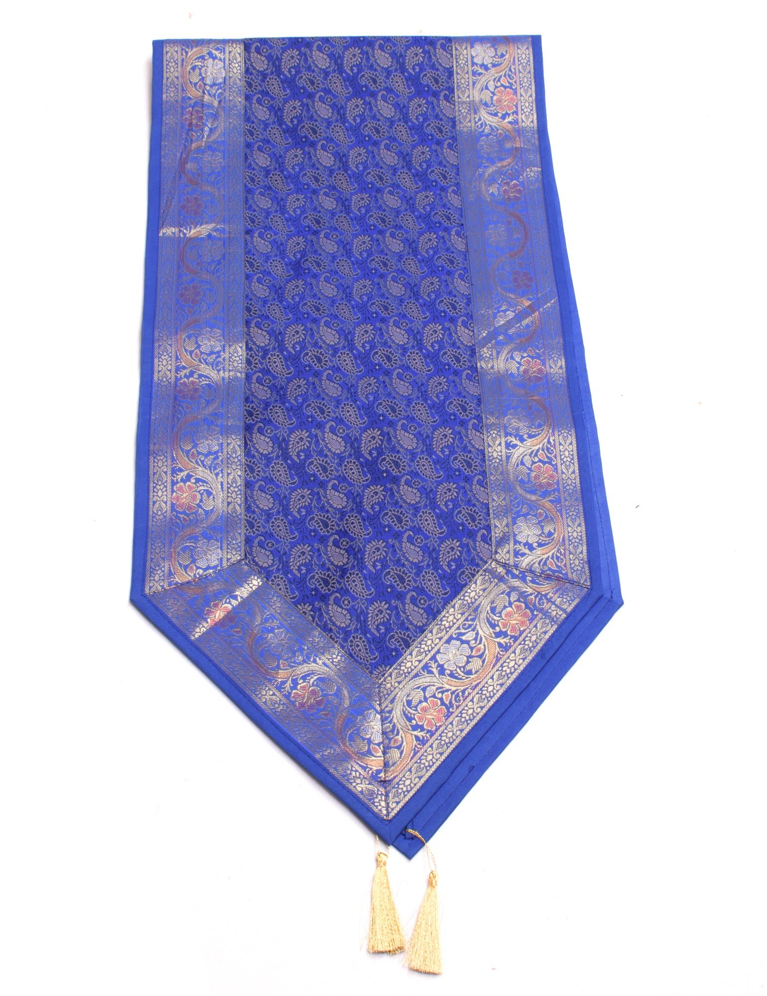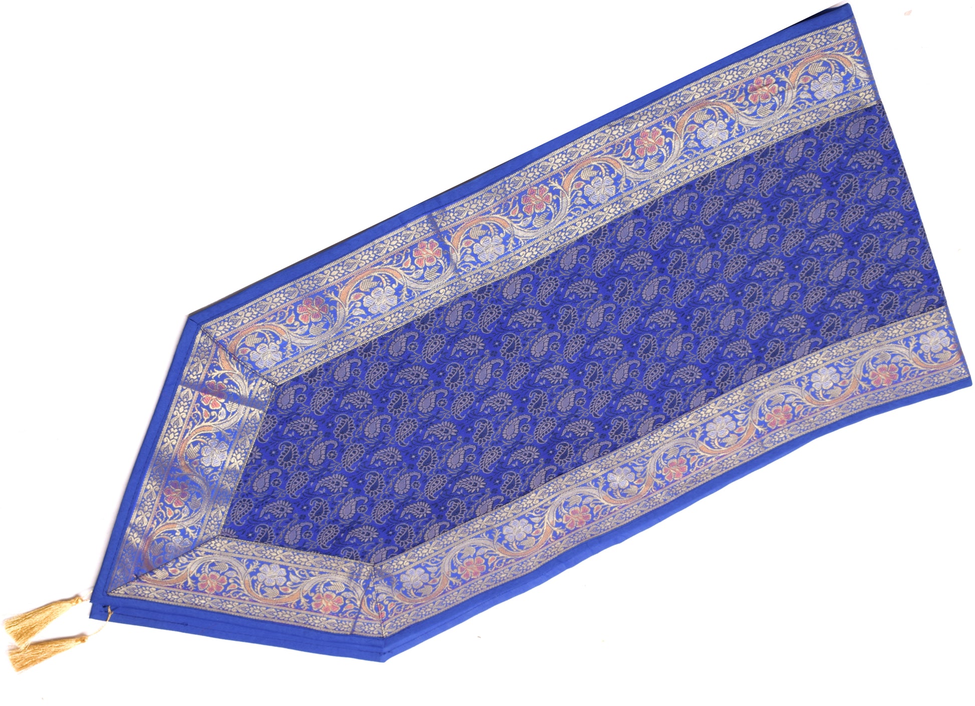Blue Table Runner Dining Decor Indian Banarasi Silk Brocade Paisley Gift Cloth