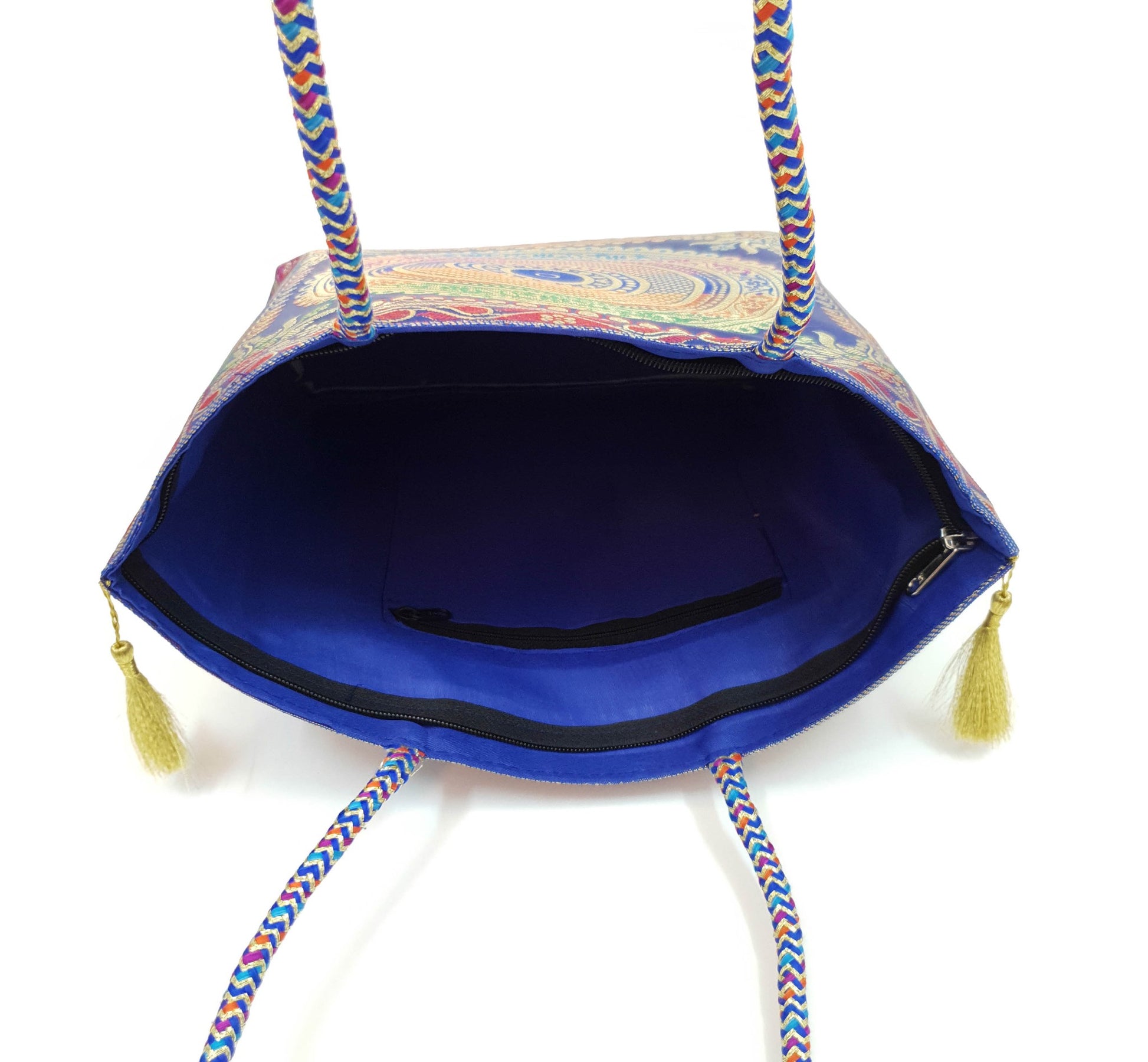 Matching color Back lining fabric is used inside the bag with one zip based compartment inside the bag and one main large zip on top of the Bag .. There are two Zari Tassels used on both end of the main Zip (As shown in the images).