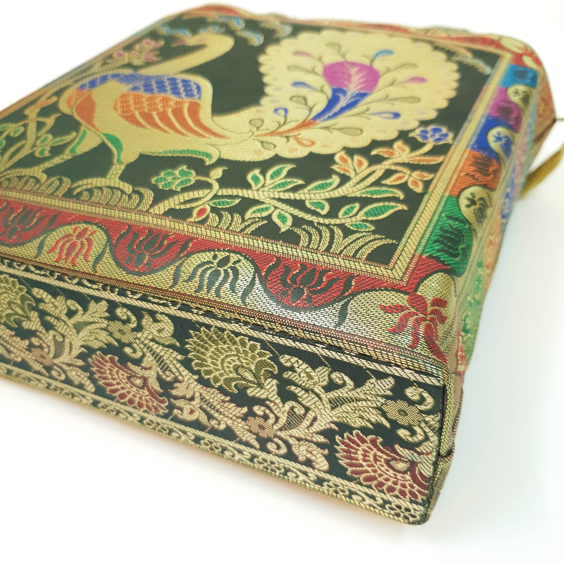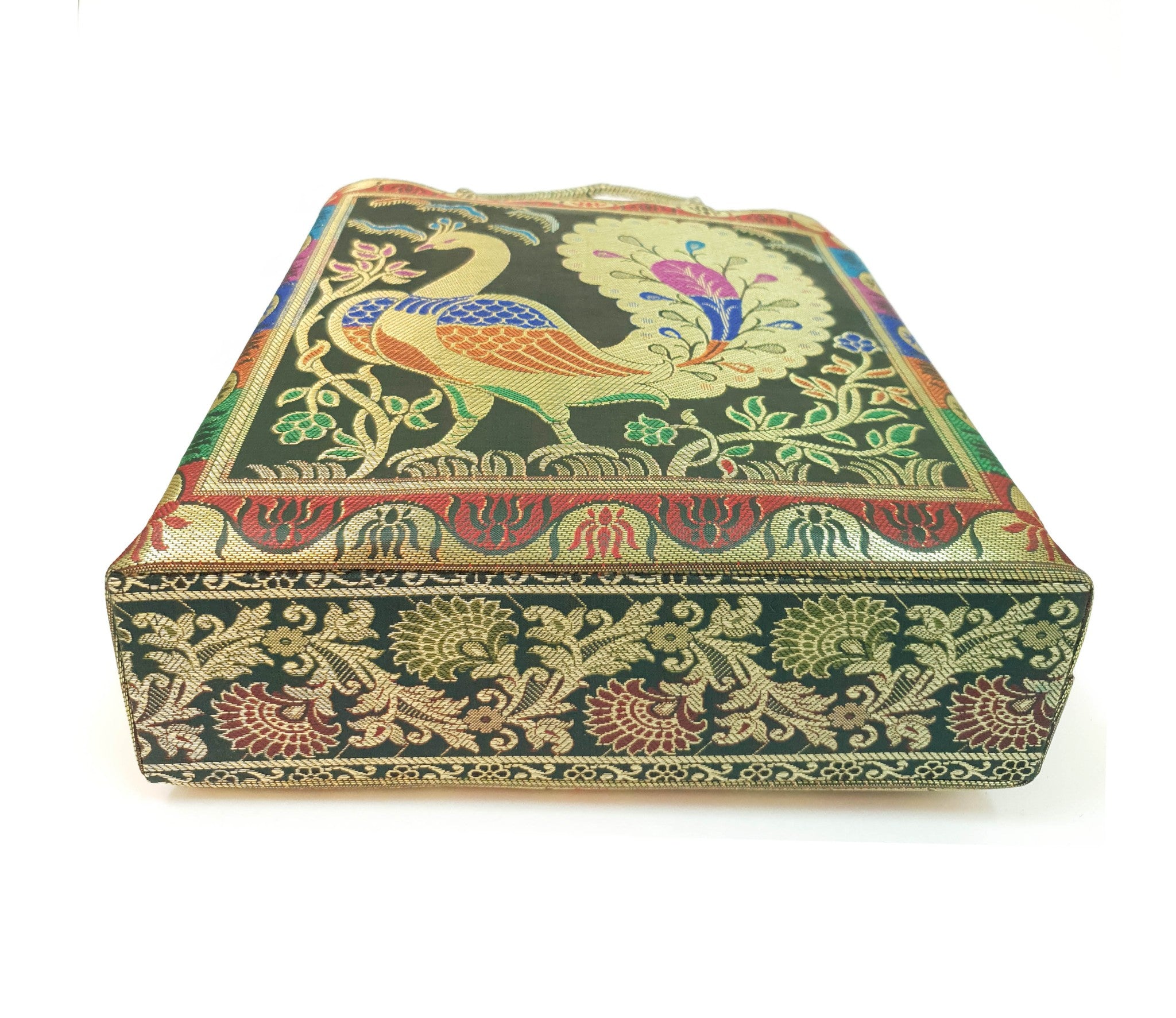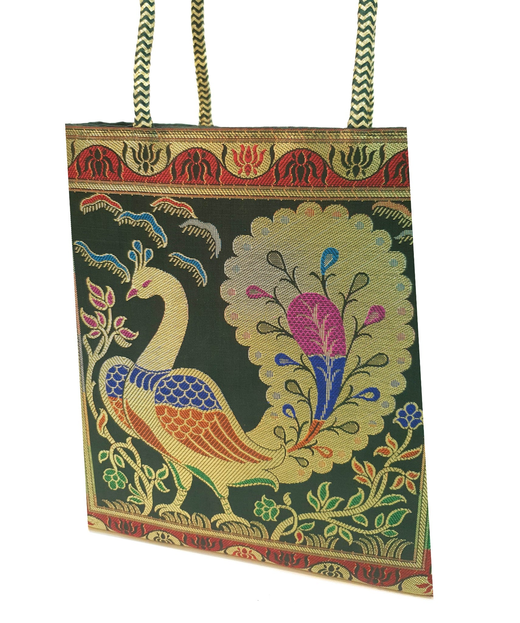 Bottle Green Handbag Ethnic Peacock Woven Zari Brocade Fabric Shoulder Hand Bag