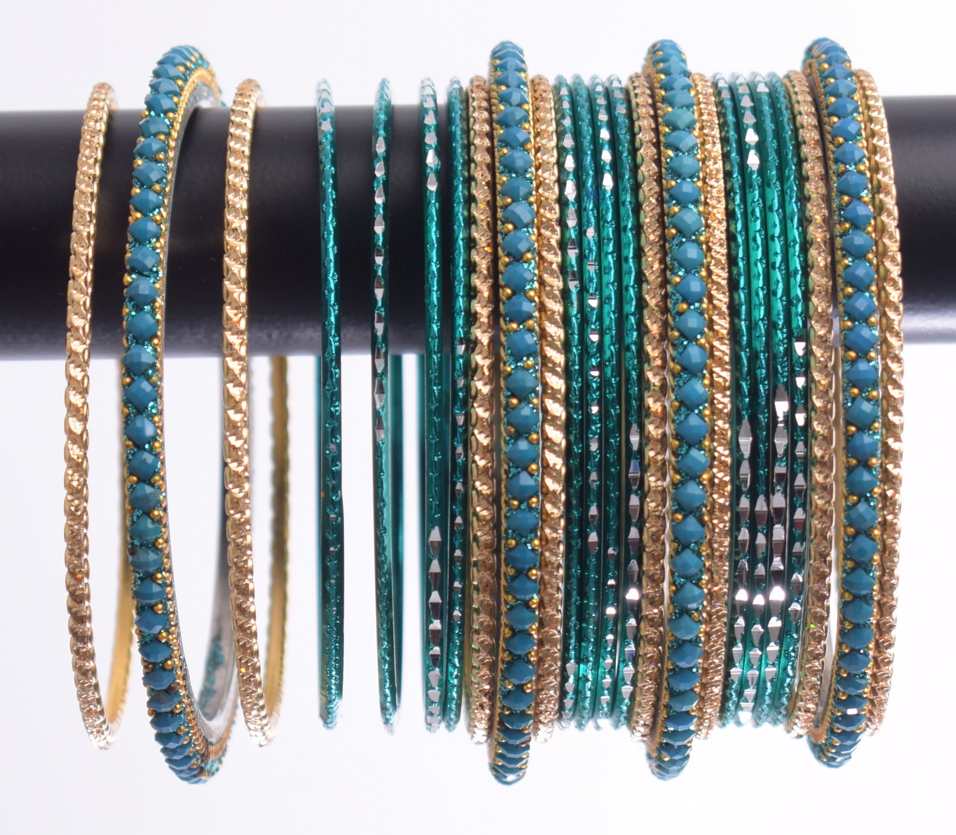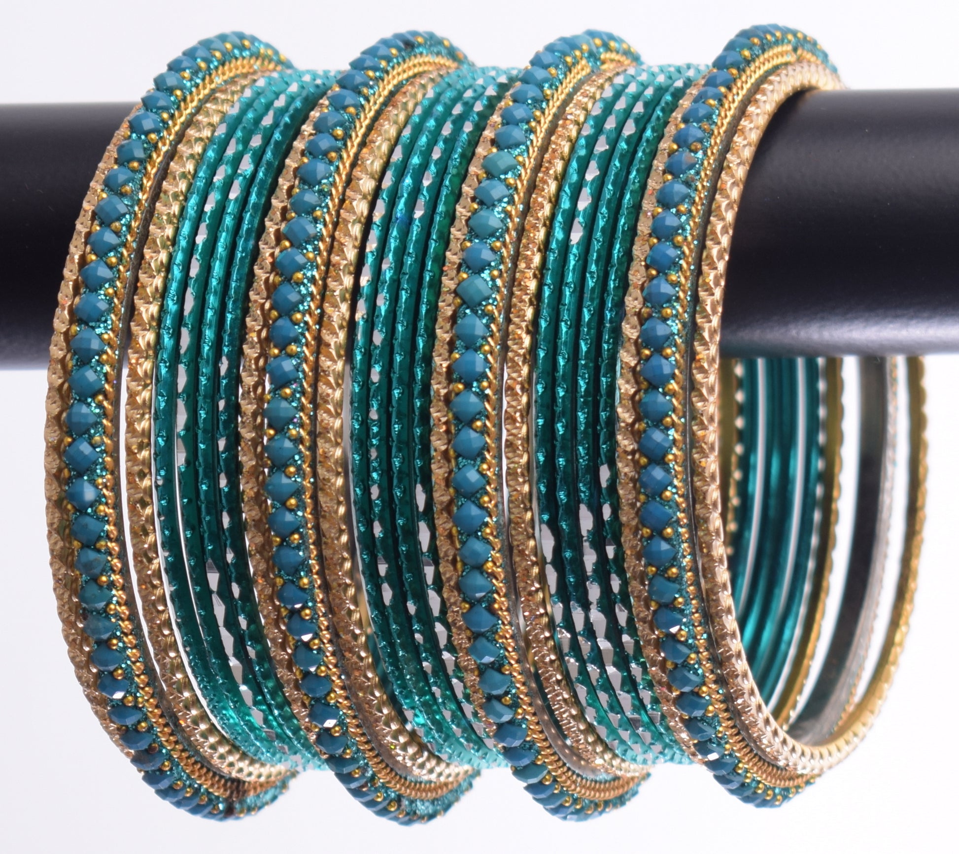 Banarasi Vastra Presents Costume Matching Metal Bangles Set of 24 Individual Aluminium Bangles which includes 4 Piece Beaded Kada in Green Color.
