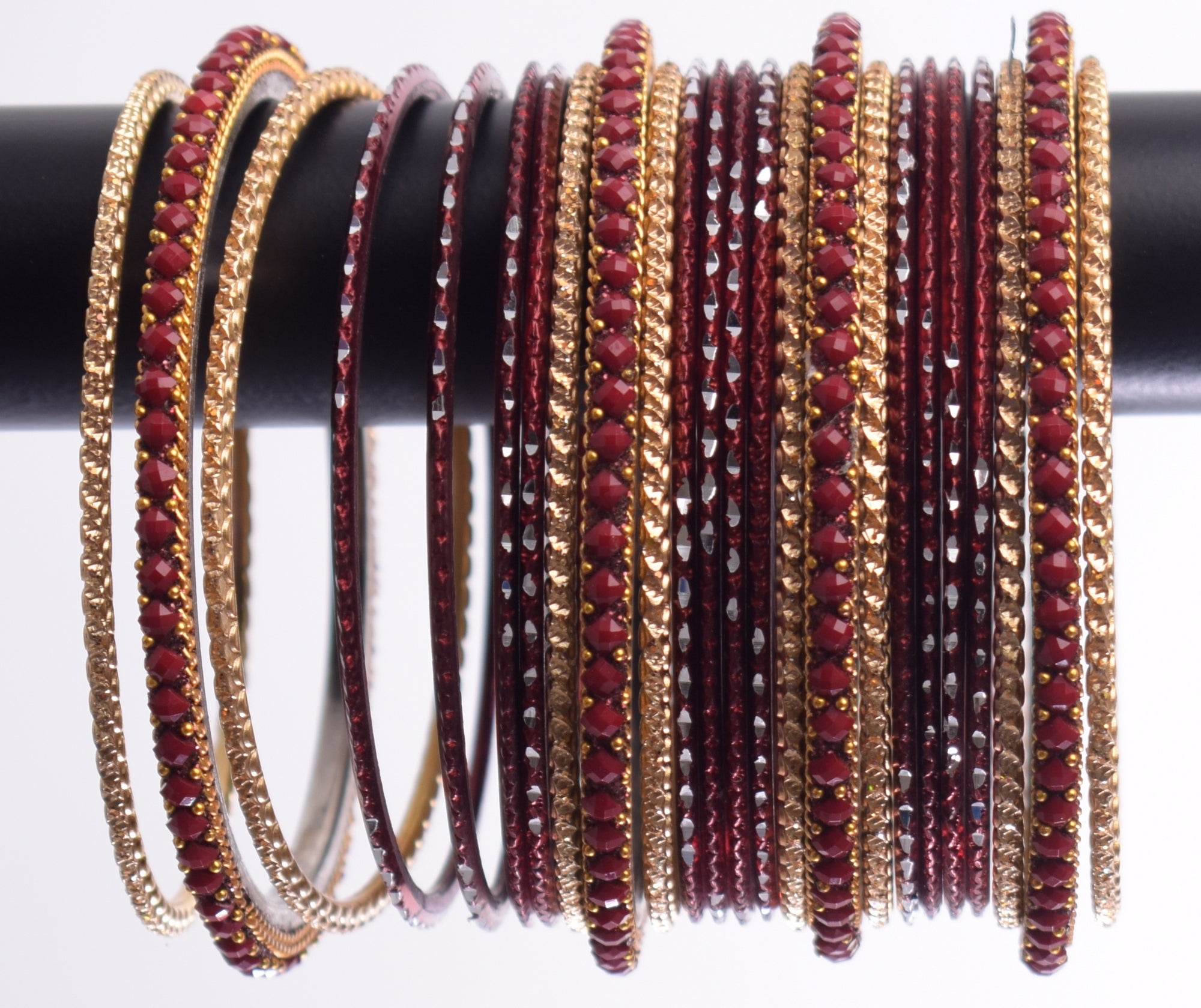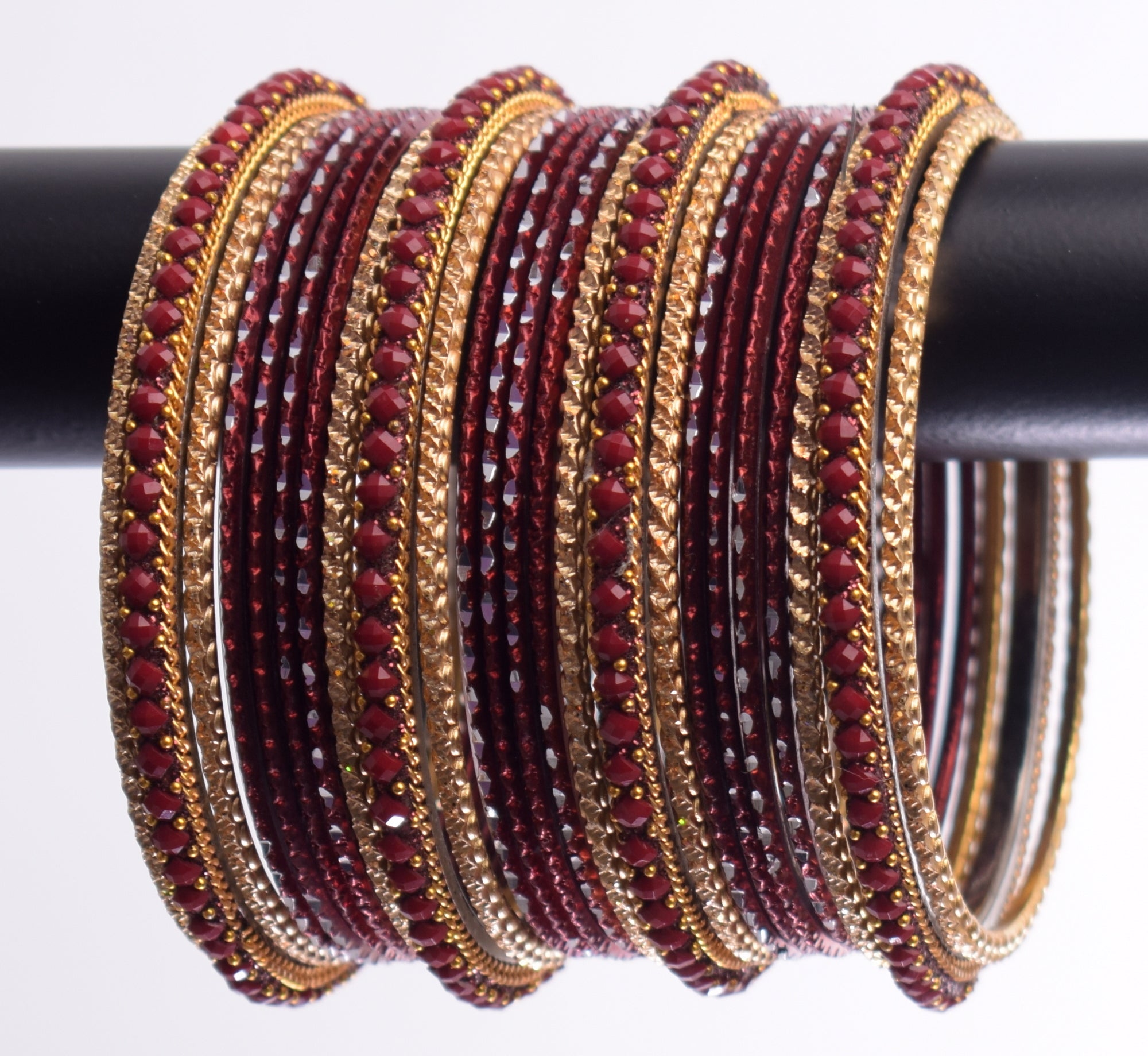Banarasi Vastra Presents Costume Matching Metal Bangles Set of 24 Individual Aluminium Bangles which includes 4 Piece Beaded Kada in Maroon Color.
