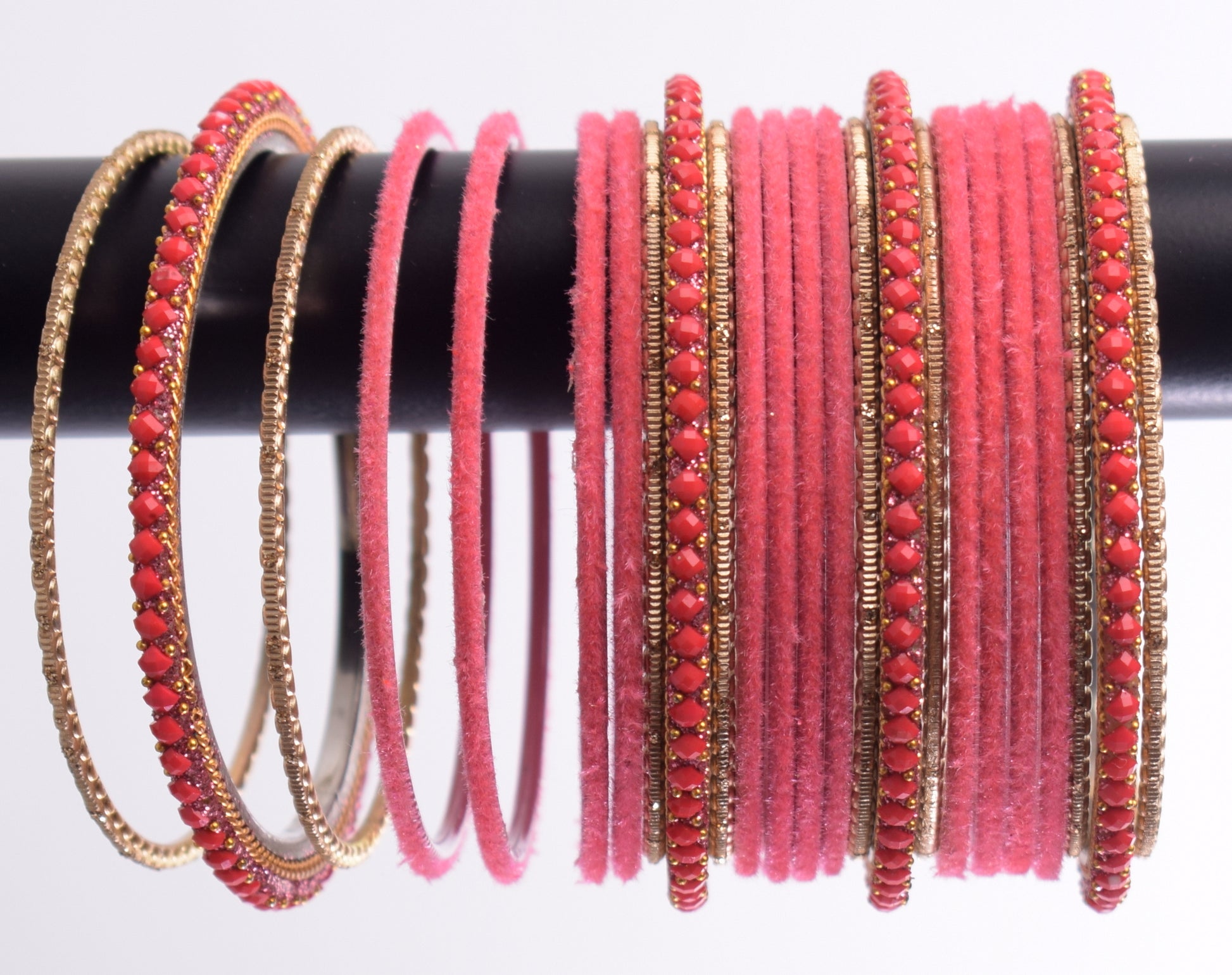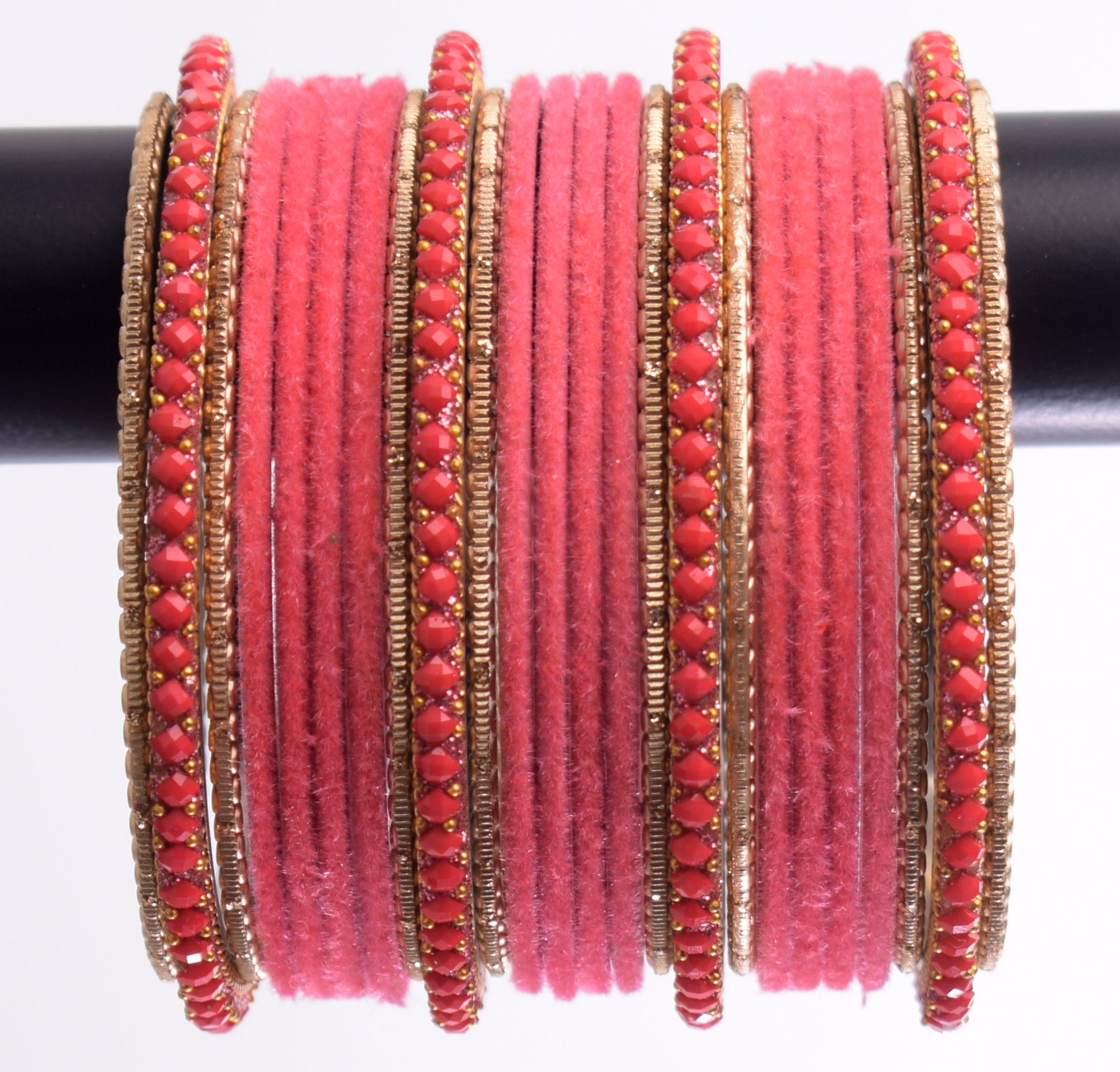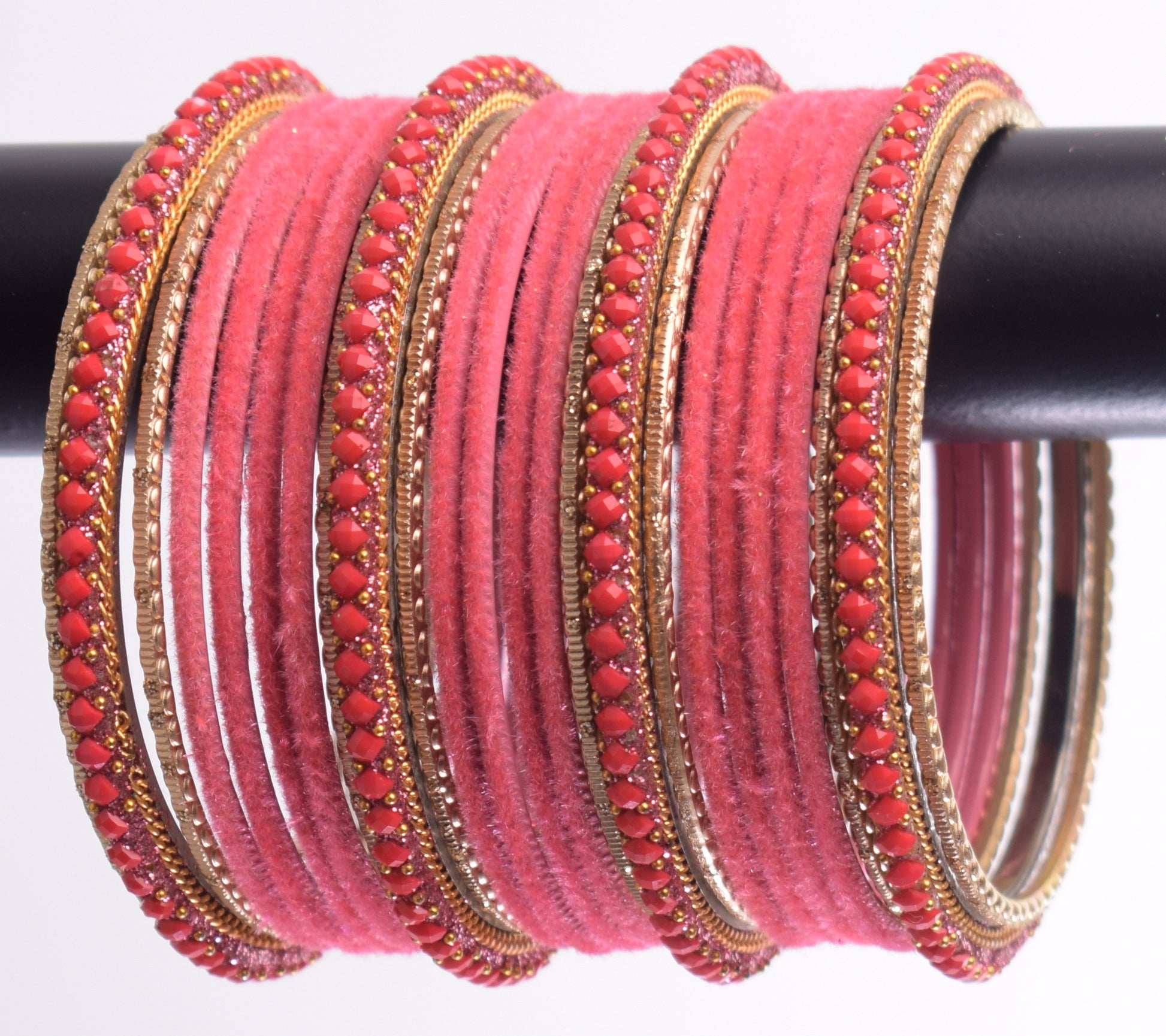 Banarasi Vastra Presents Costume Matching Metal Bangles Set of 24 Individual Velvet Bangles which includes 4 Piece Beaded Kada in Pink Color.