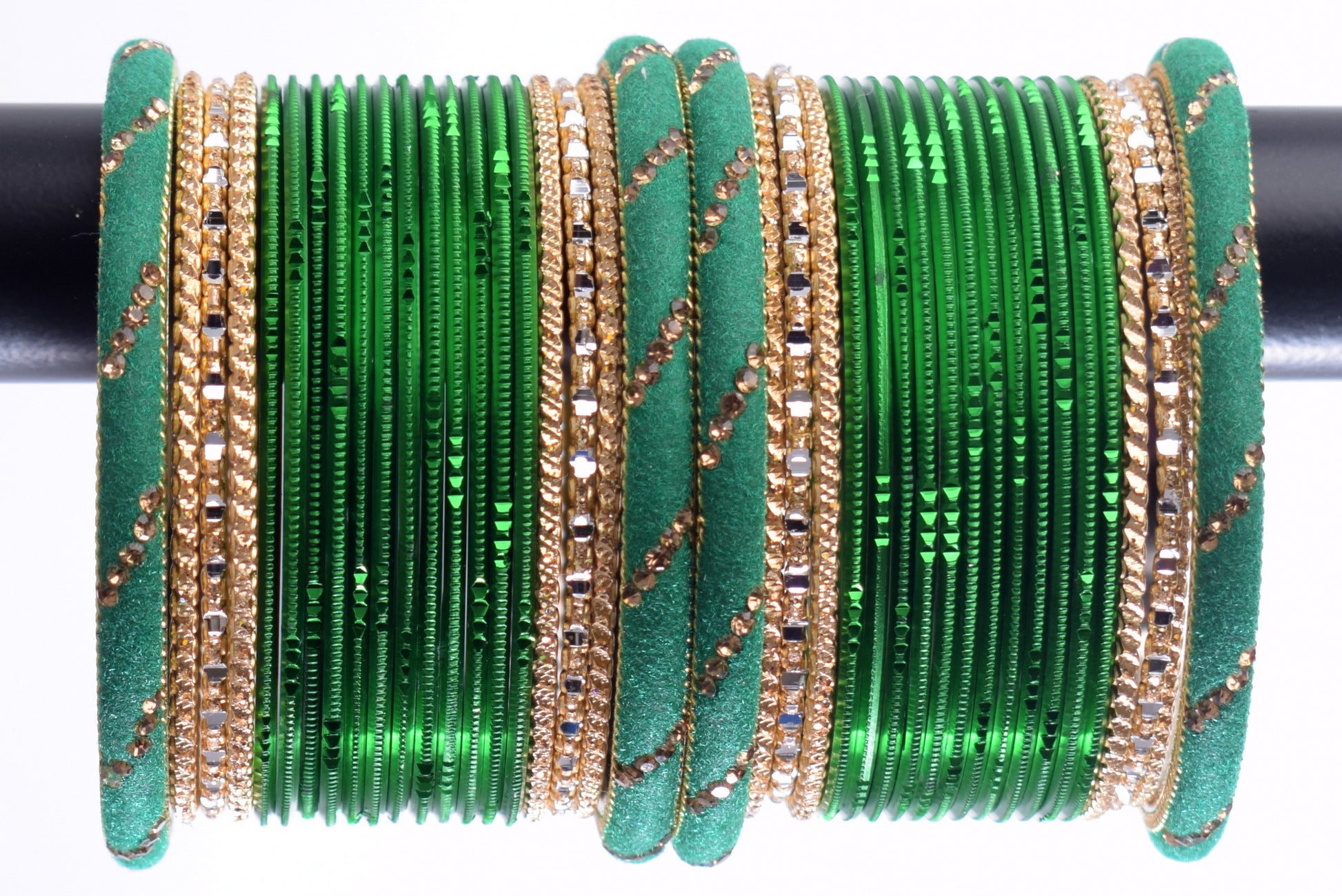 Banarasi Vastra Presents Costume Matching Metal Bangles Set of 40 Individual Bangles which includes 4 Piece stone work Velvet Kada in Green Color.