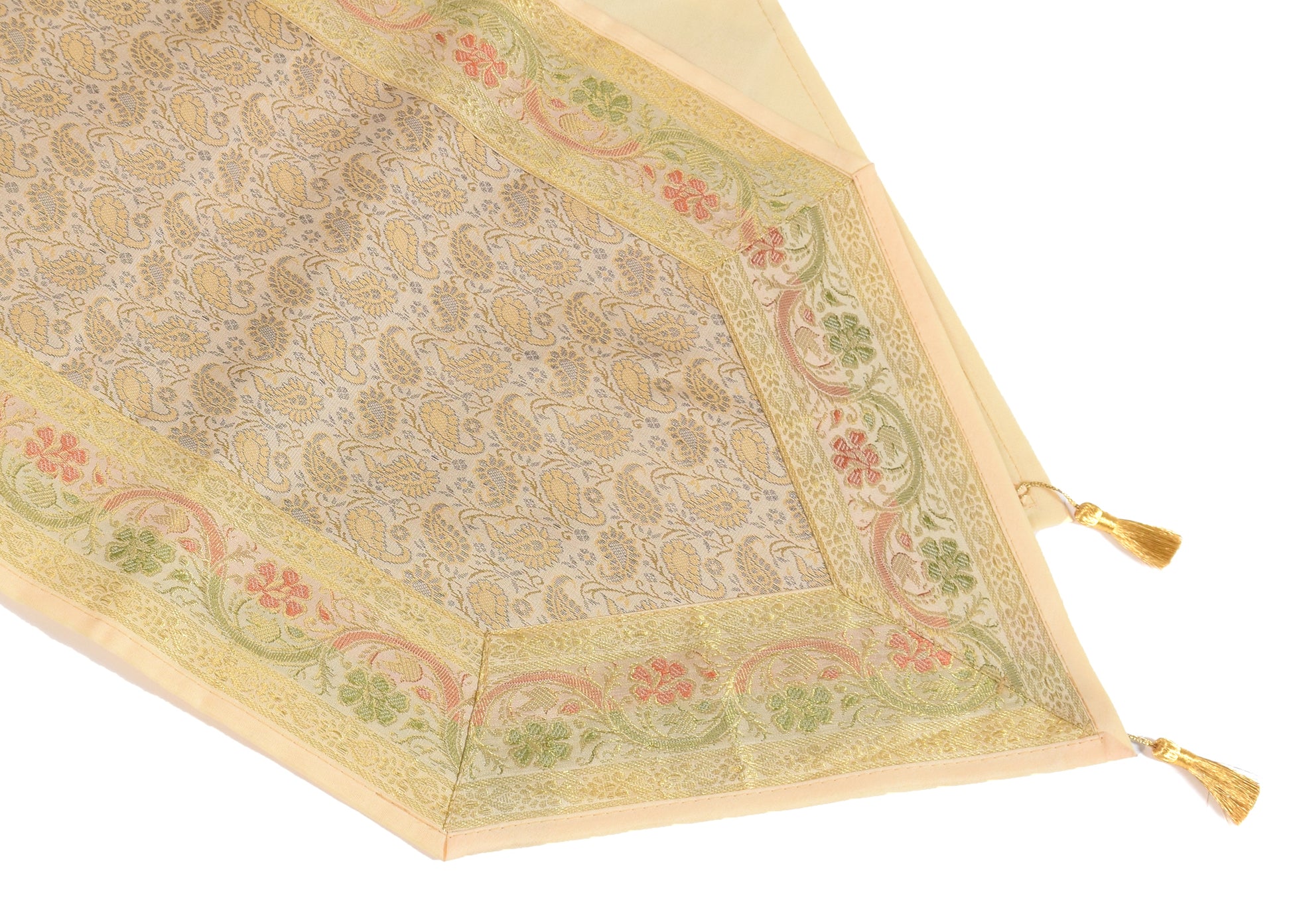 Banarasi Vastra Presents 14 Inch x 60 Inch Woven Golden Zari Brocade Banarasi Silk Table Runner Woven Paisley Pattern Tanchoi Fabric in the center Part of the cover with all Side Floral Zari Woven Border with 2 side Golden Zari Tassel. this Runner comes with Matching color Back lining fabric.