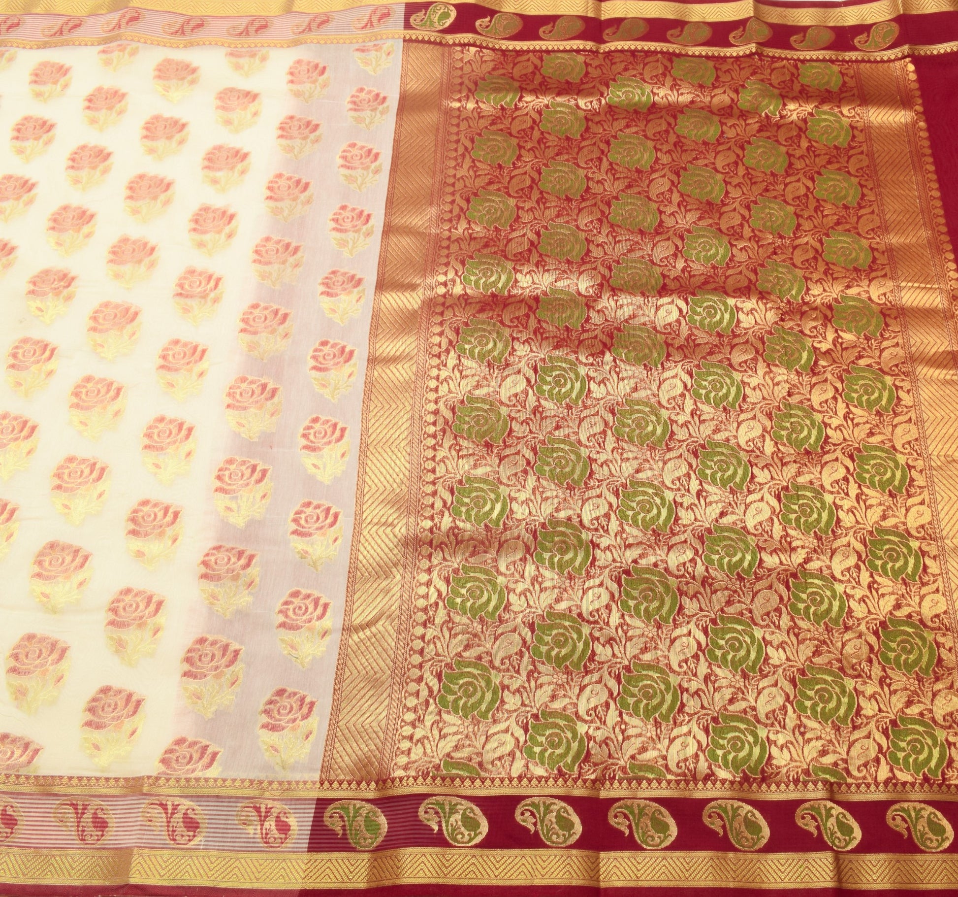 A graceful blend of cream and maroon, beautifully detailed with zari—designed to bring out the traditional elegance in you.